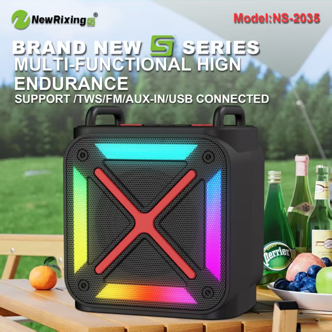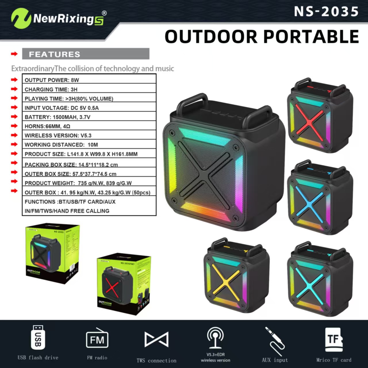 功能:蓝牙/免提通话/支持USB、TF卡、AUX音频播放/循环充电/TWS