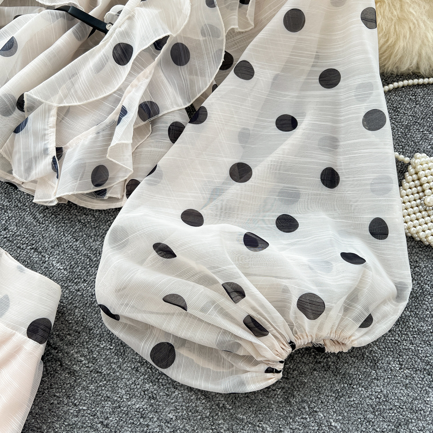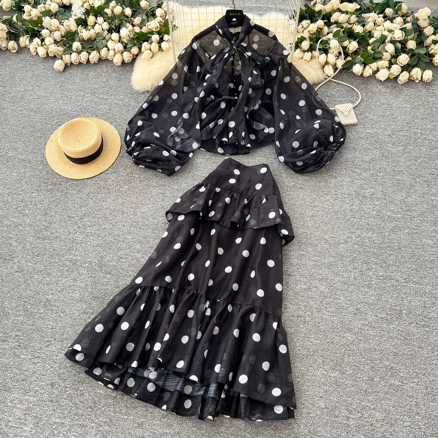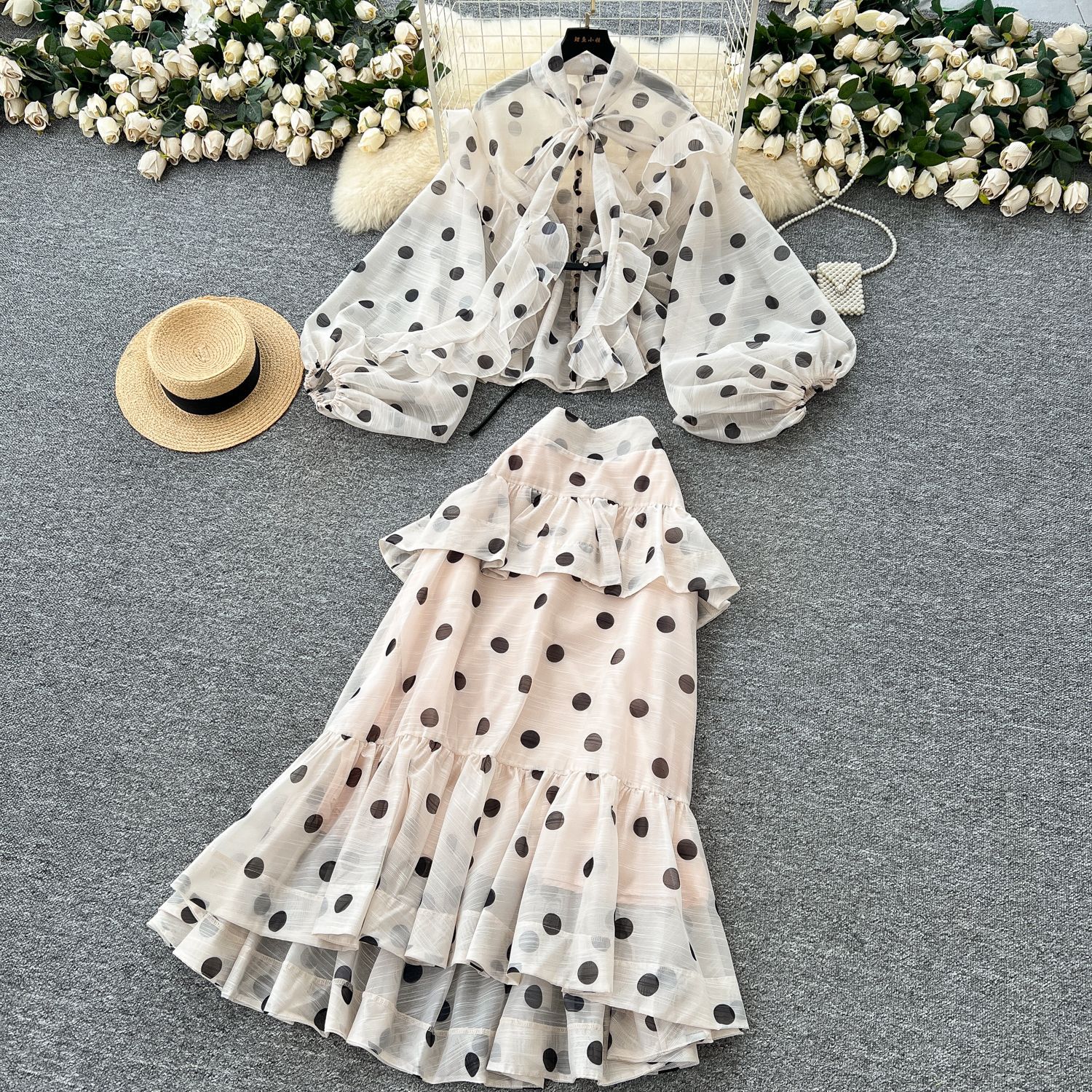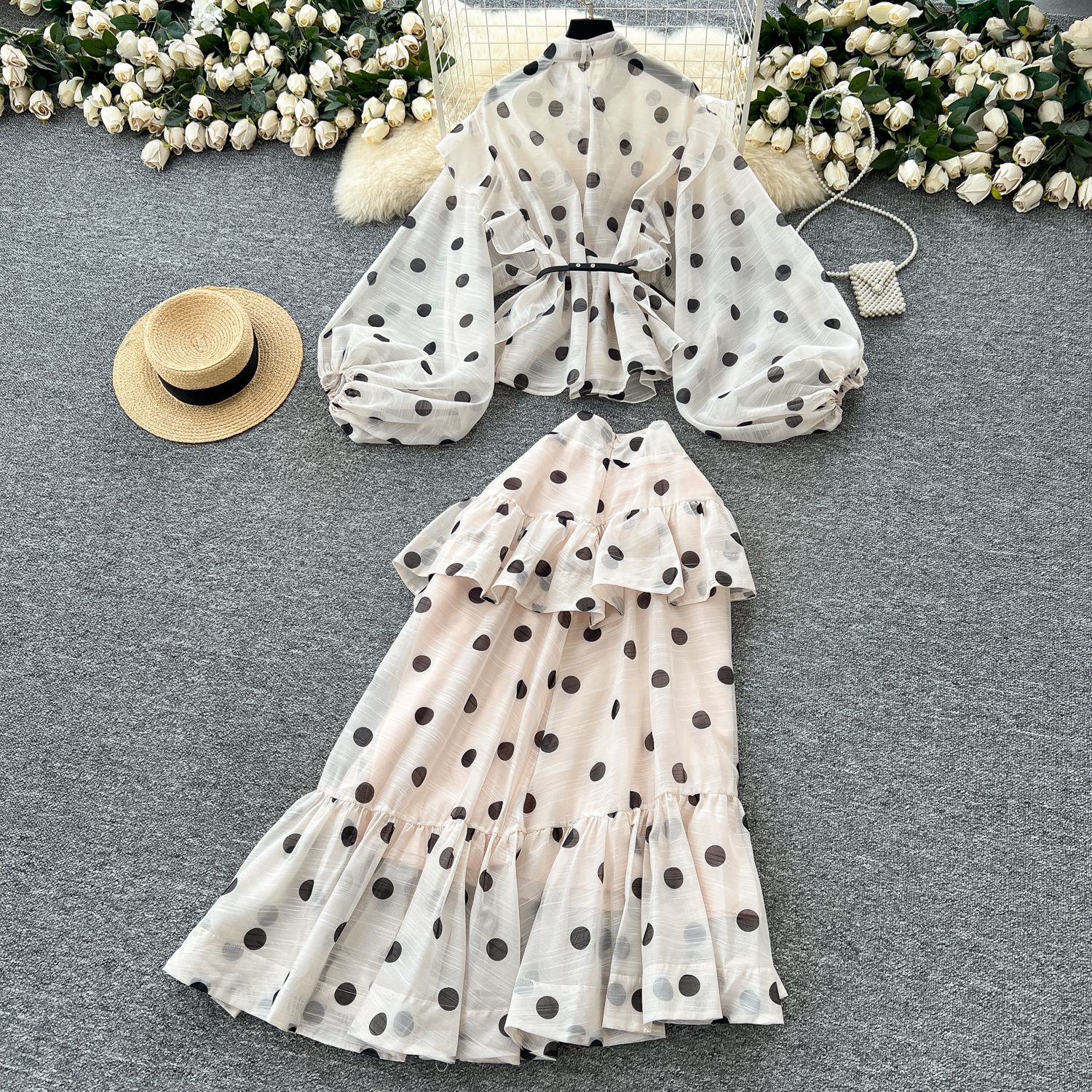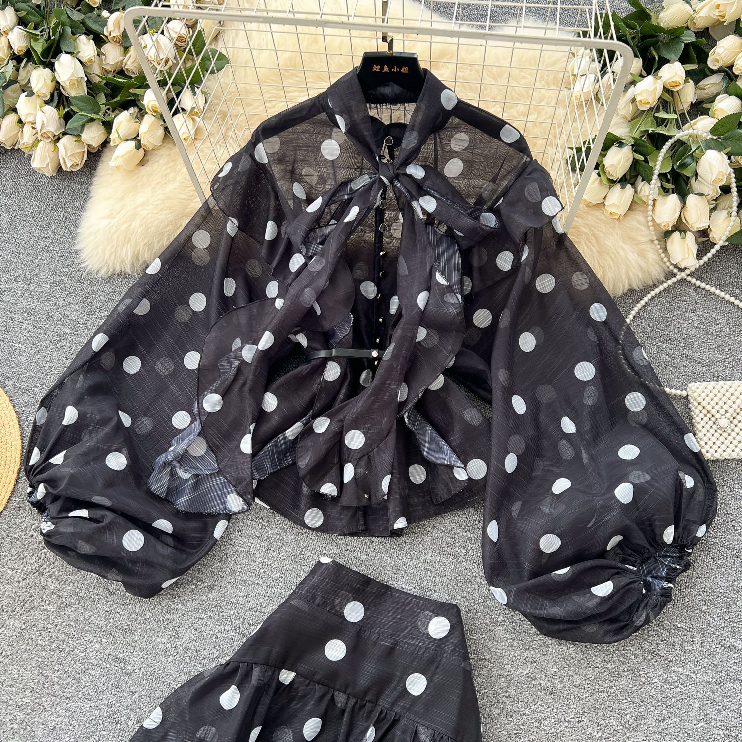 프렌치 스타일 여성 하이엔드 스트랩 웨이스트 랜턴 슬리브 폴카 도트 셔츠 여성 하이웨이스트 러플 피쉬테일 스커트