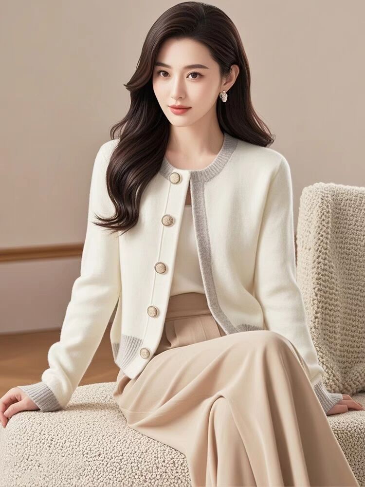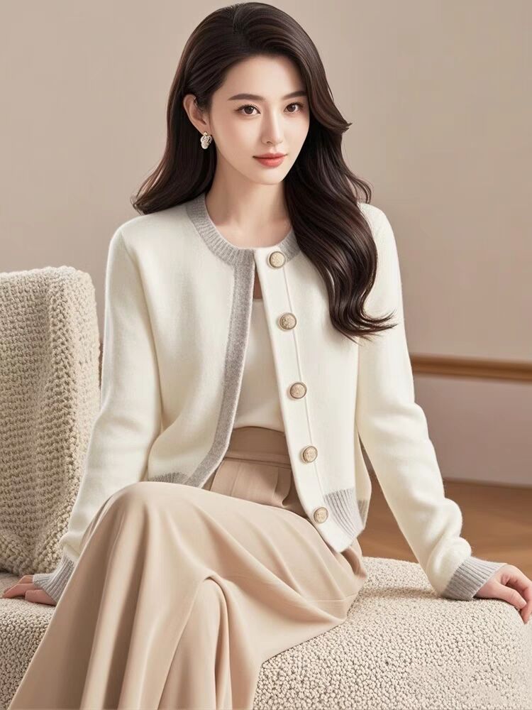 2025 Xiaoxiangfeng 컬러 블록 니트 스웨터 재킷 여성의 새로운 한국 스타일 외국 스타일 연령 감소 부드러운 밀랍 카디건 탑