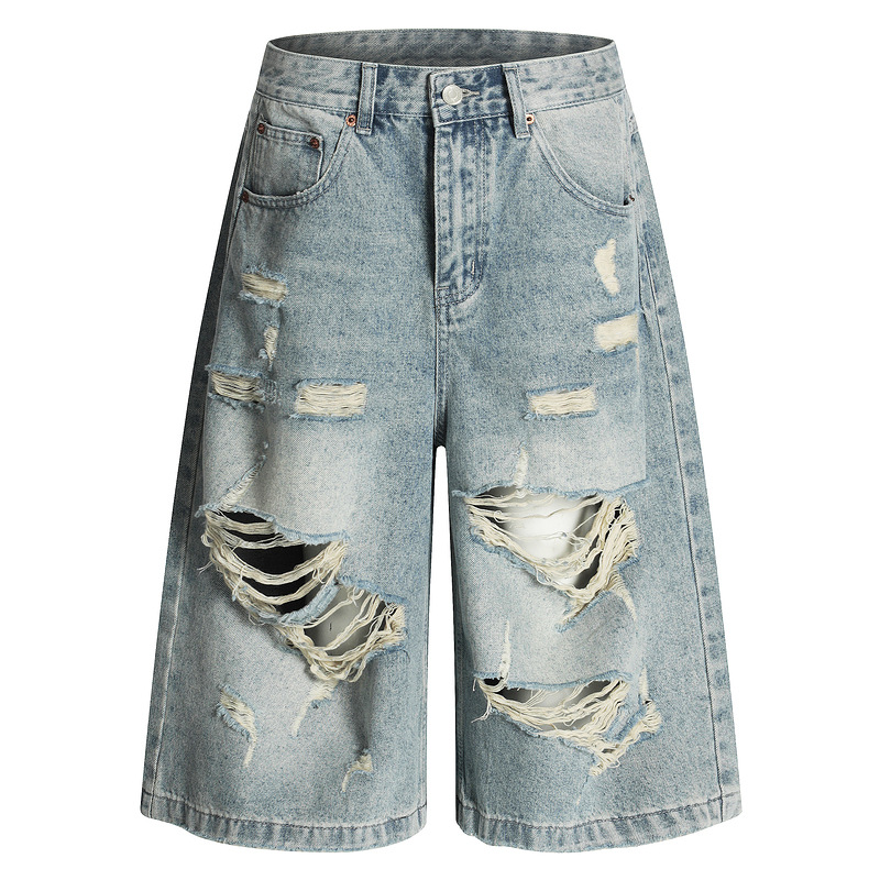 아메리칸 레트로 디스트레스드 워싱 찢어진 캣스터드 청바지 남성 트렌디 브랜드 루즈하고 핸섬한 A라인 크롭 팬츠 여름스토어 가기
