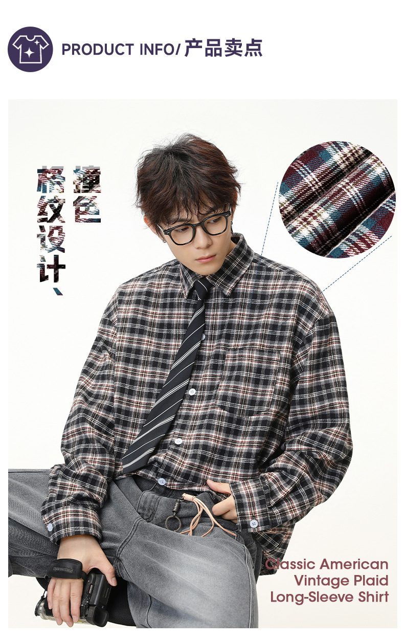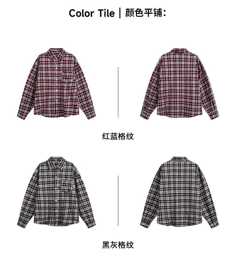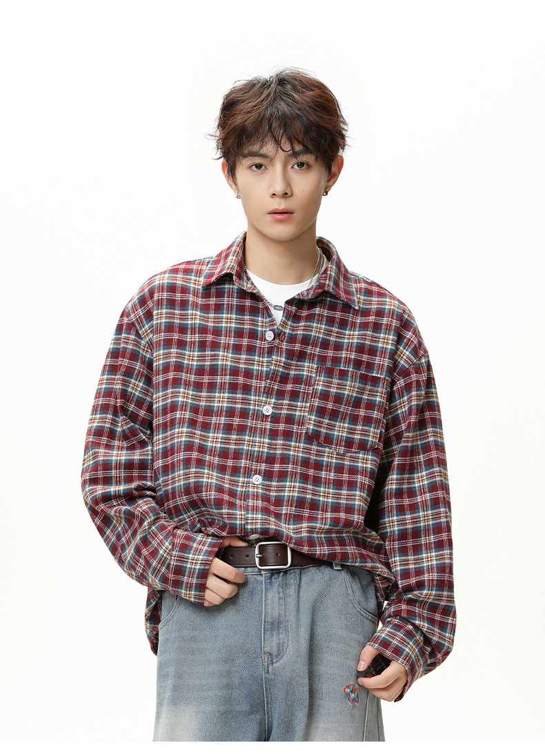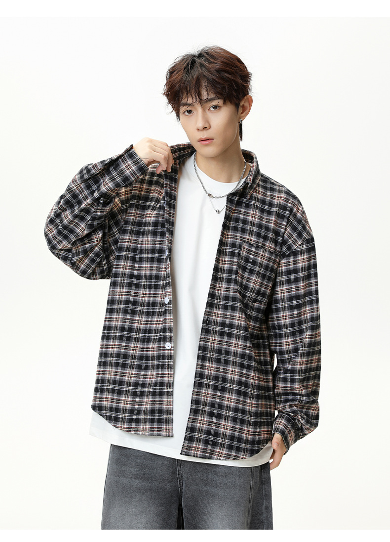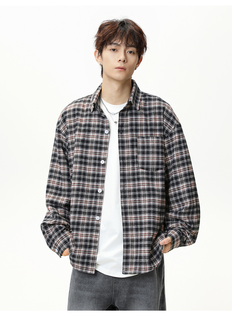가을 기본 격자 무늬 옷깃 포켓 셔츠 커플 재킷 유행 남성을위한 미국 복고풍 대비 격자 무늬 격자 무늬 긴팔 셔츠스토어 가기
