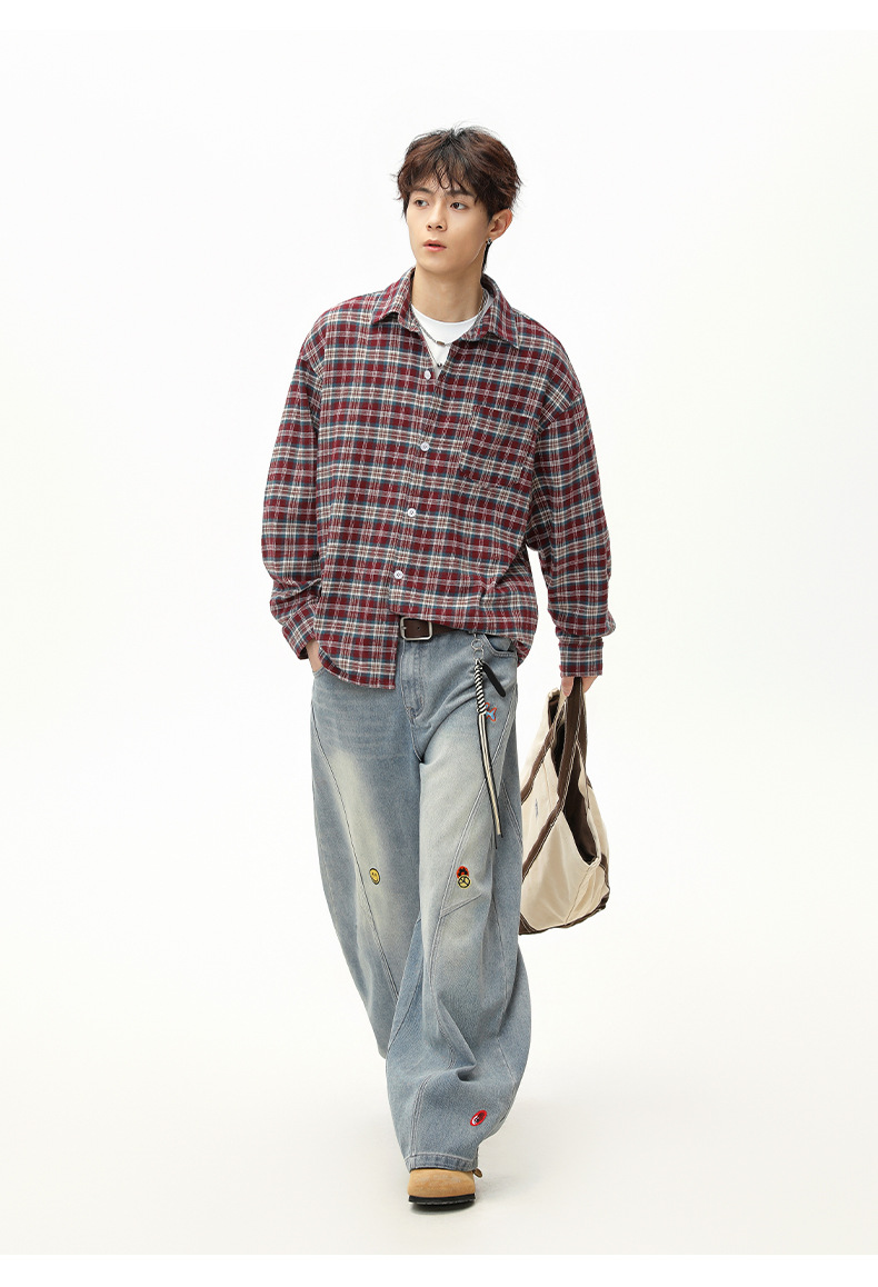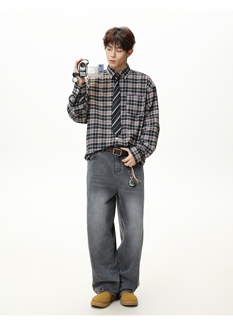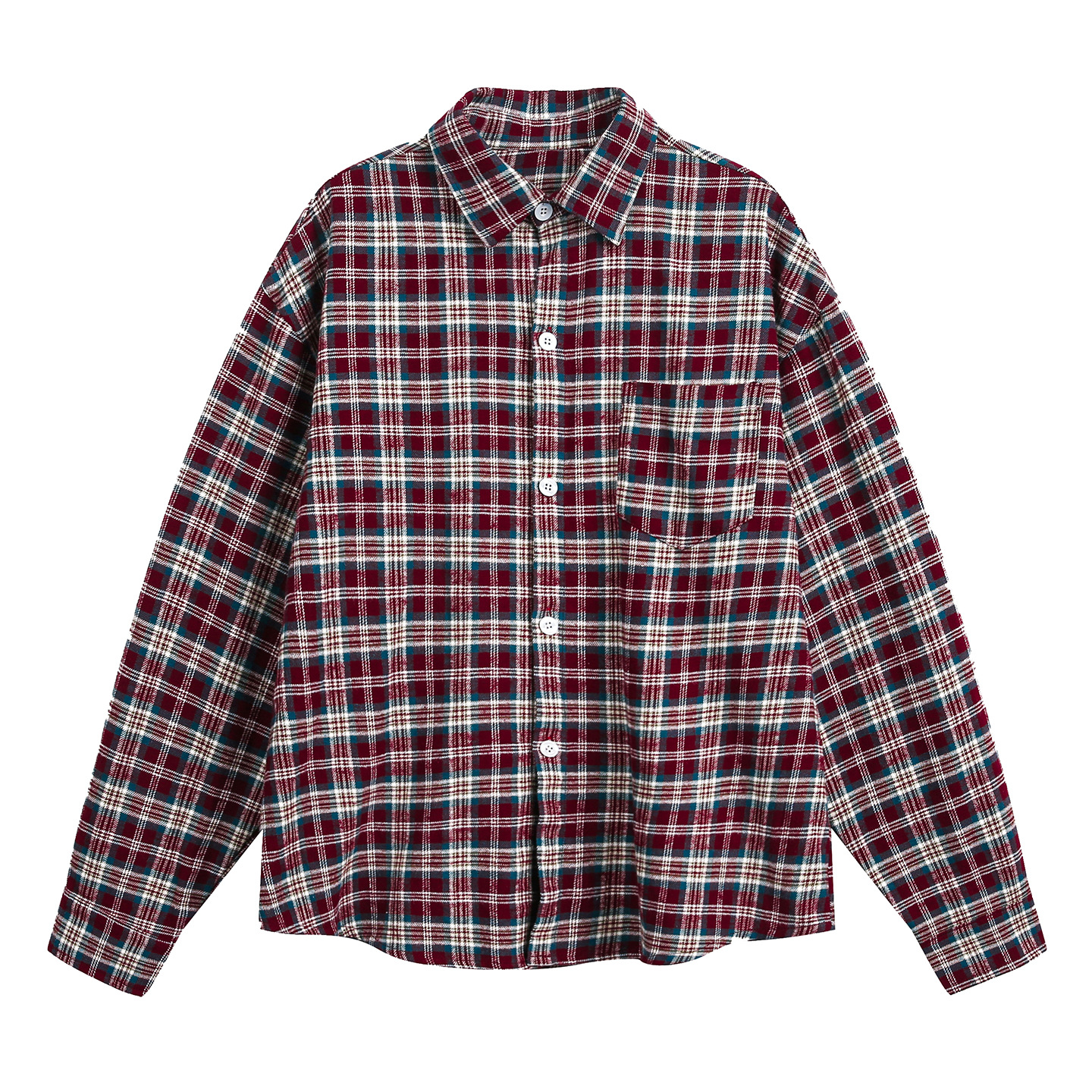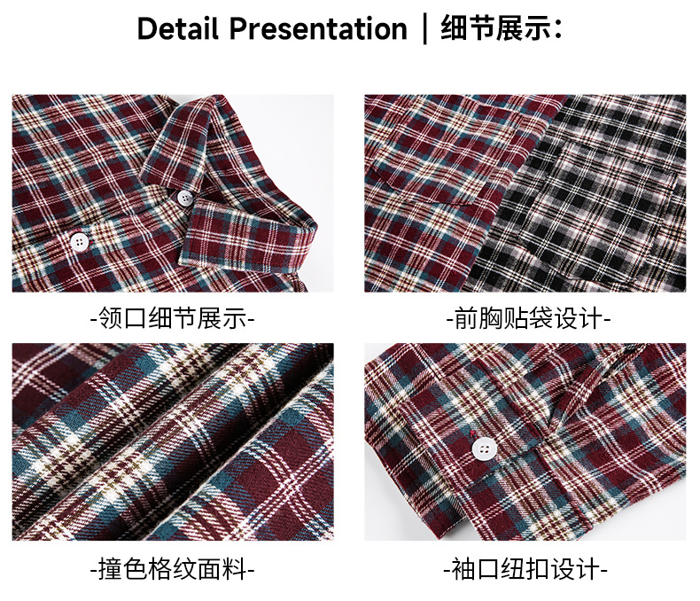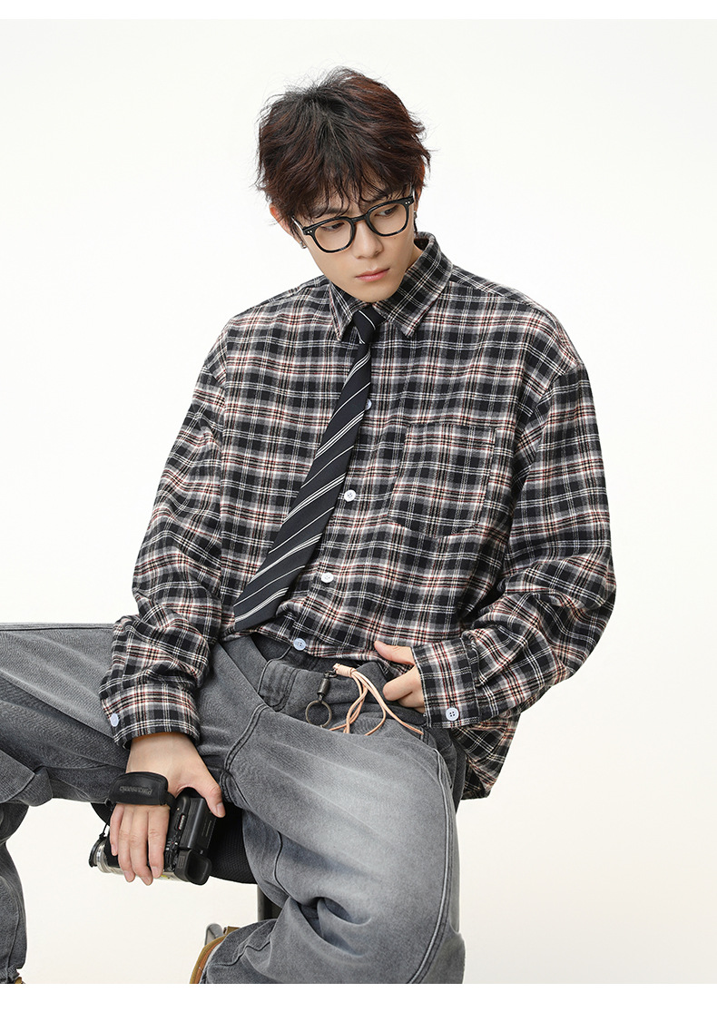 가을 기본 격자 무늬 옷깃 포켓 셔츠 커플 재킷 유행 남성을위한 미국 복고풍 대비 격자 무늬 격자 무늬 긴팔 셔츠스토어 가기