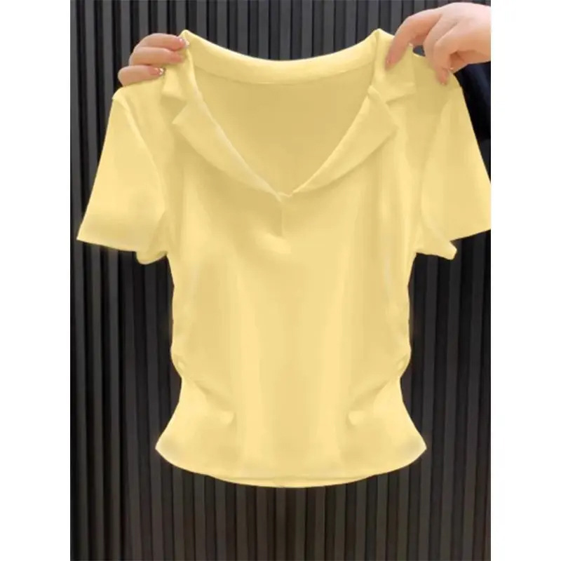 여름 여성용 폴로 칼라 반팔 티셔츠, 슬림한 어깨, 한국식 허리 셔츠, 짧은 스타일의 탑, 허리 슬리밍스토어 가기