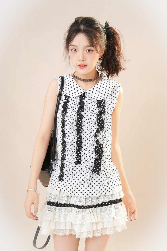 [Sweet Cake] 일본 복고풍 빈티지 화이트 폴카 도트 인형 칼라 민소매 탑 + 여성용 짧은 스커트
