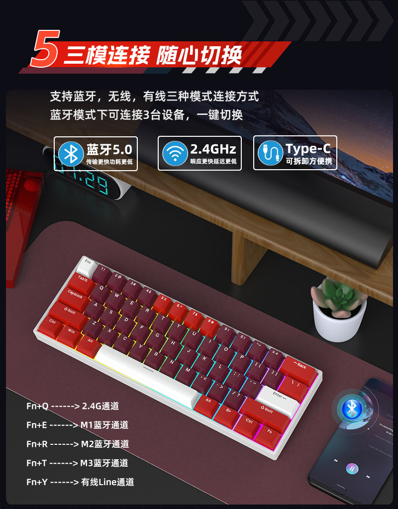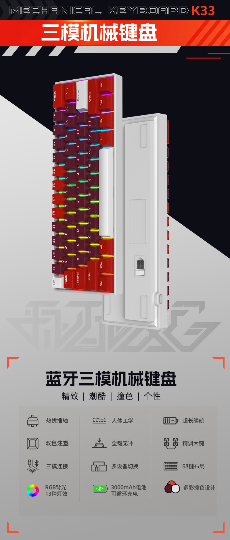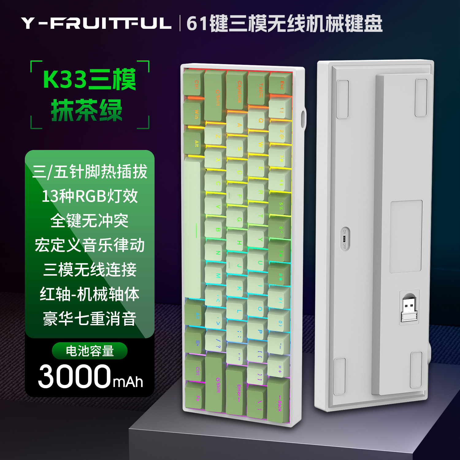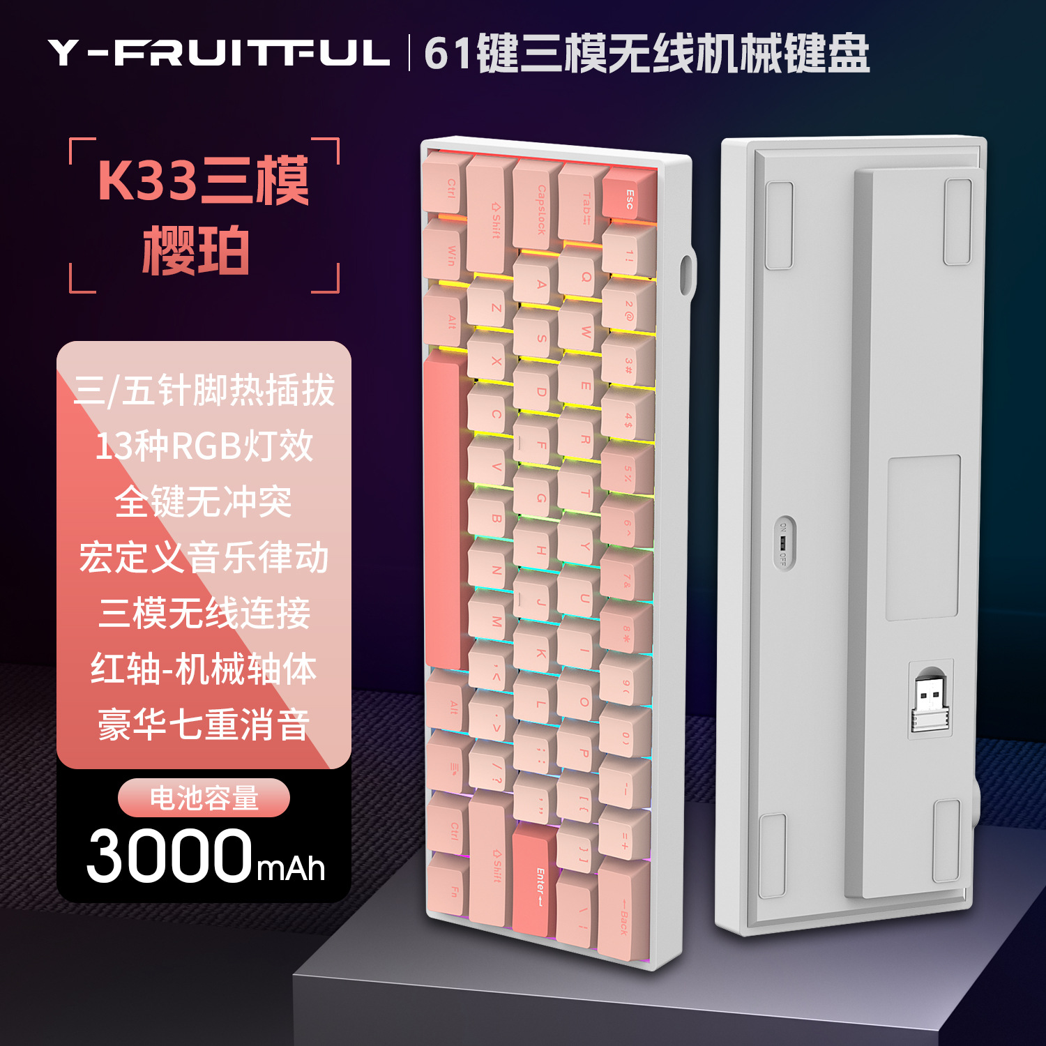 크로스보더 현물상품 K33 3모드 무선 블루투스 유선 61키 RGB 커스터마이징 가능 기계식 키보드 핫스왑 러시아어 지원