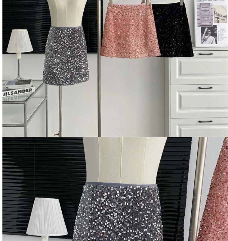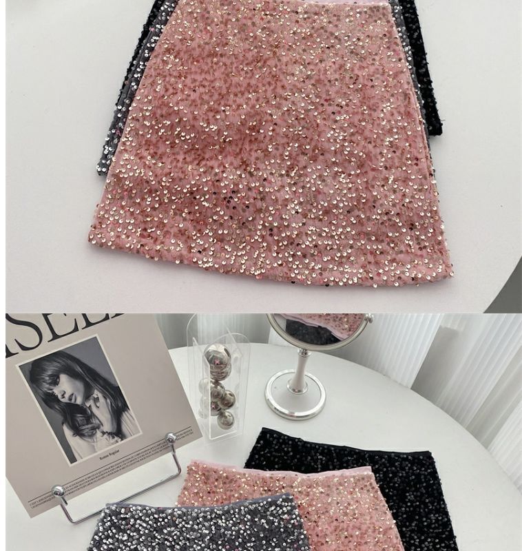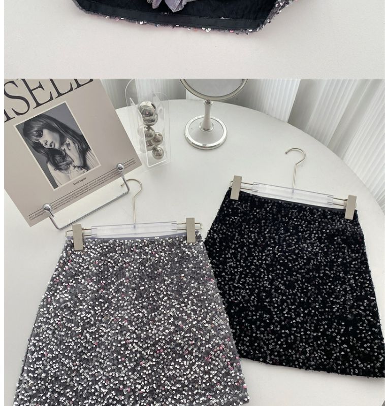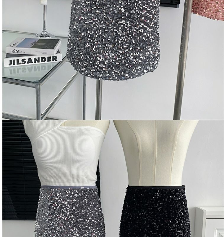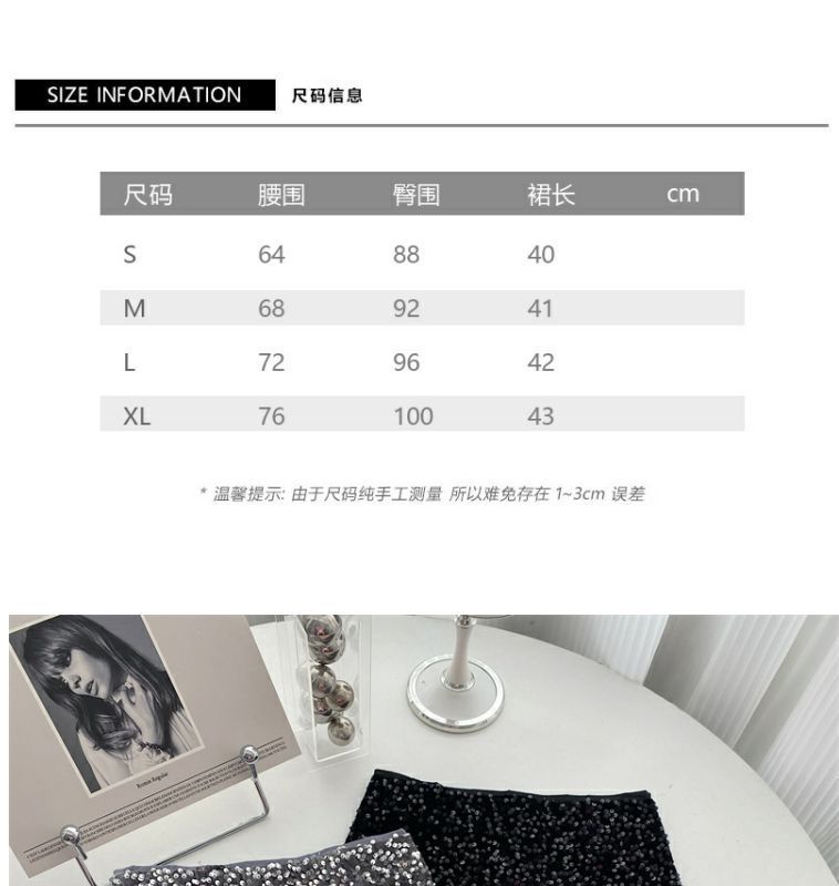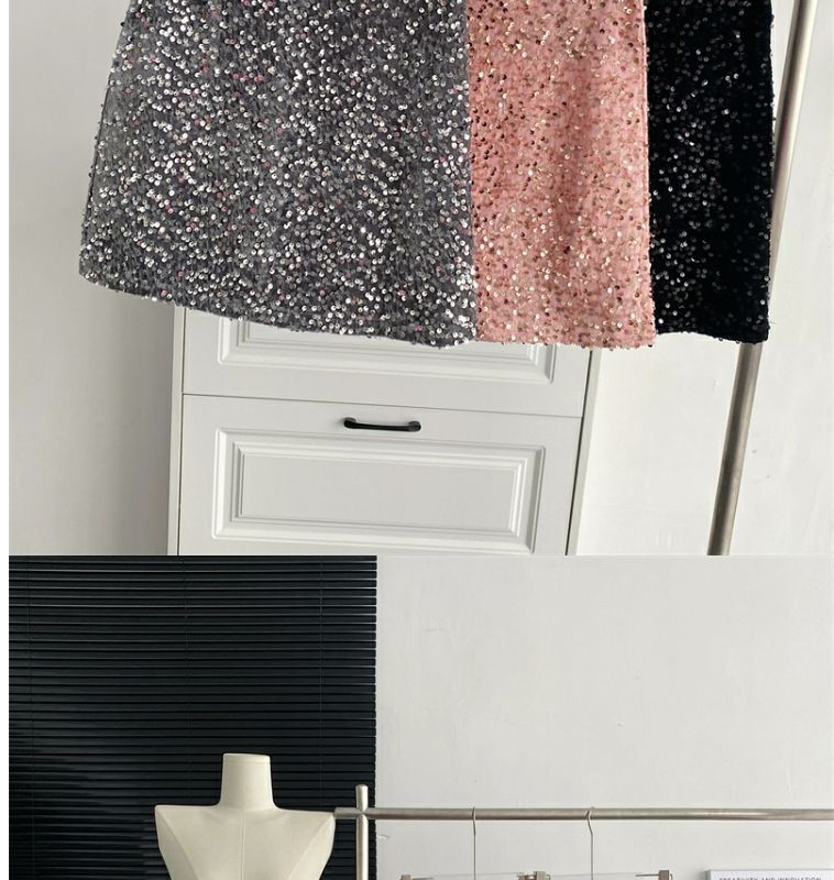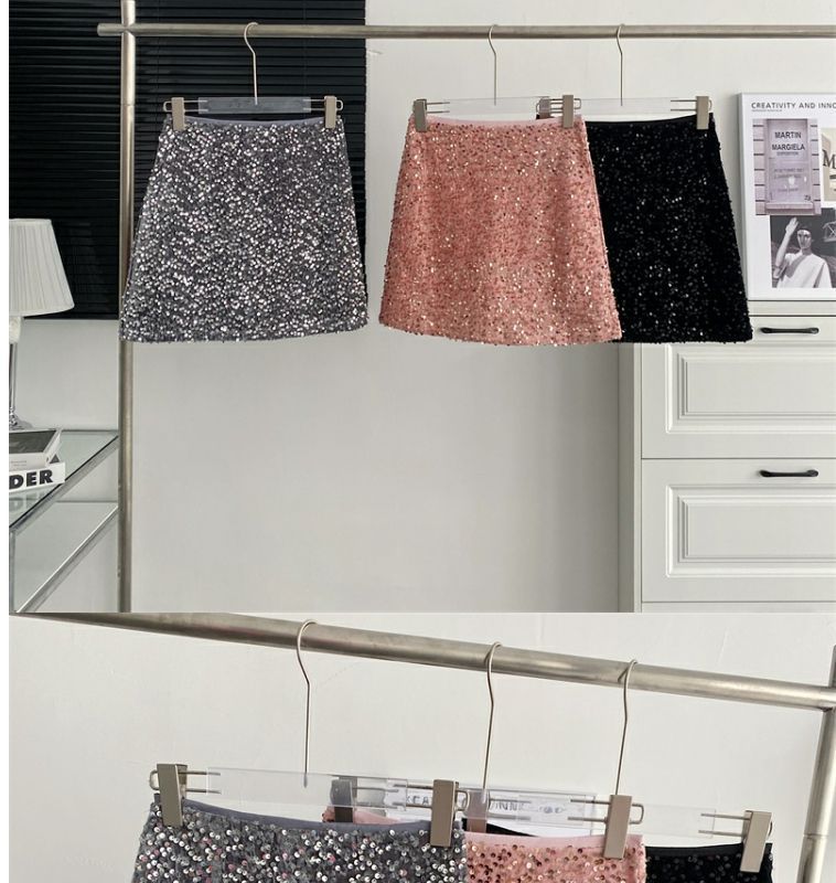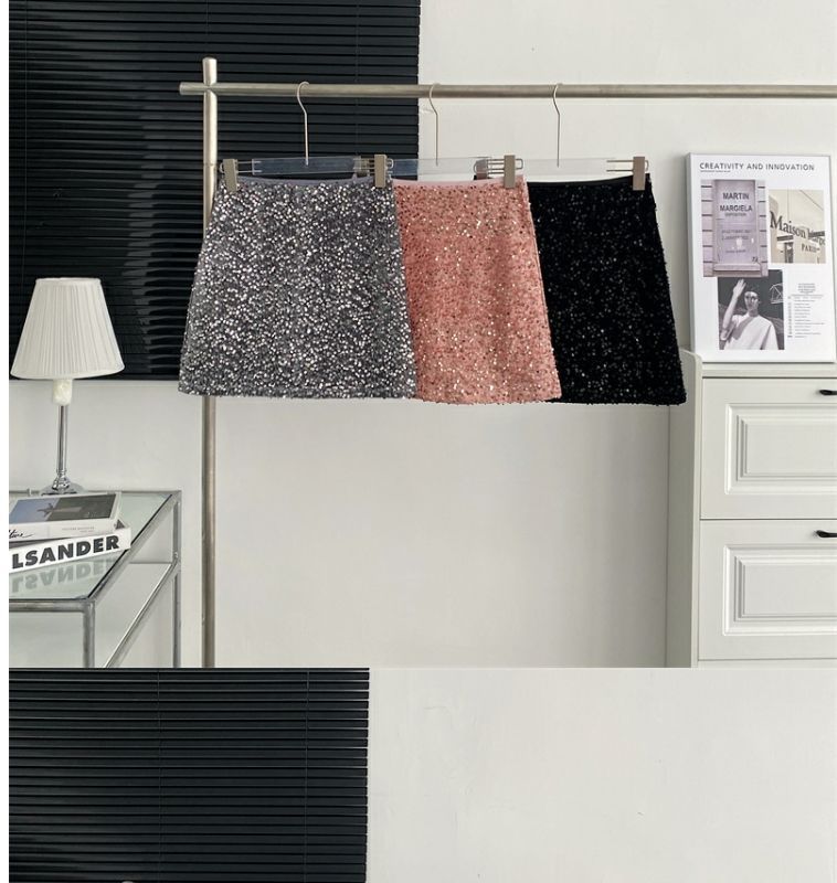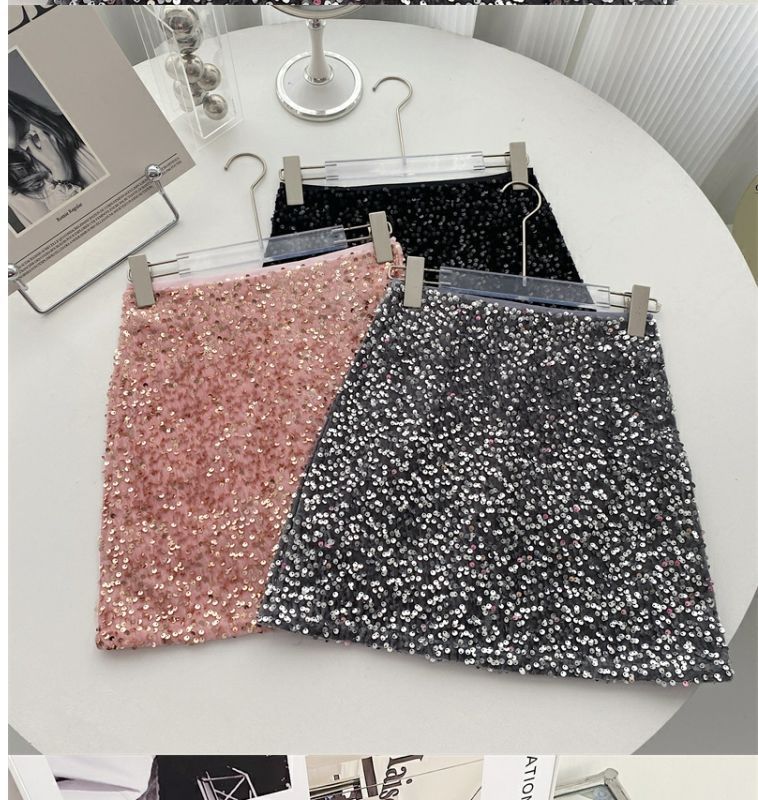 패셔너블한 디자인, 반짝이는 스팽글, 하이웨이스트 슬리밍 스커트, 노출방지 숏스커트, A라인 스커트, 여성용 힙커버 스커트스토어 가기