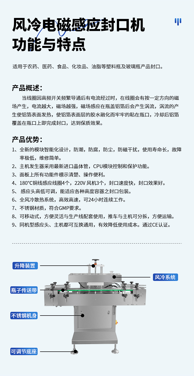 공냉식 전자기 유도 씰링 기계 비접촉 알루미늄 필름 씰링 200-1000 병/시간 공장 직접 공급