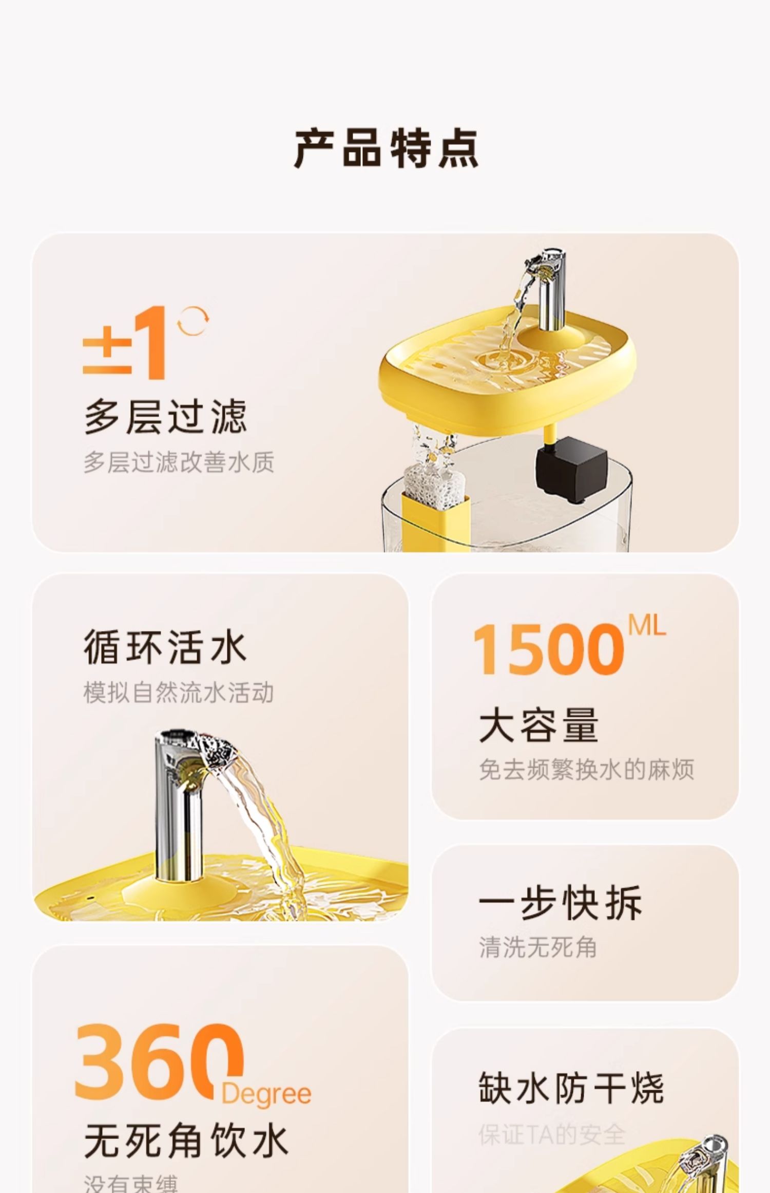 • [새롭게 업그레이드된 건조방지 모델] 크림옐로우-1500ml (무소음+순환정수) 필터솜 3개 포함