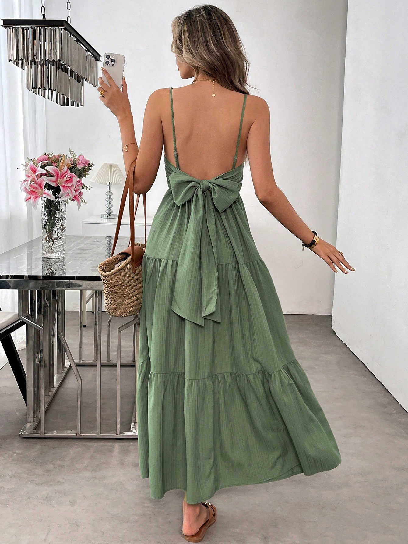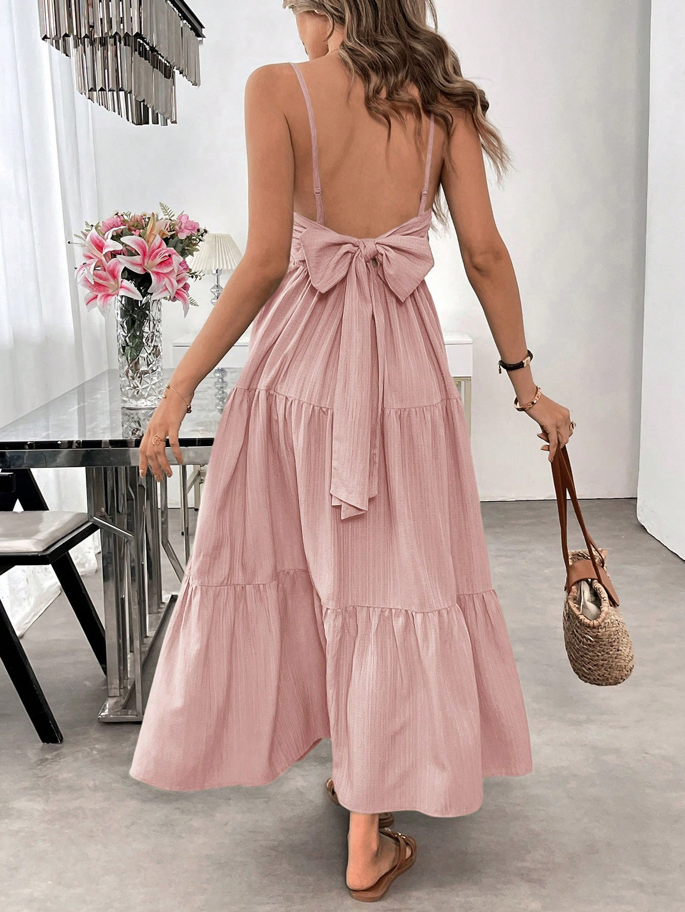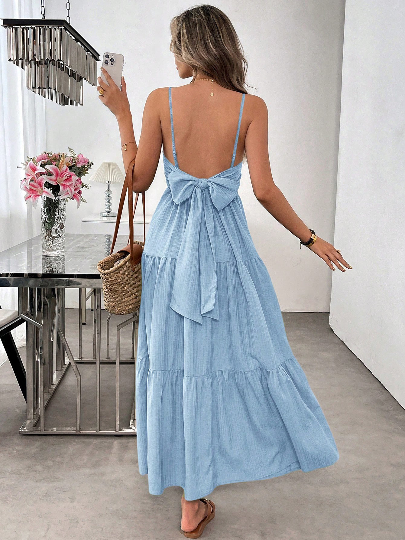 유럽과 미국의 대외 무역 여성 의류 2025 백리스 서스펜더 케이크 롱 스커트 레이스 업 대형 리본 허리 대형 스윙 드레스