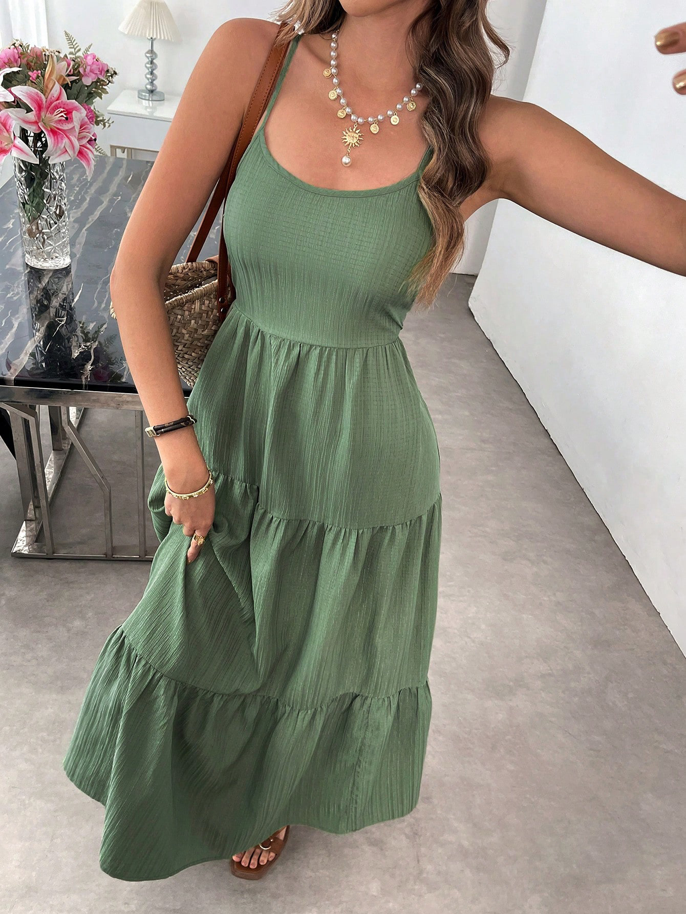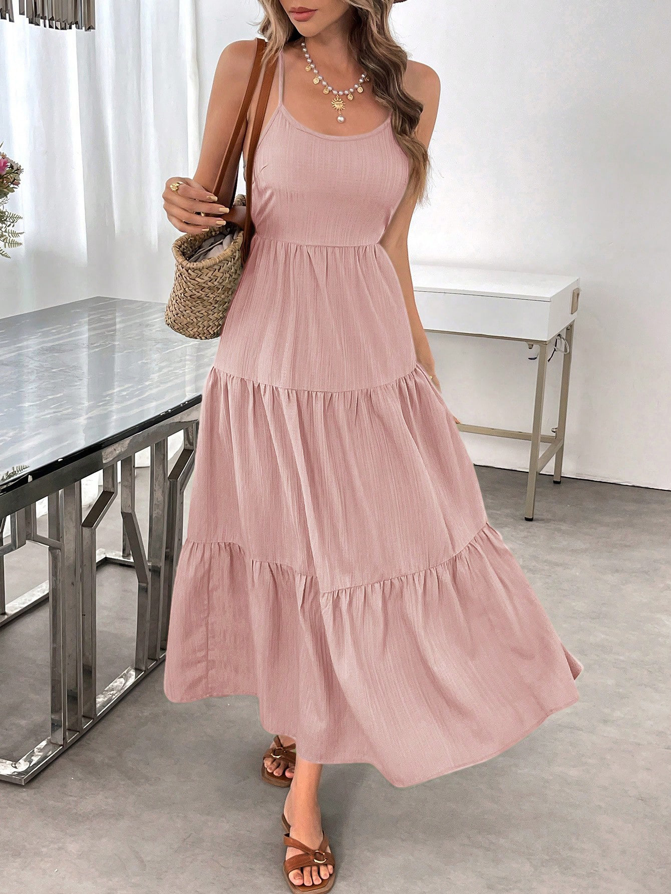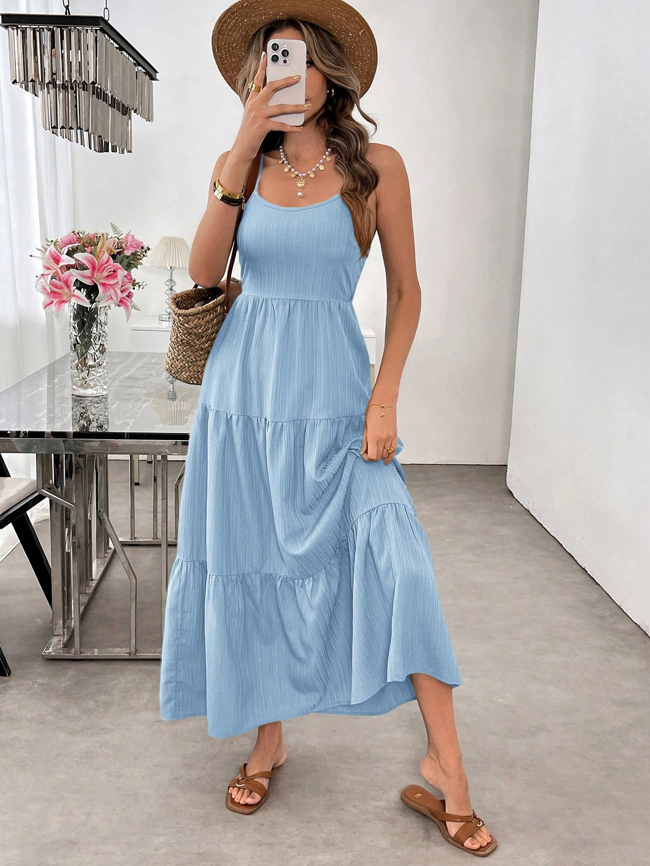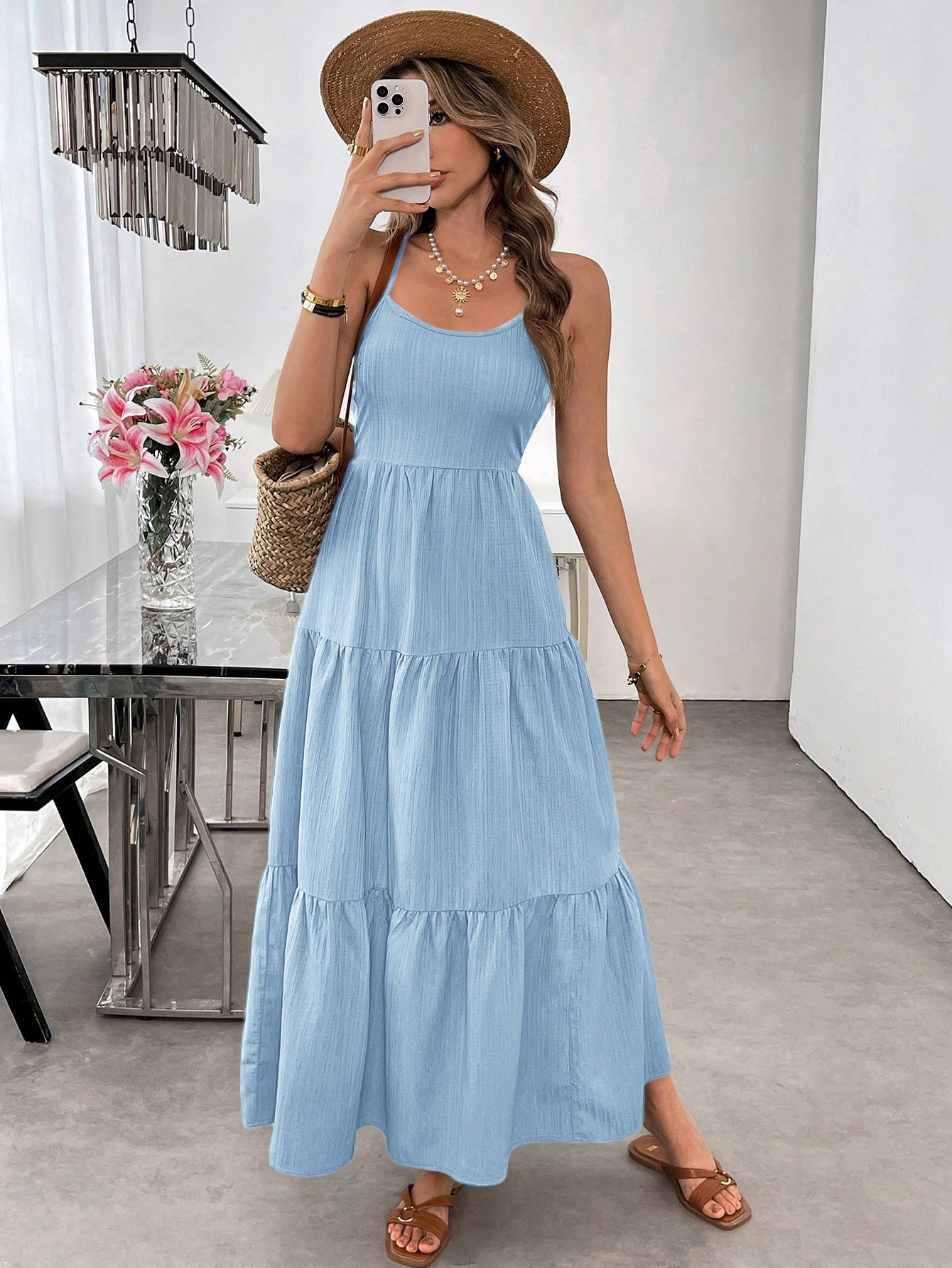 유럽과 미국의 대외 무역 여성 의류 2025 백리스 서스펜더 케이크 롱 스커트 레이스 업 대형 리본 허리 대형 스윙 드레스