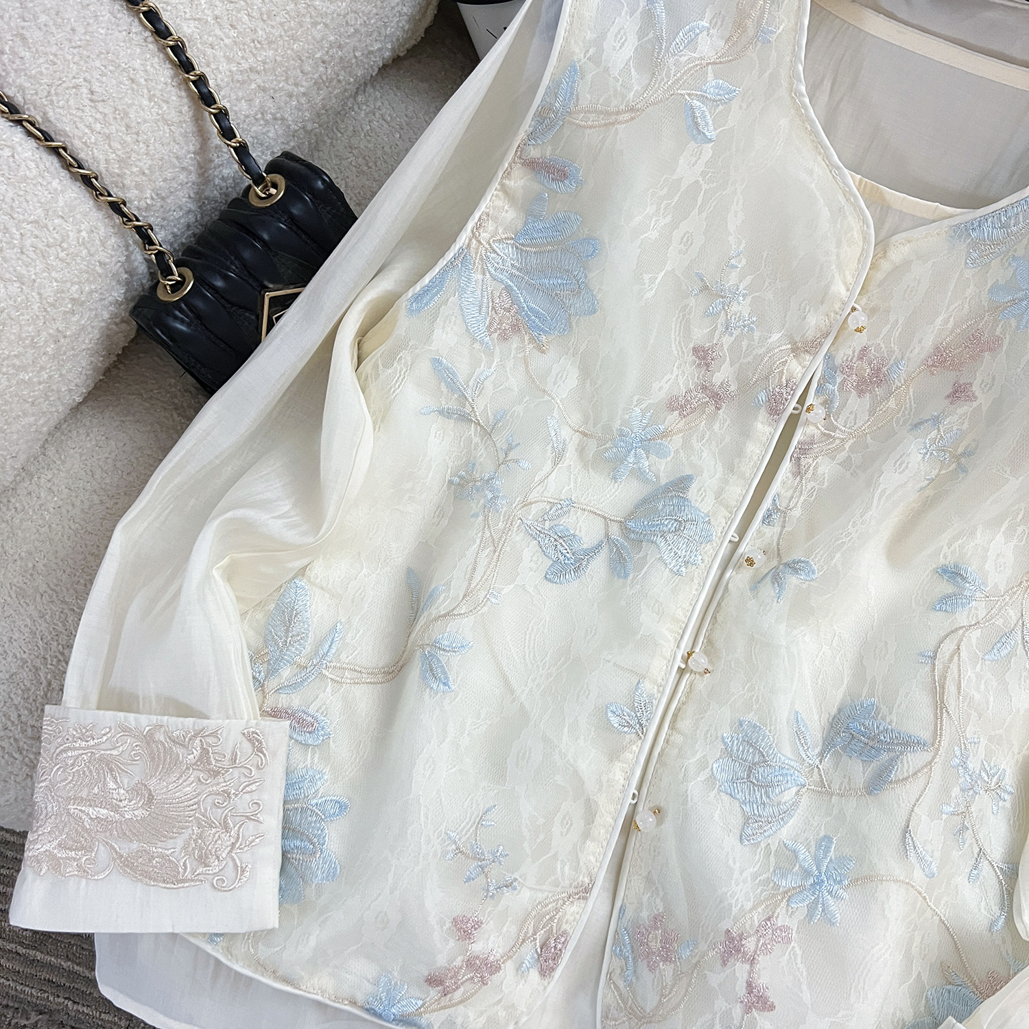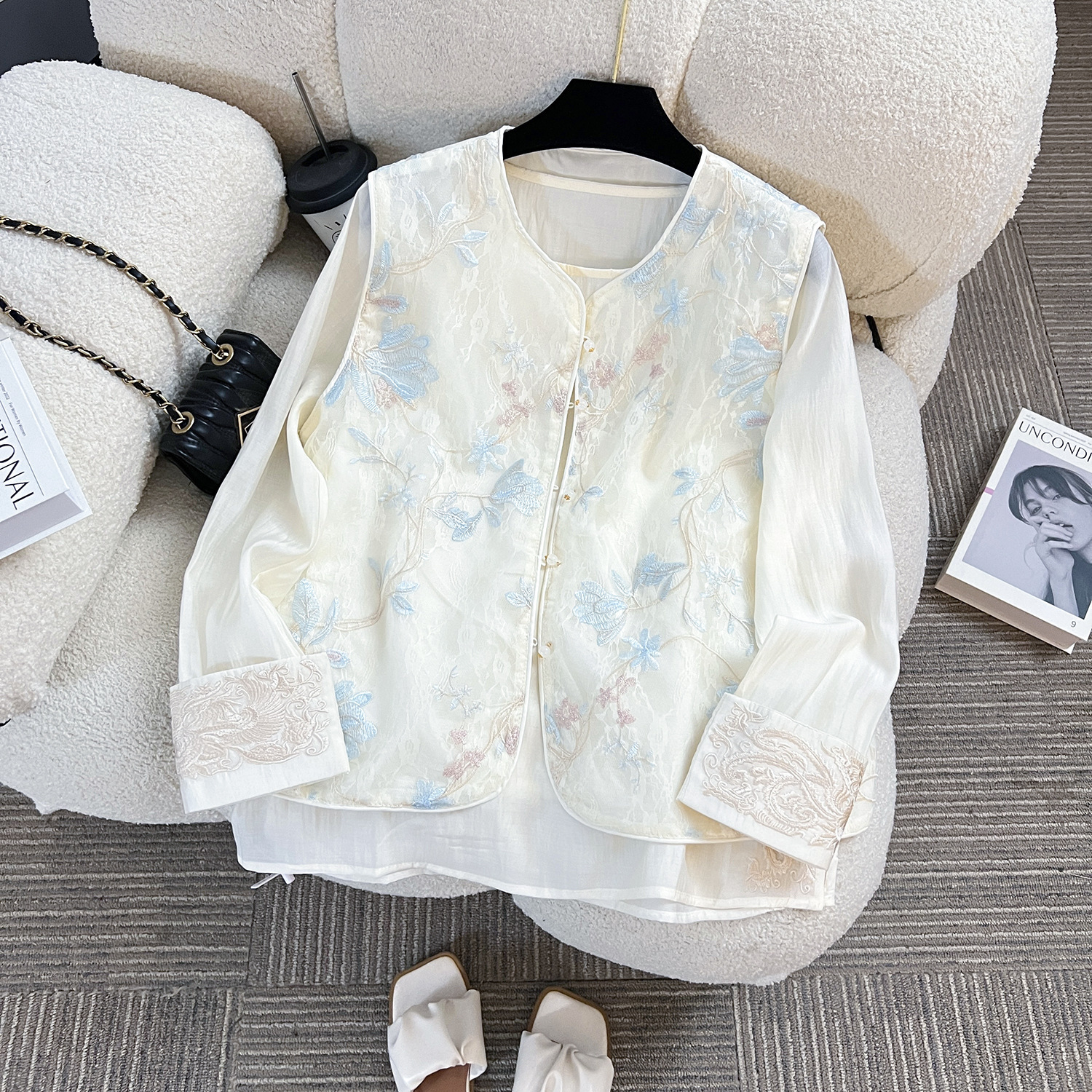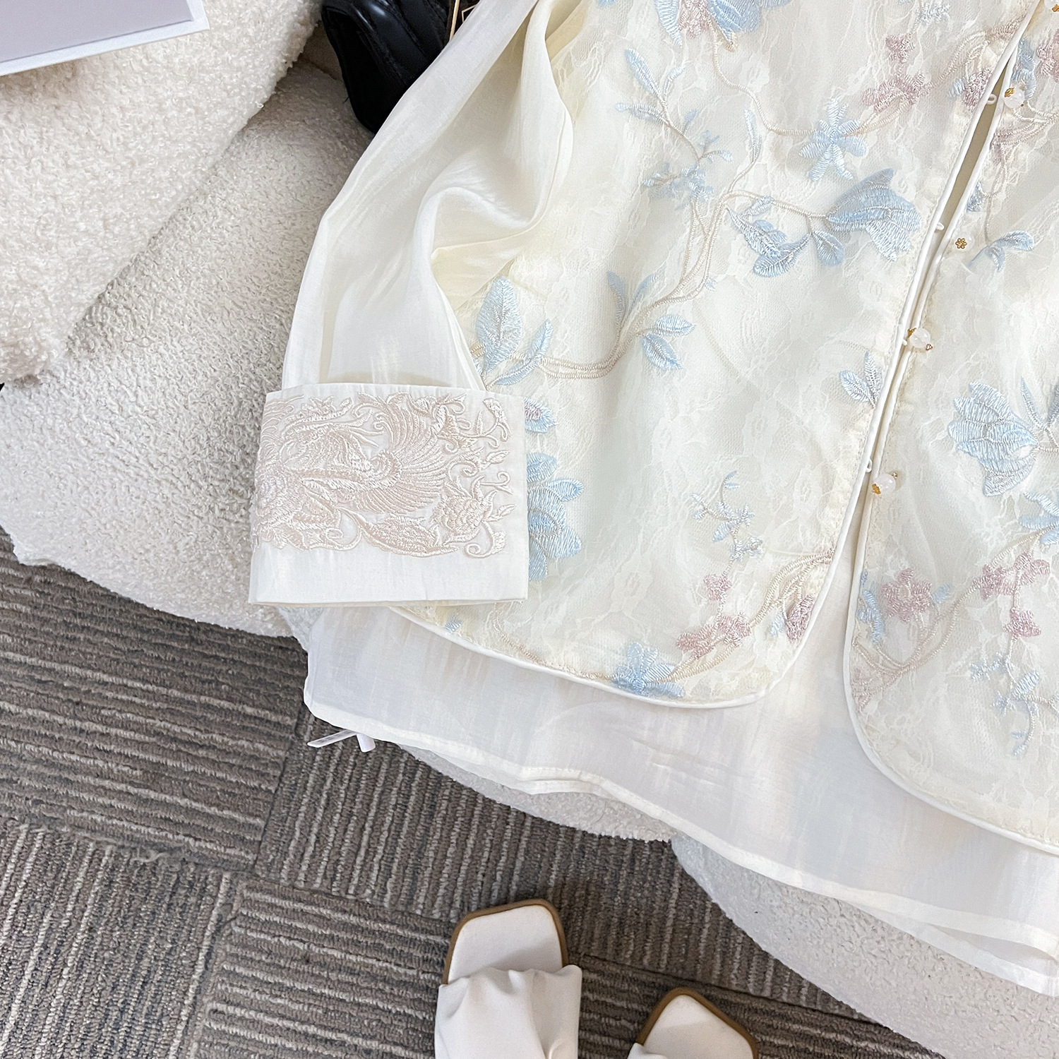 여성을 위한 새로운 스타일의 중국 스타일 자수 자카드 짧은 조끼, 루즈하고 슬림하며 세련된 이너 탑, 동남아 및 기타 긴팔스토어 가기