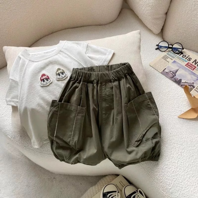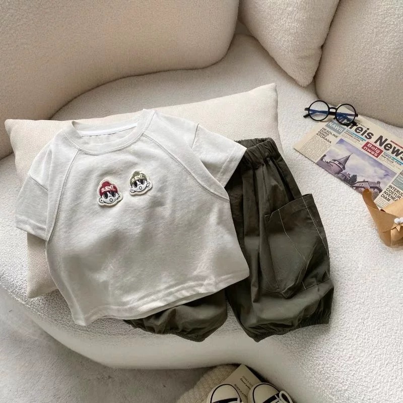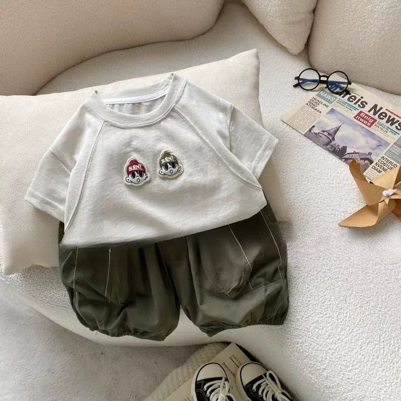 유아복, 여름 반팔 티셔츠, 반바지, 스플릿 투피스 세트, 남아용 반팔 상의, 얇은 5부 팬츠