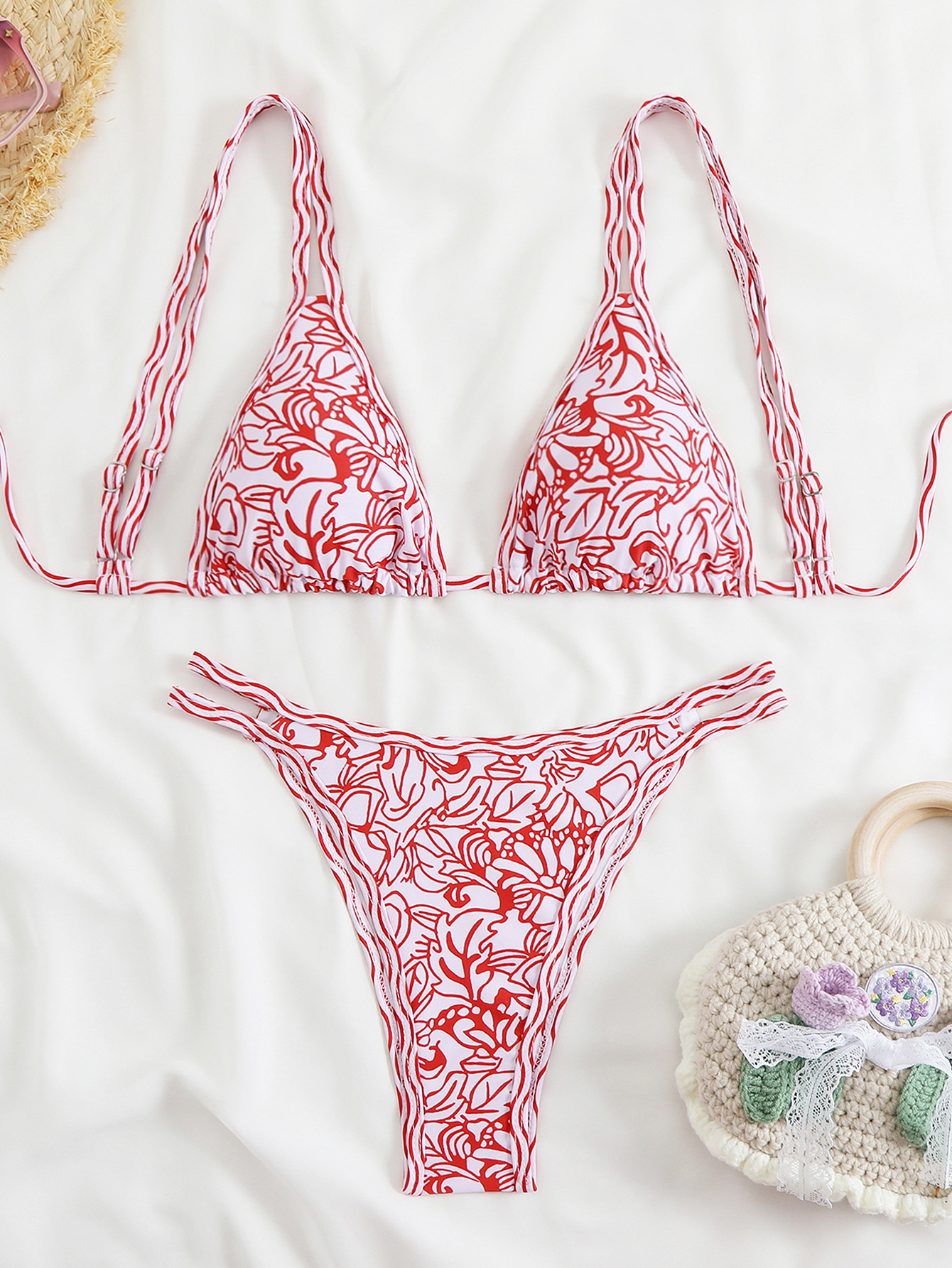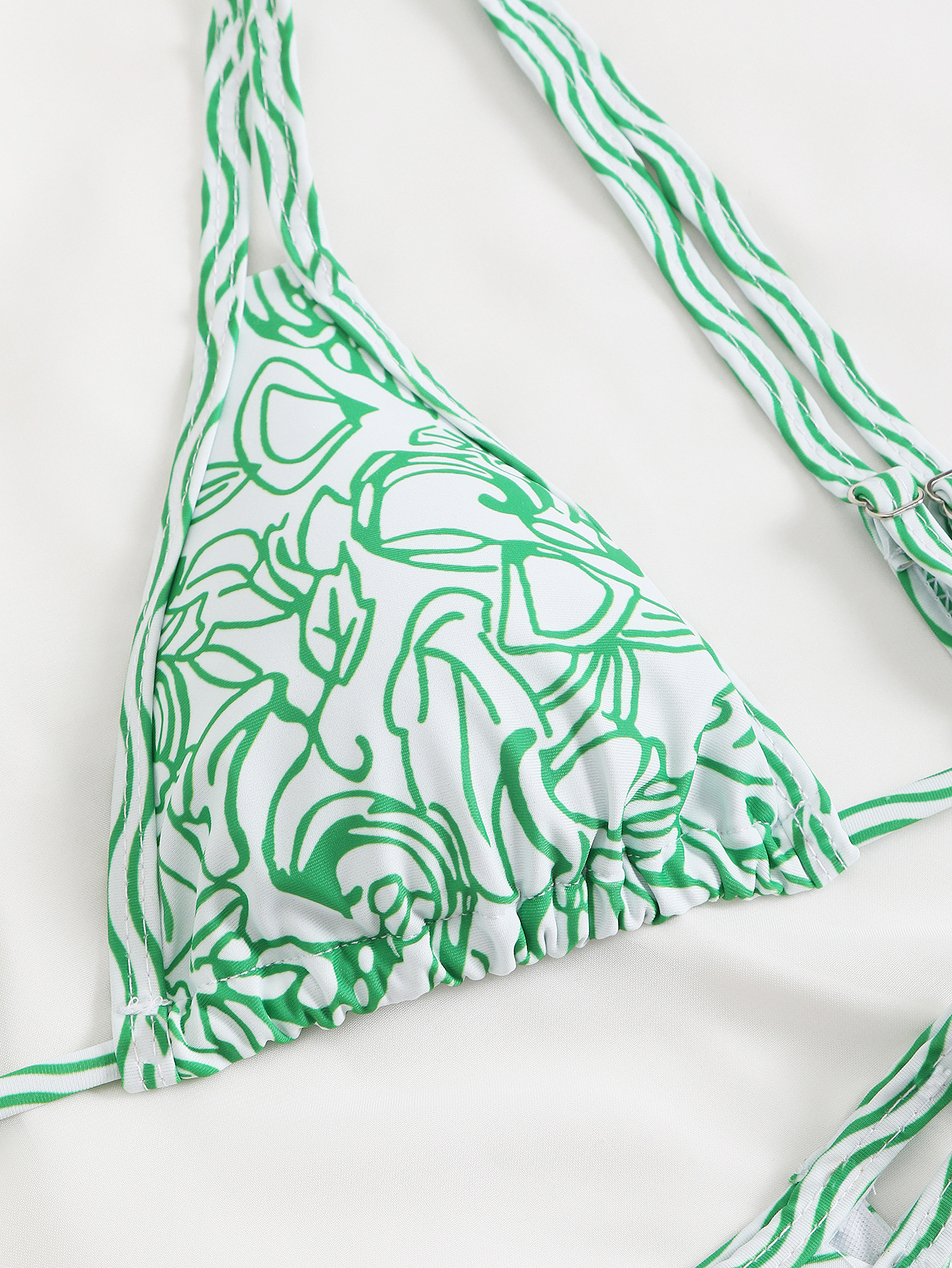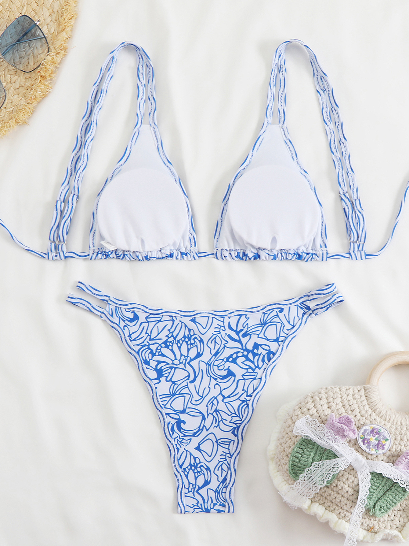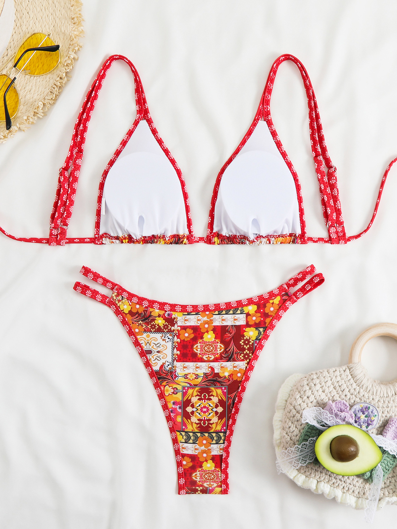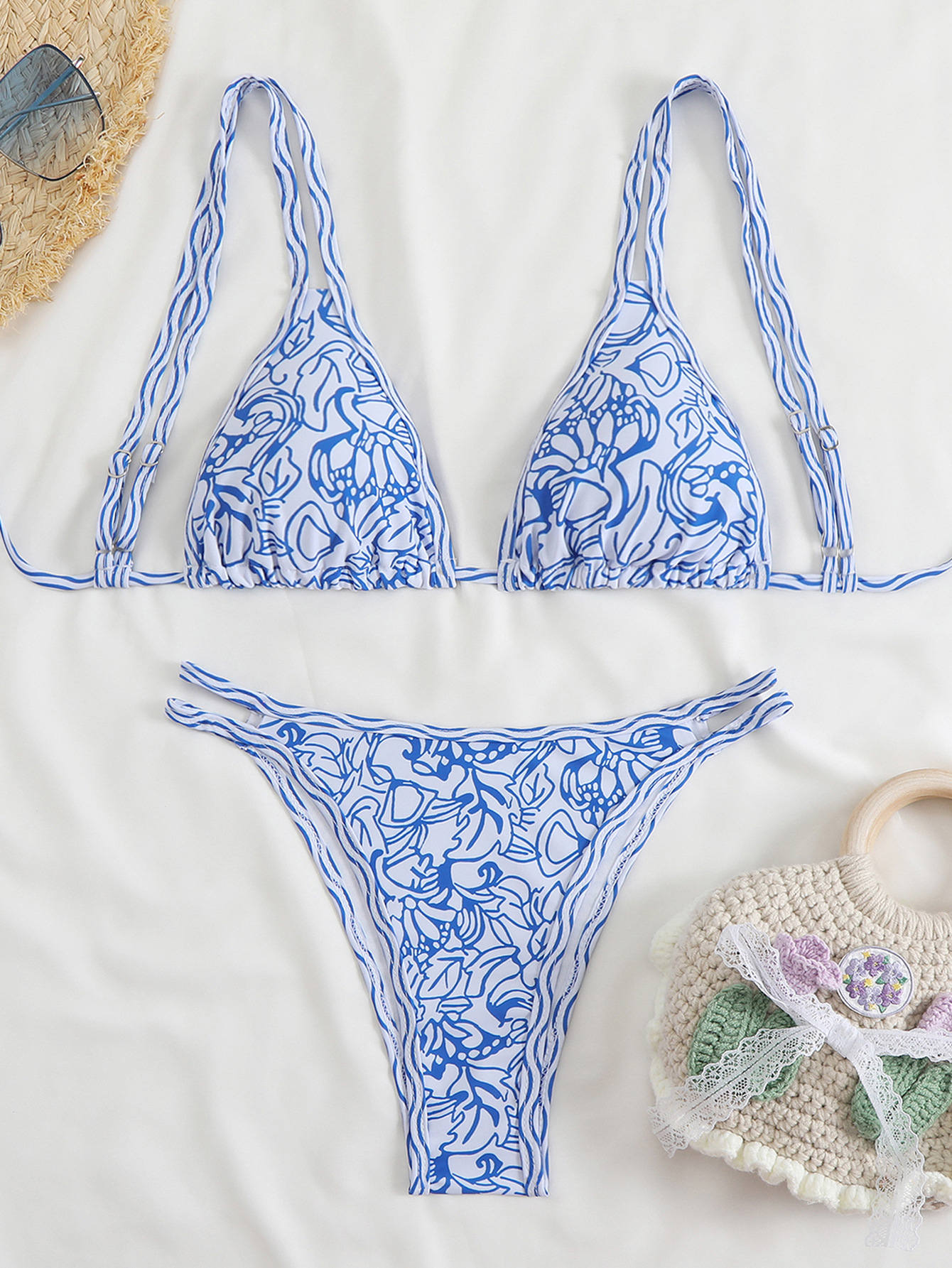 유럽과 미국의 민족 스타일 프린트 수영복, 여성스러운 삼각 컵 레이스 업 비키니, 해변 휴가, 여성용 크로스보더 수영복