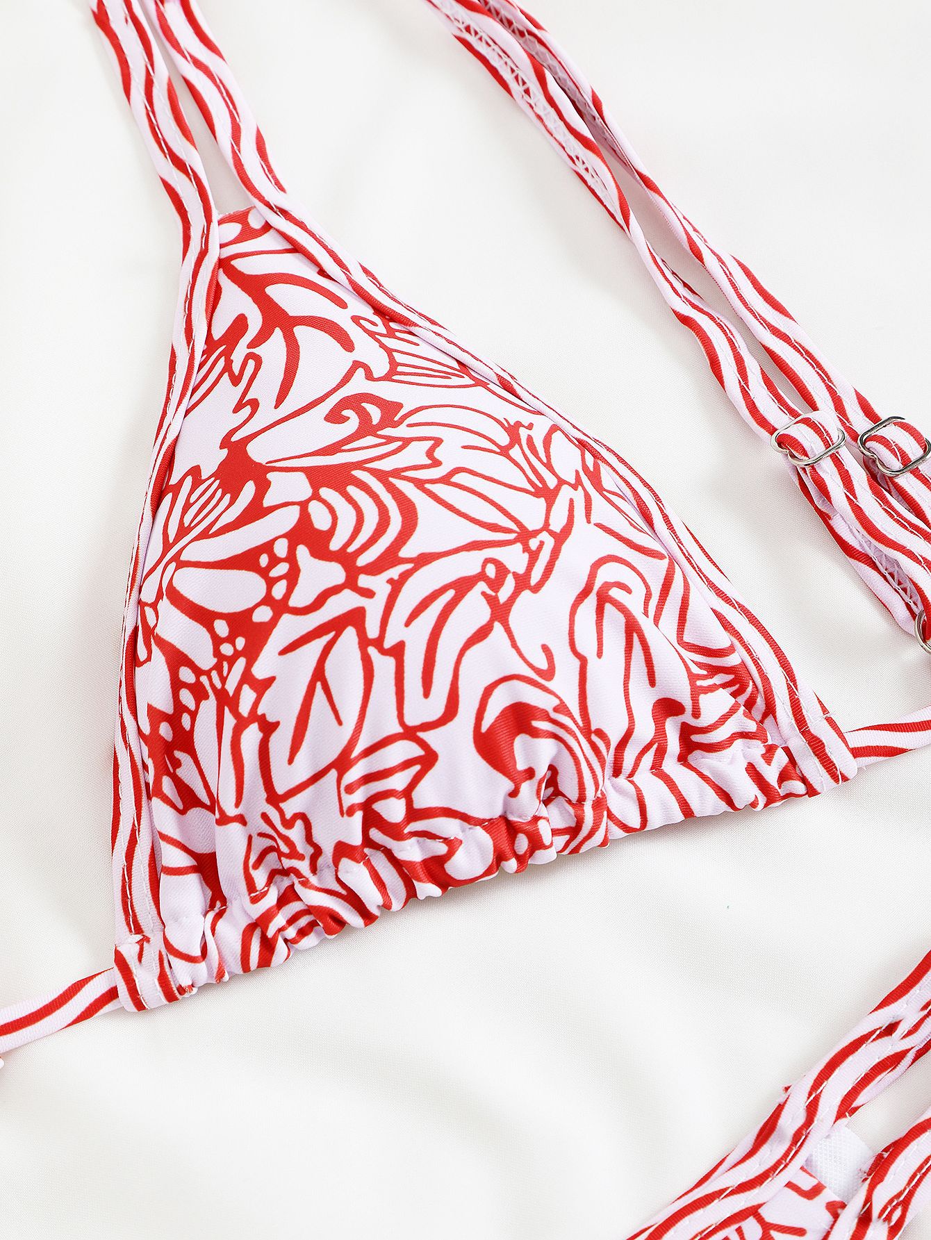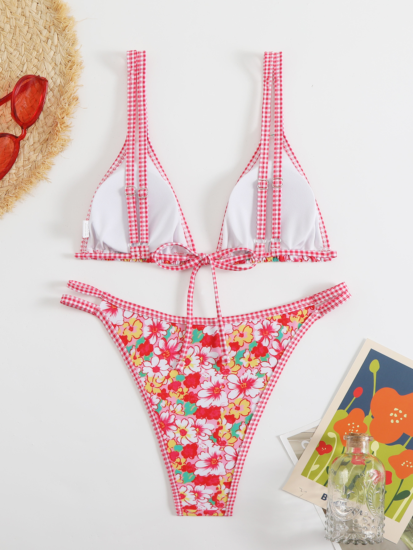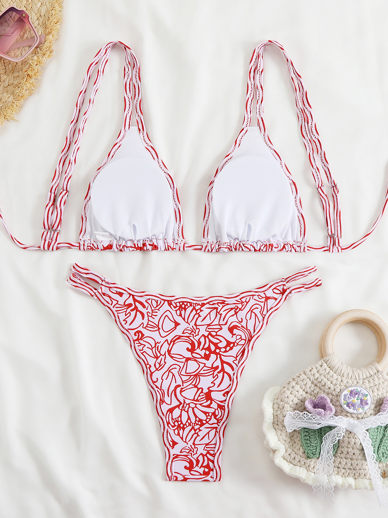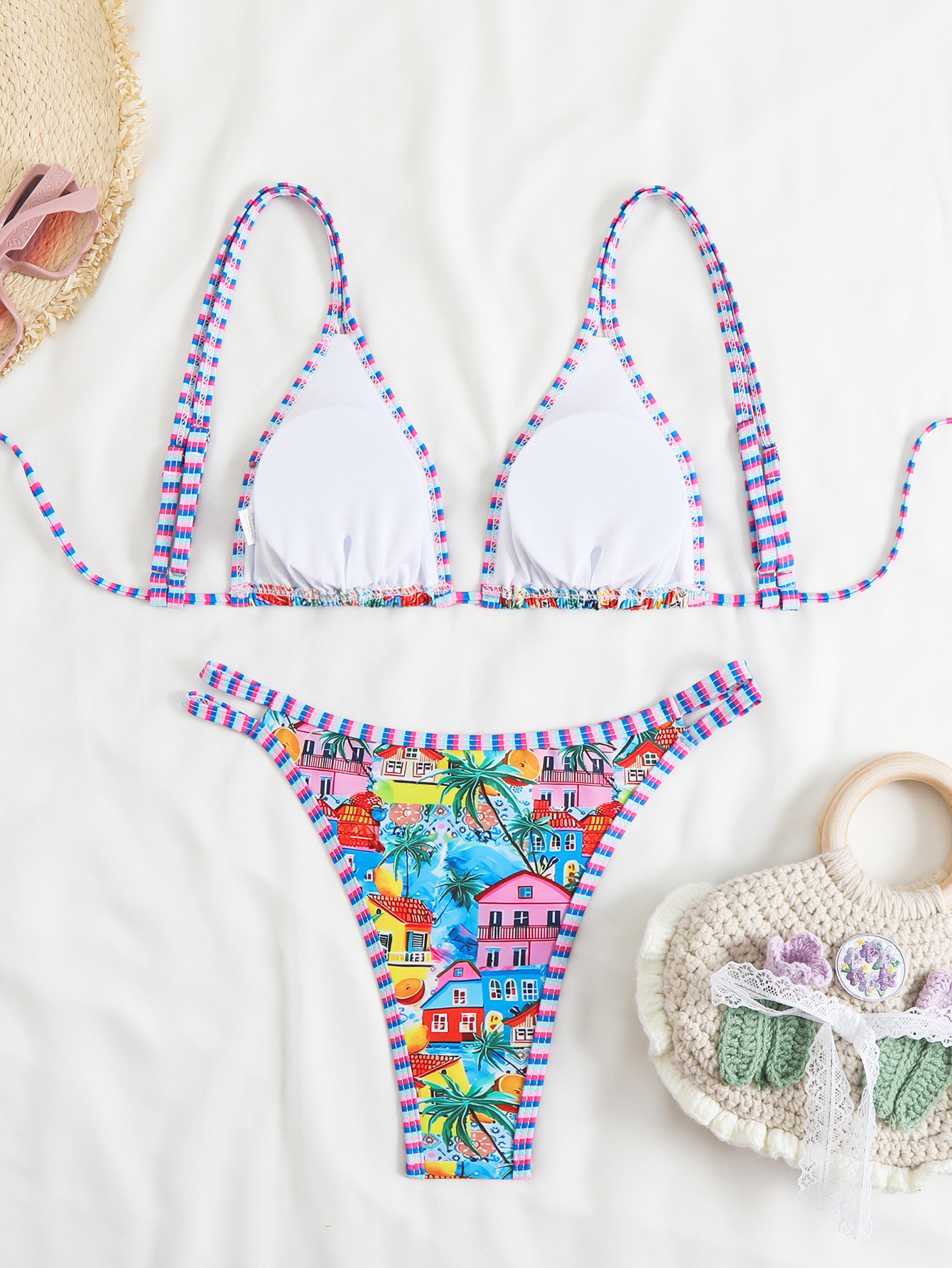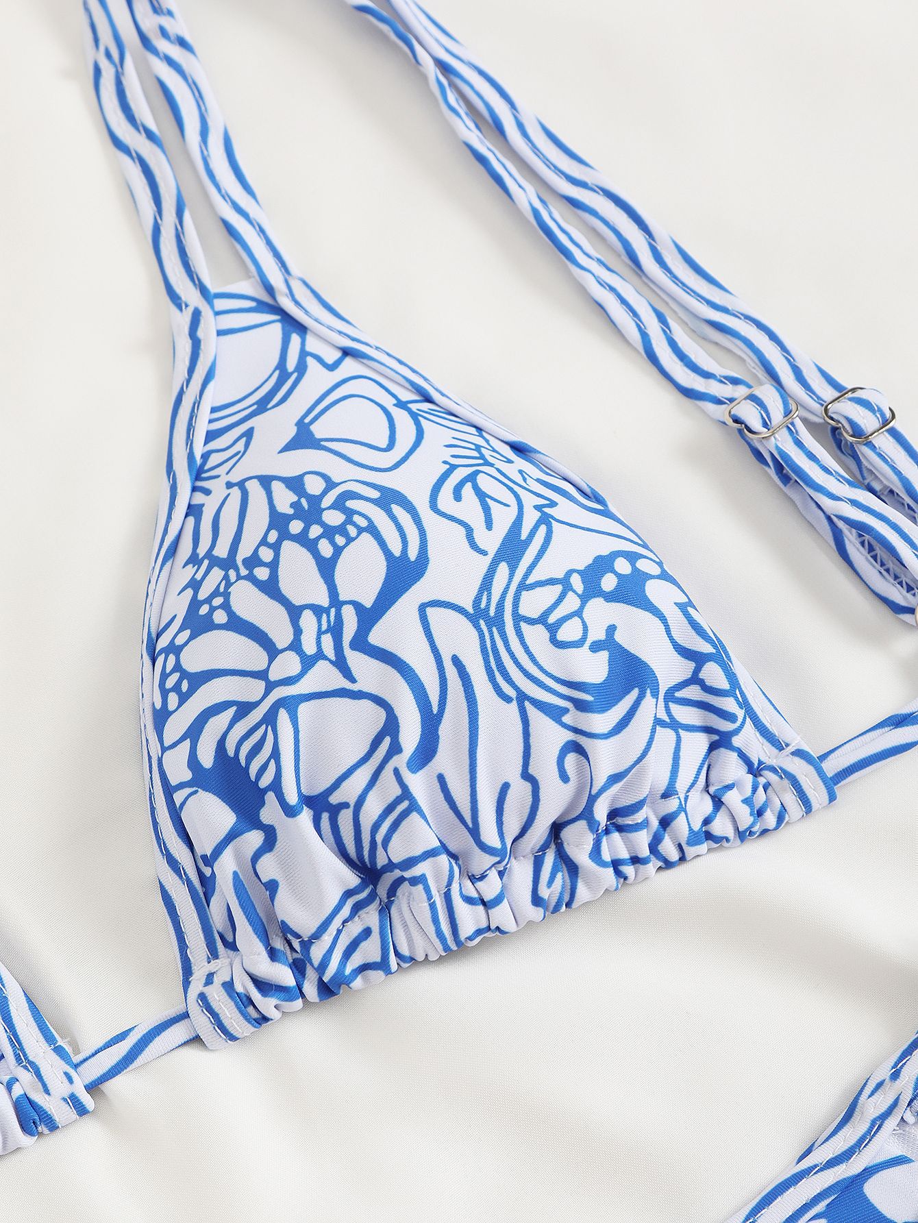 유럽과 미국의 민족 스타일 프린트 수영복, 여성스러운 삼각 컵 레이스 업 비키니, 해변 휴가, 여성용 크로스보더 수영복