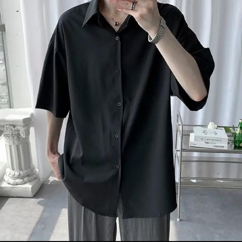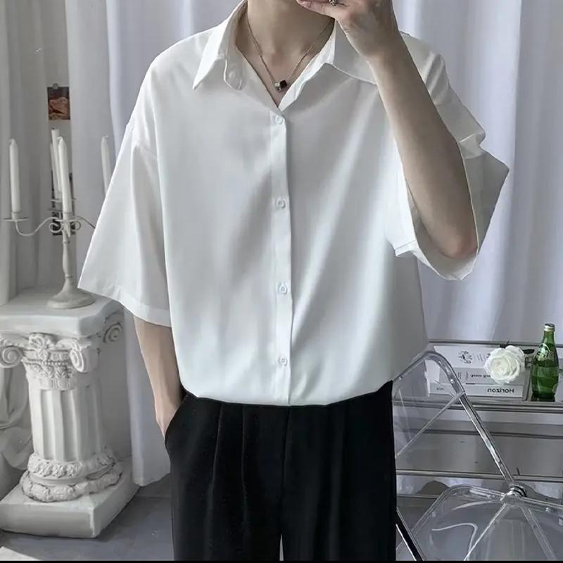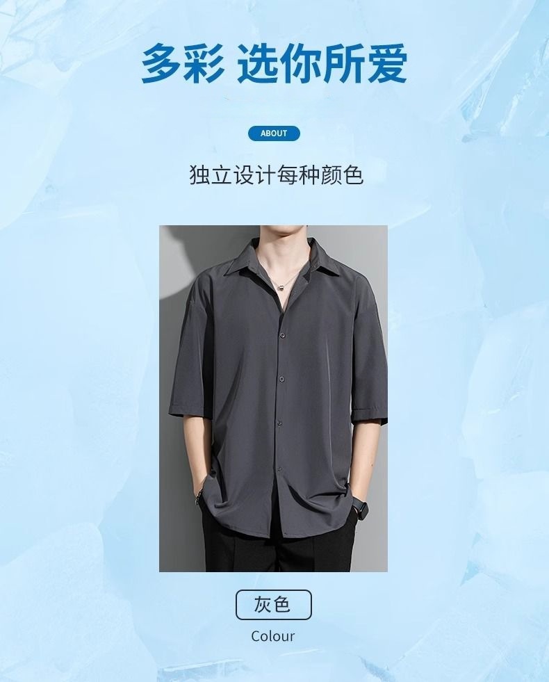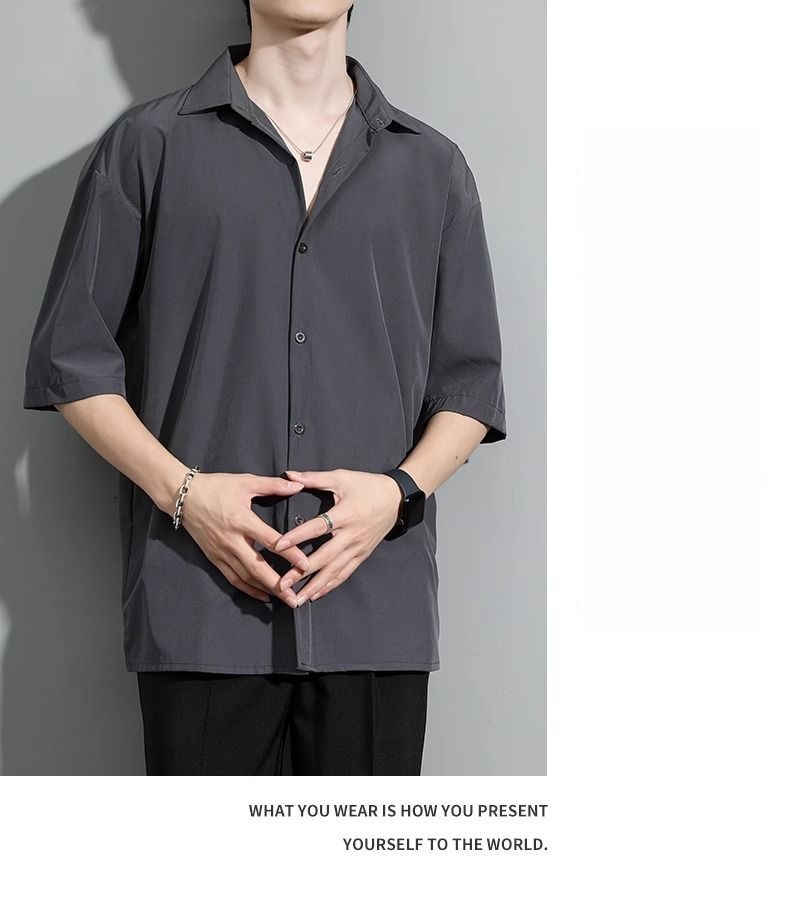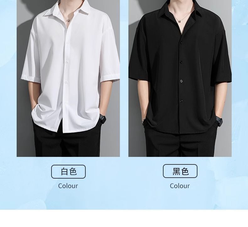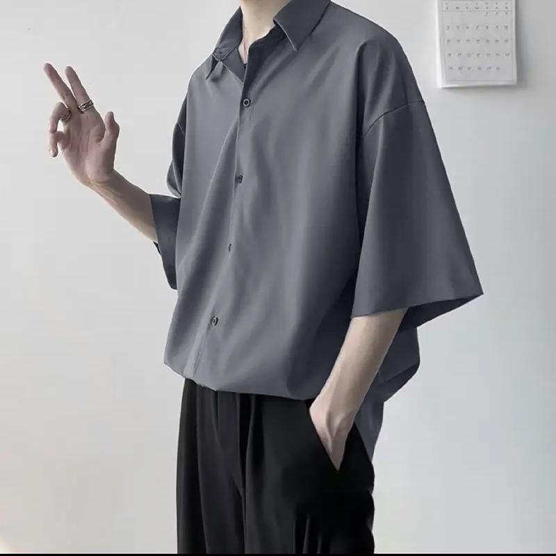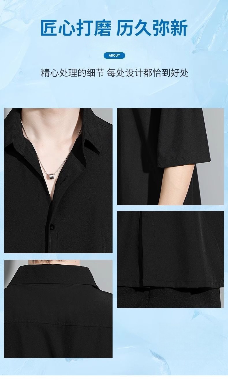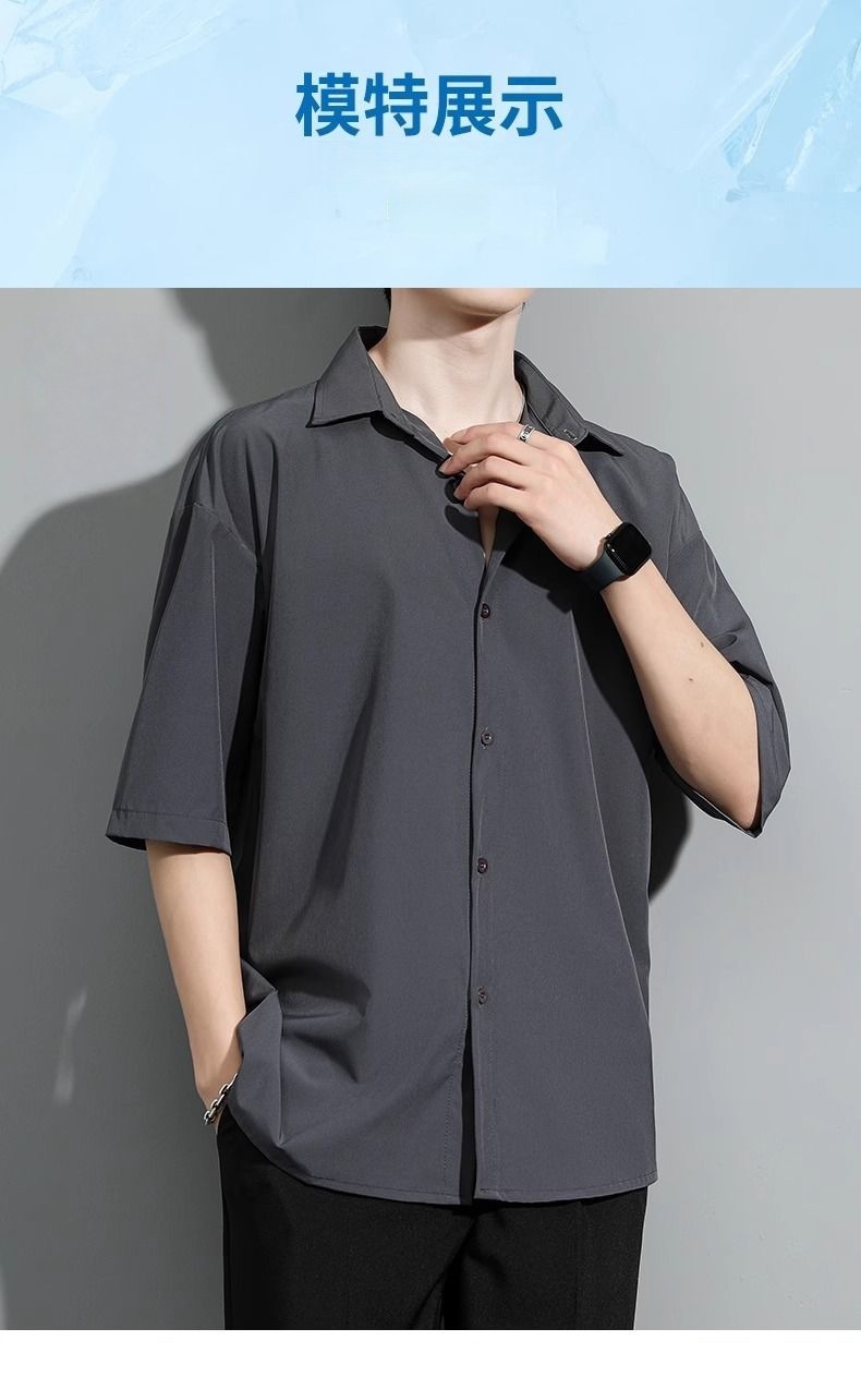 남성용 여름 얇은 얼음 실크 반팔 셔츠, 심플한 검정색과 회색 단색 대형 캐주얼 반팔 잘 생긴 흰색 셔츠스토어 가기