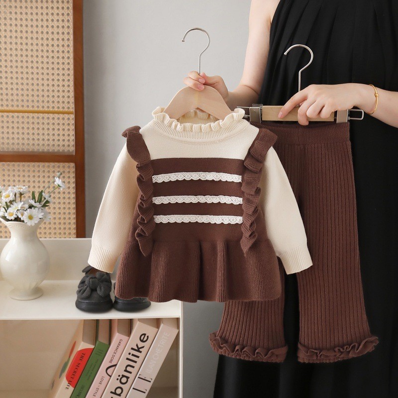 여자 스웨터 라운드 넥 2025 새로운 니트 투피스 세트 달콤하고 귀여운 어린 소녀 바지 정장스토어 가기