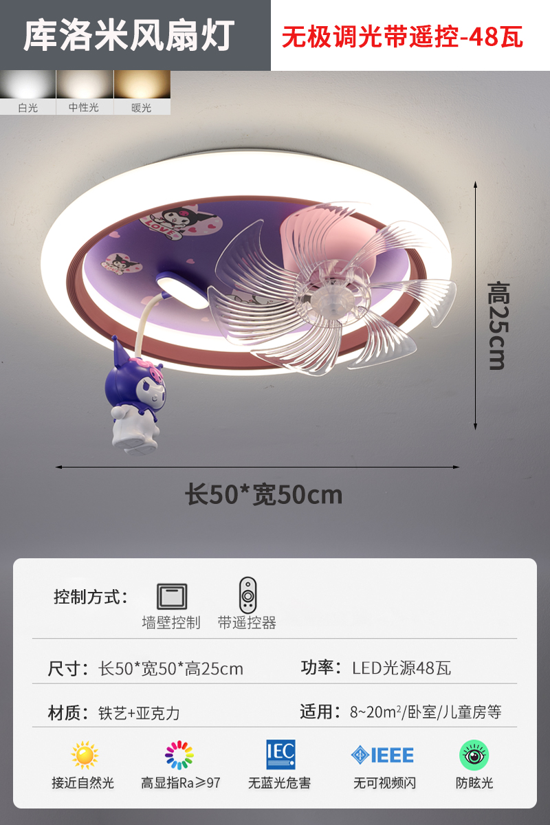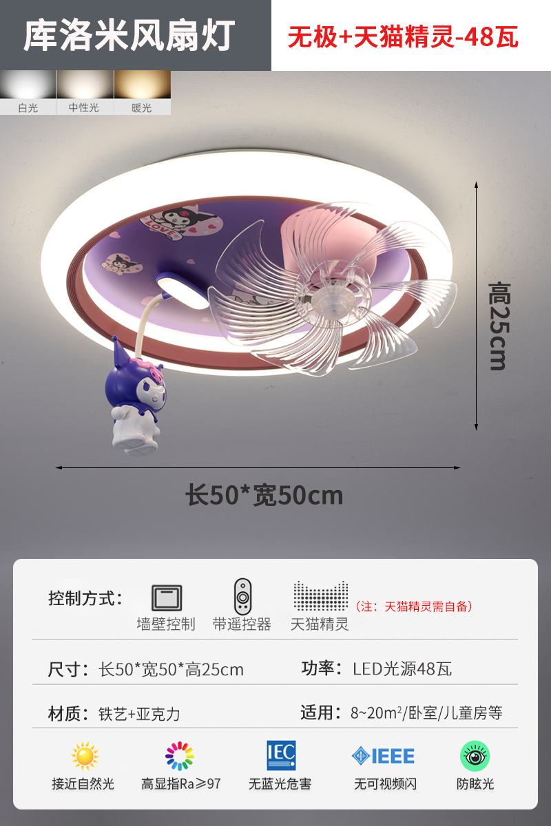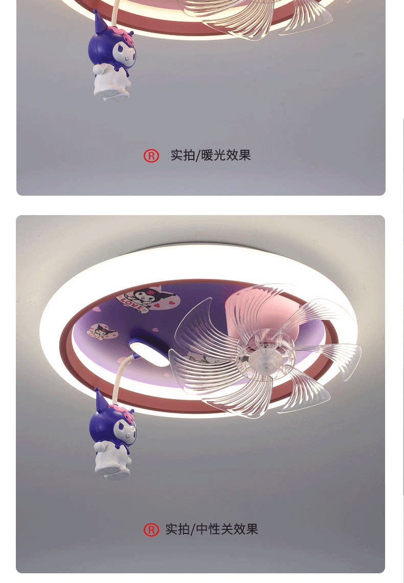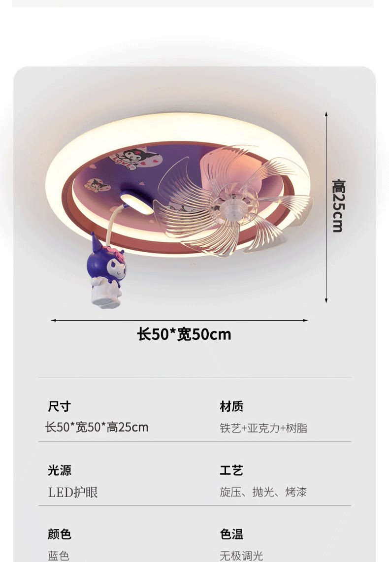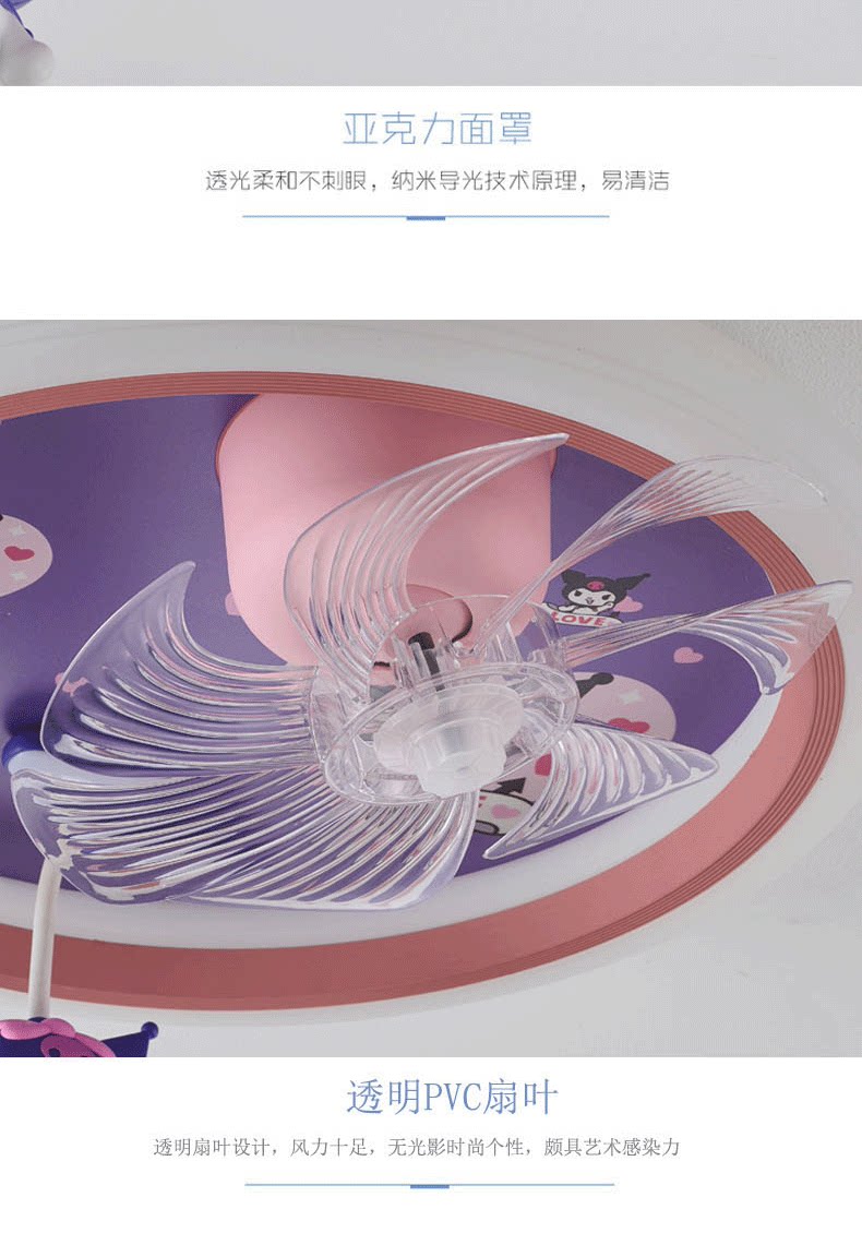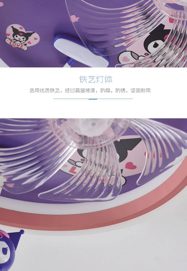 어린이 방 팬 램프 소녀 방 침실 천장 조명 눈 보호 만화 Kuromi 자동 음성 제어 팬 램프