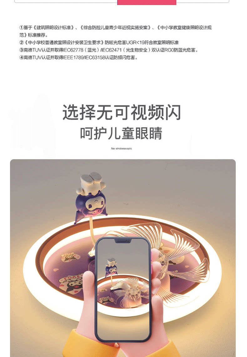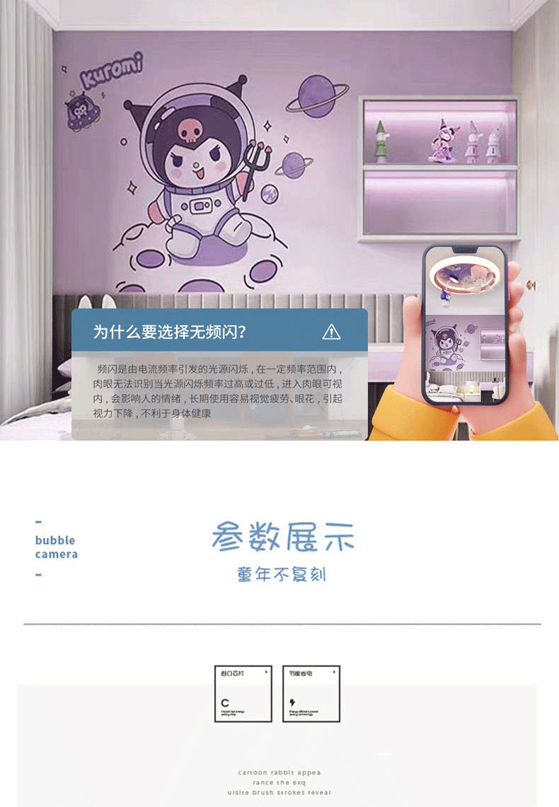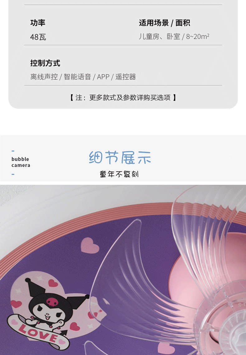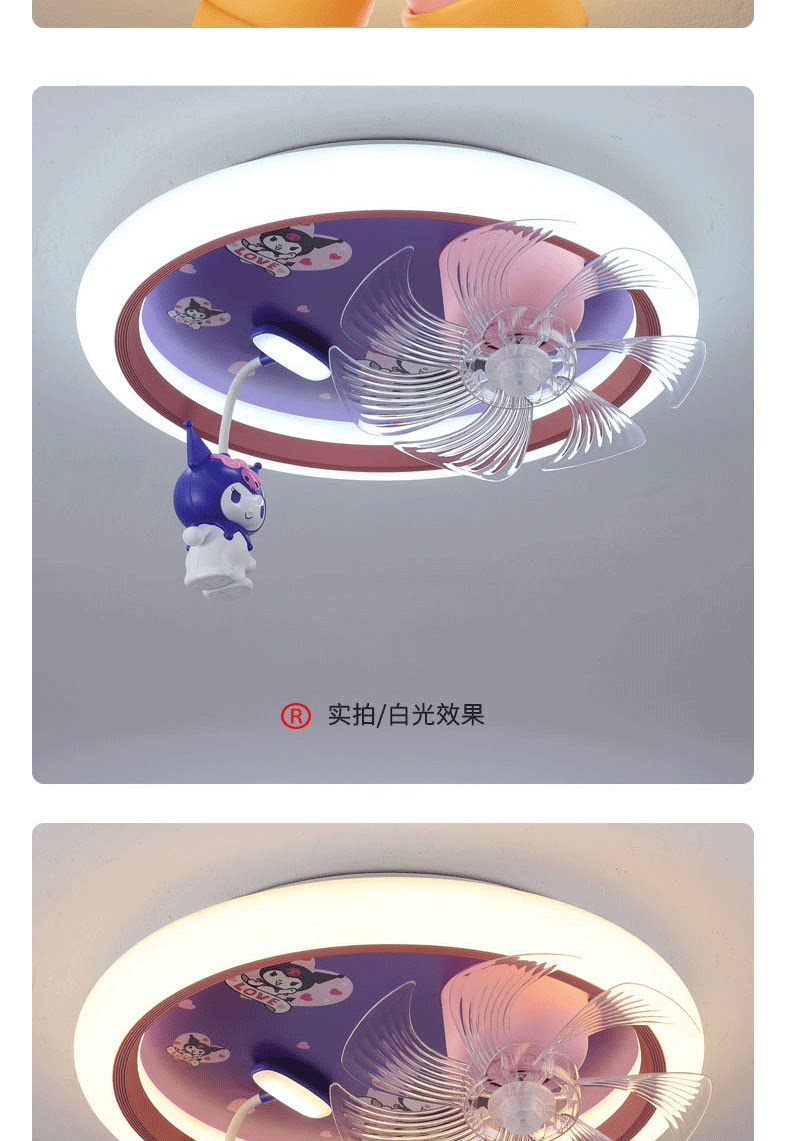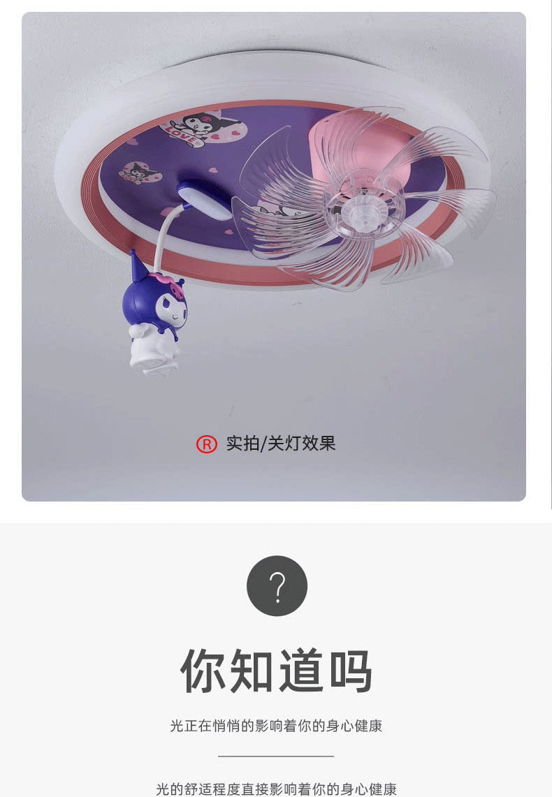 어린이 방 팬 램프 소녀 방 침실 천장 조명 눈 보호 만화 Kuromi 자동 음성 제어 팬 램프스토어 가기