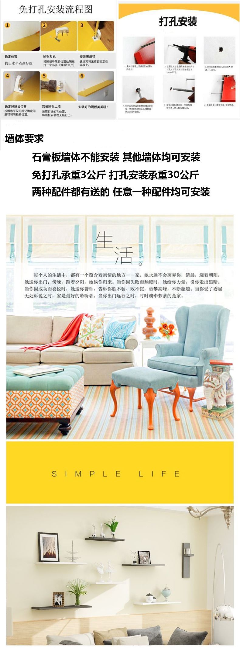 벽걸이 선반, 벽에 구멍을 뚫을 필요 없음, 거실 벽 장식, 벽걸이 침실 벽걸이 책장, 단어 선반스토어 가기