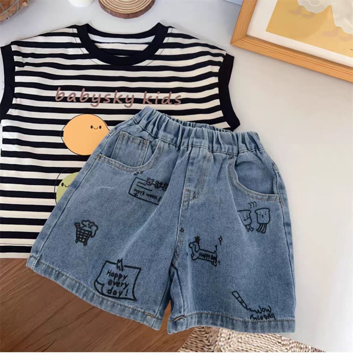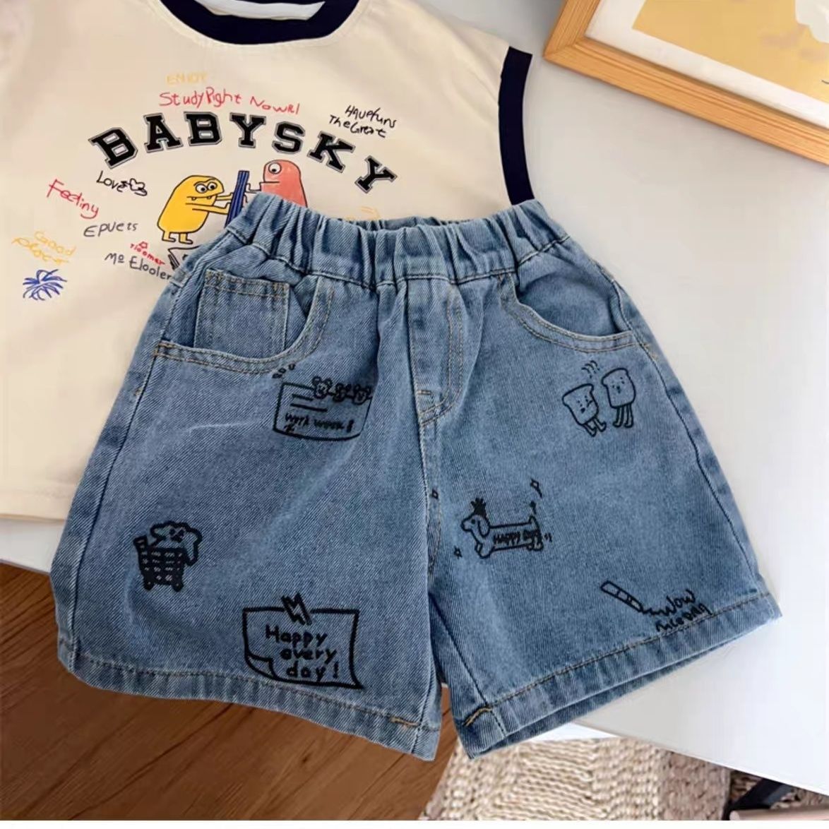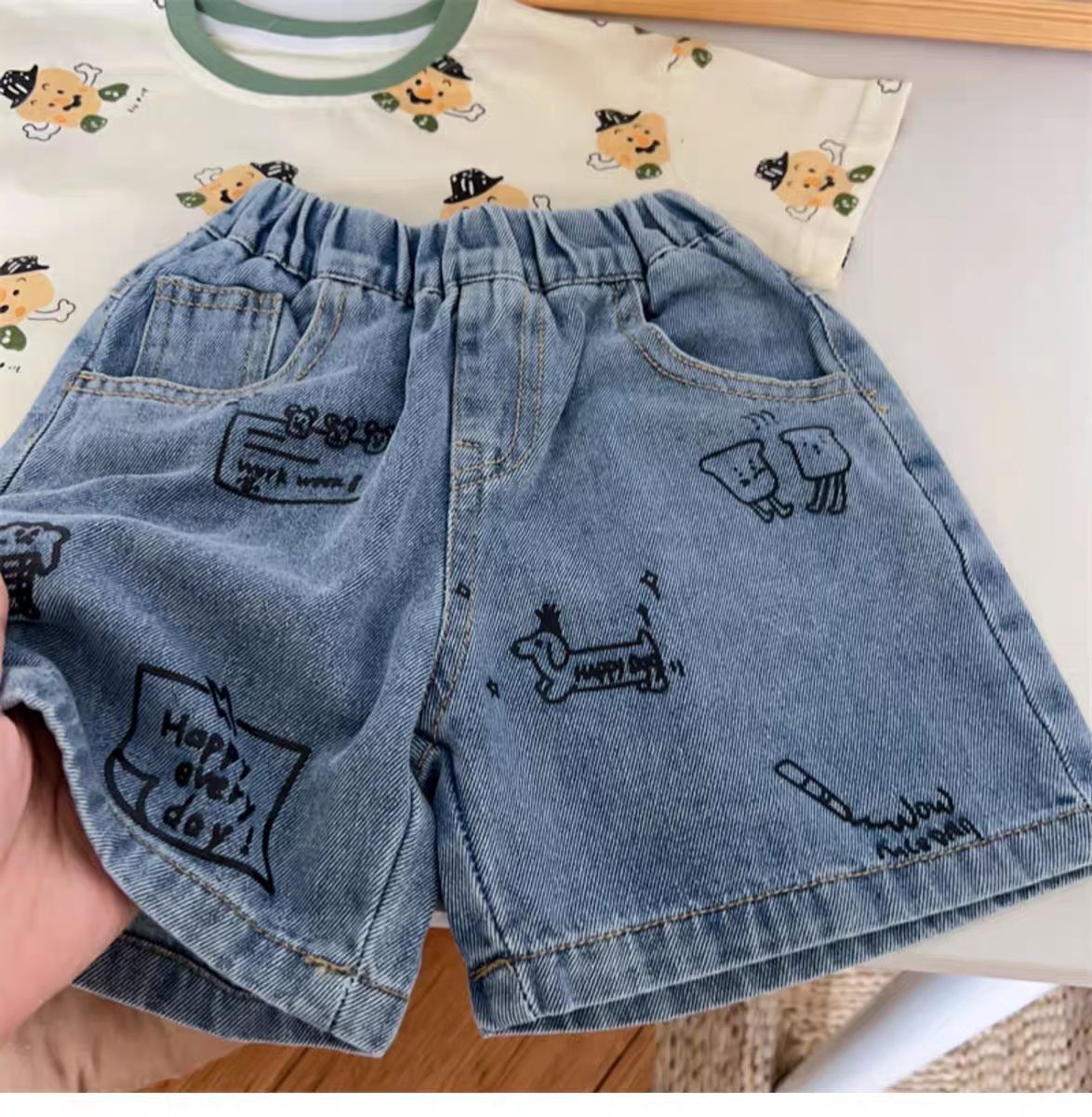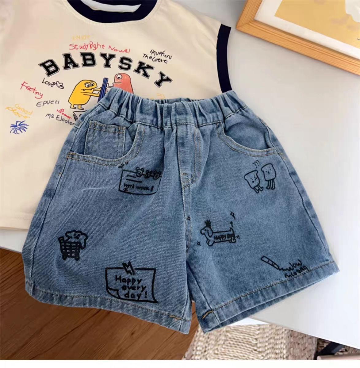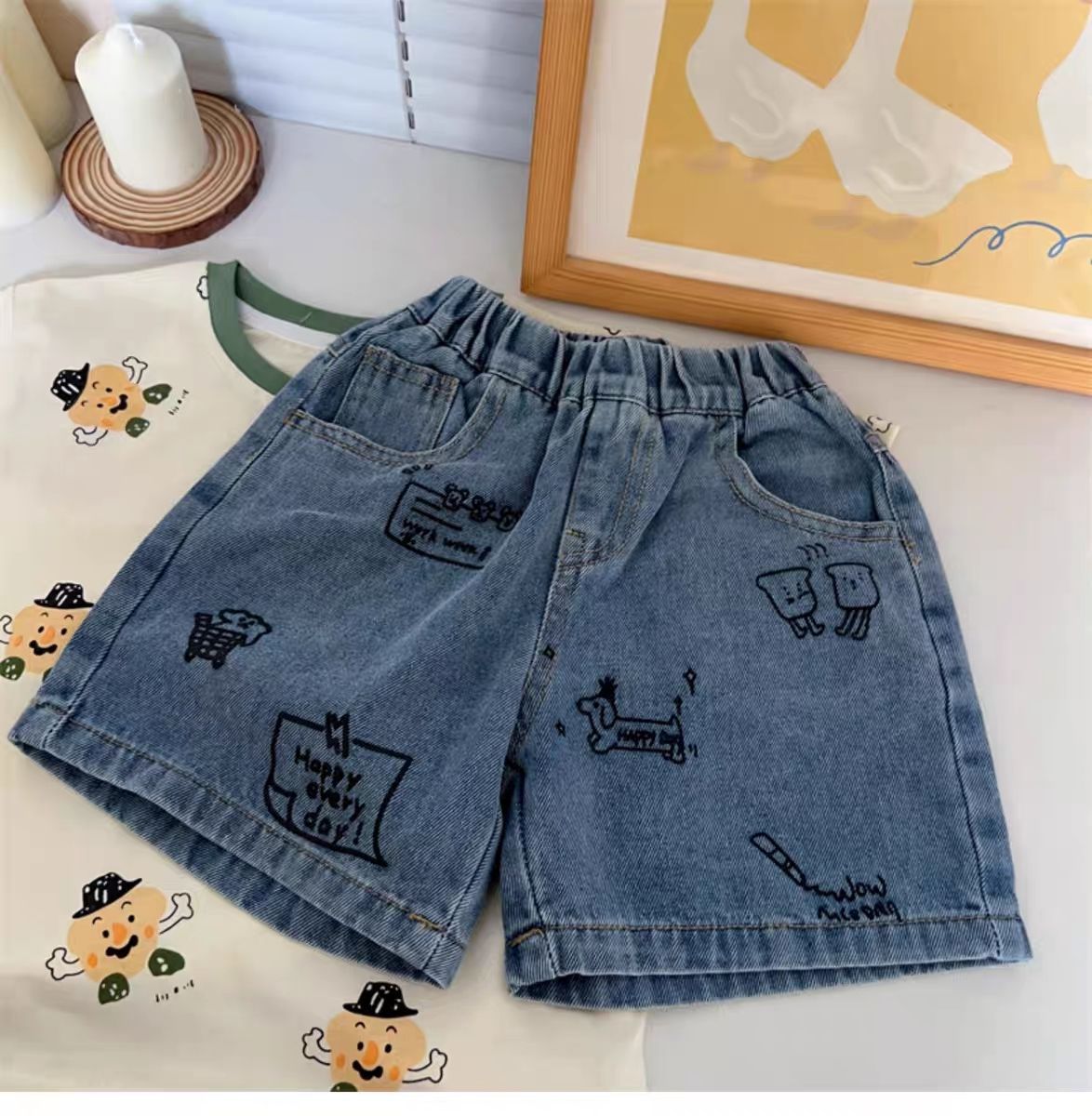아동용 데님 반바지 2025 새로운 여름 소년 한국어 버전 만화 낙서 반바지 중소 어린이를위한 잘 생긴 중간 바지