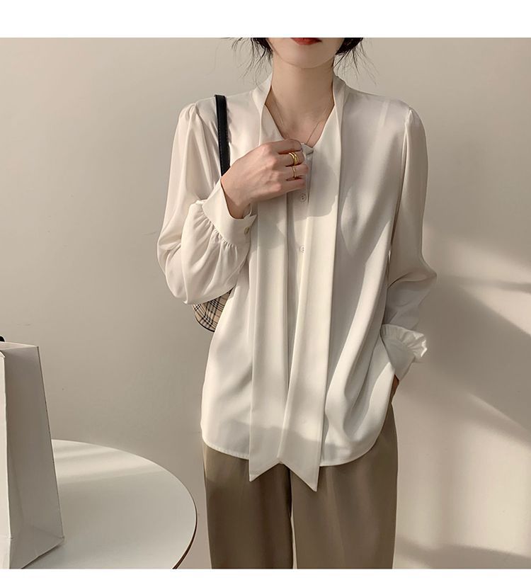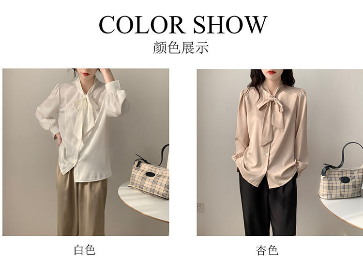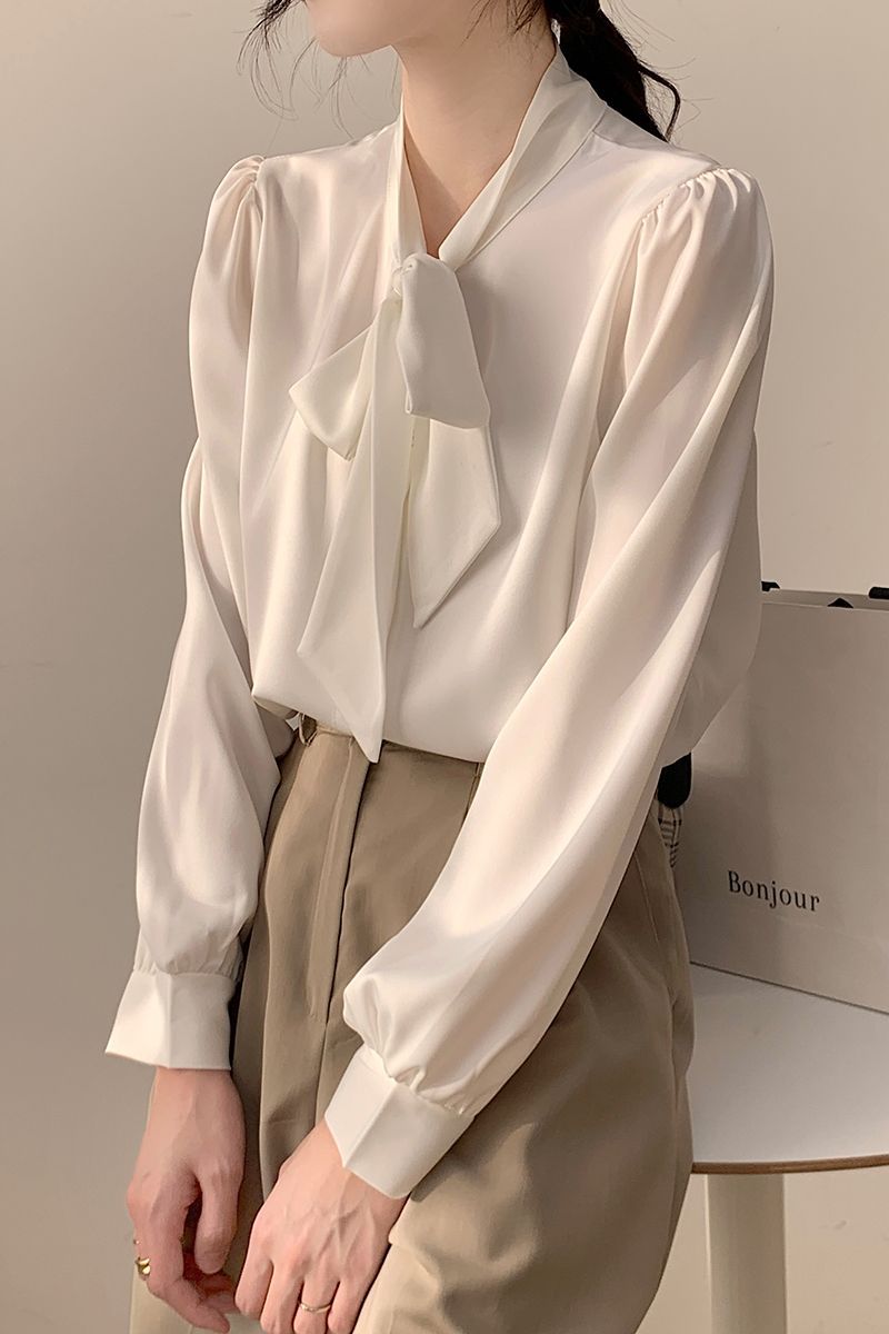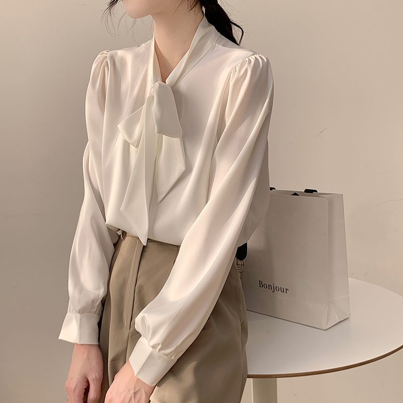 우아한 흰색 긴팔 셔츠 새로운 스타일의 가을 봄 가을 전문 쉬폰 셔츠 캐주얼 여성 나비 넥타이스토어 가기