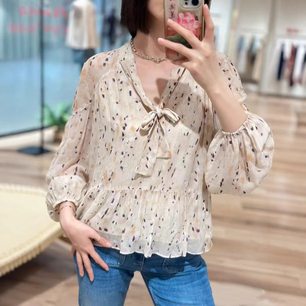25번째 여름 신작 꽃무늬 프린트 탑 브이넥 레이스업 랜턴 슬리브 홀리데이 스타일 셔츠 반팔 프렌치 스타일