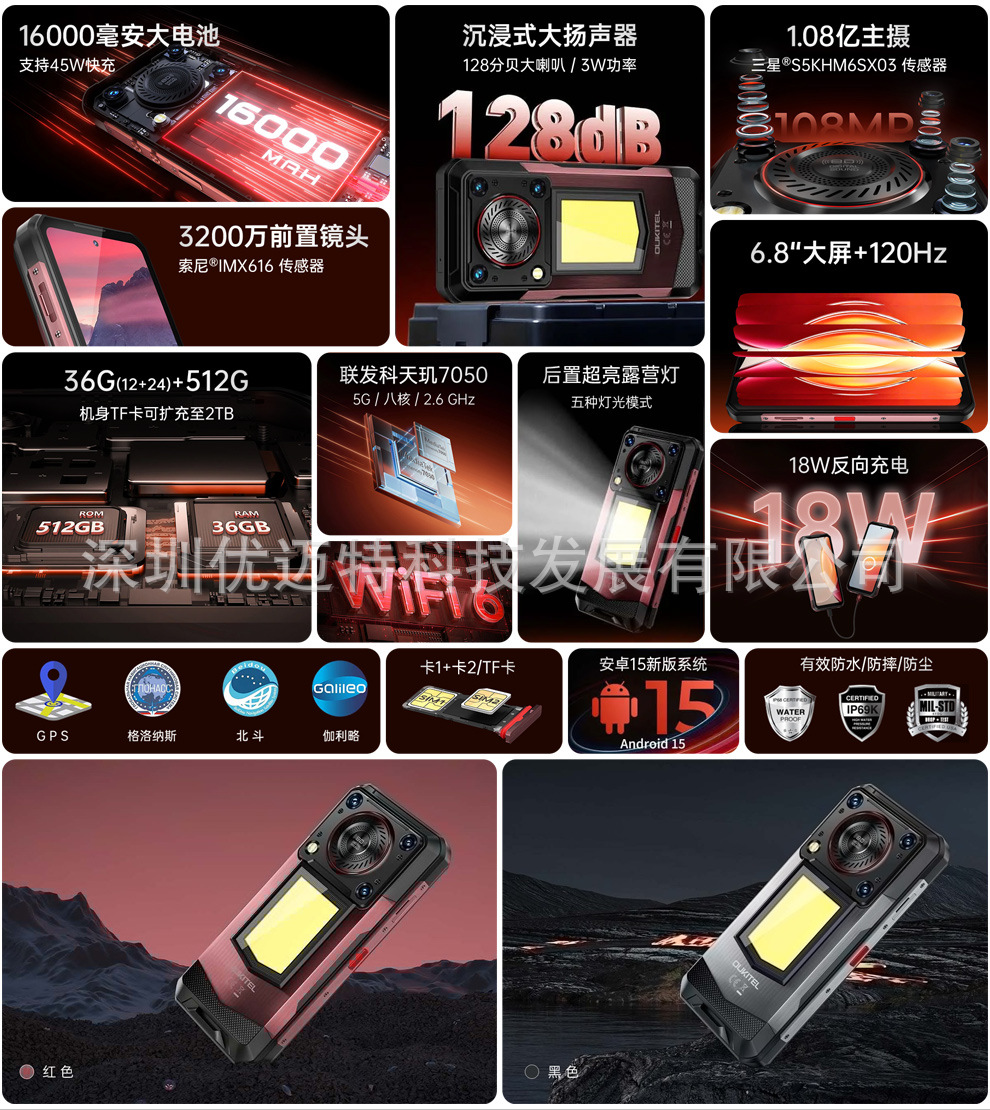 Ouqi WP56 5G 견고한 휴대폰 6.8inch 16000mAh 대형 배터리 12GB+512 안드로이드 15
