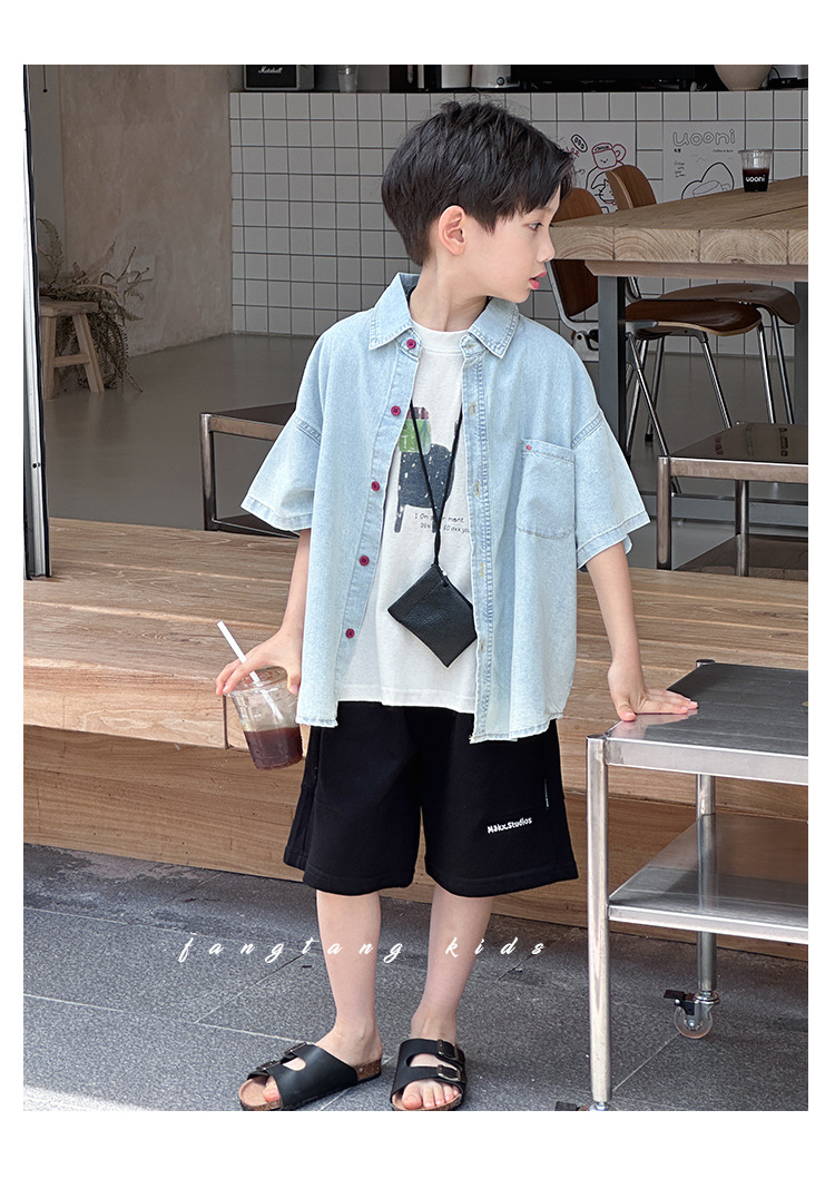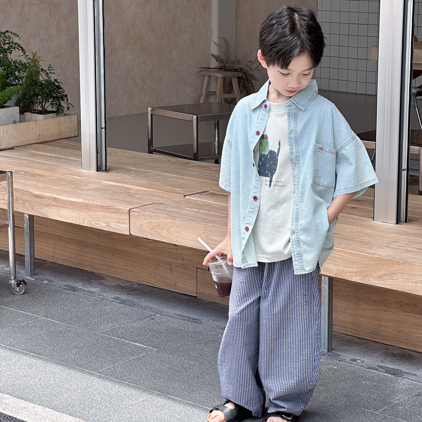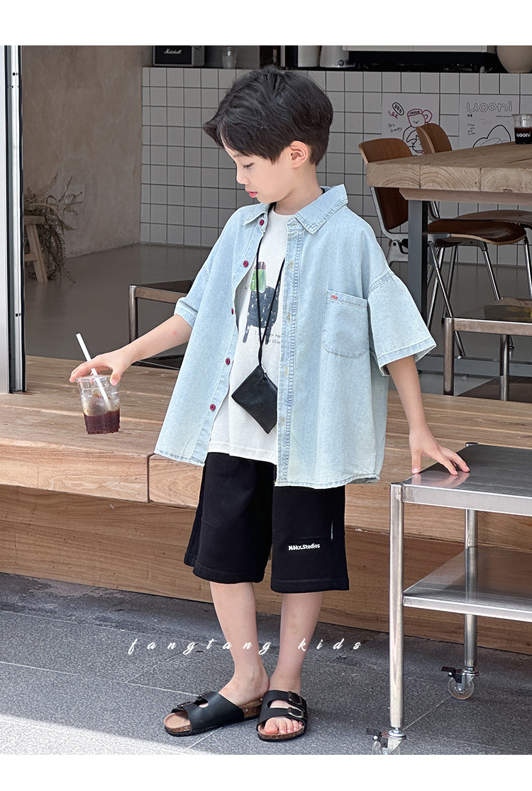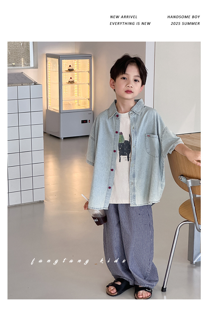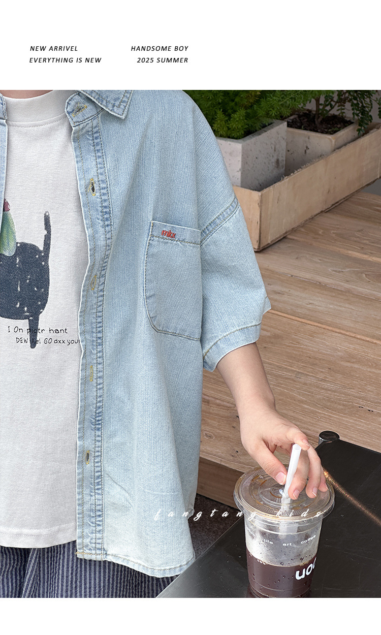 아동 여름 의류 소년 반팔 데님 셔츠 2025 여름 새로운 스타일 중대형 어린이 경량 통기성 캐주얼 셔츠스토어 가기