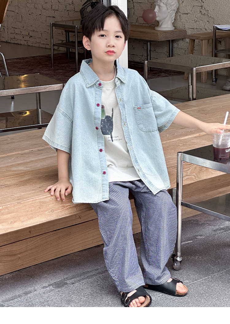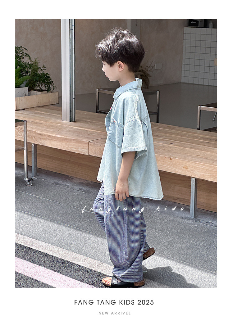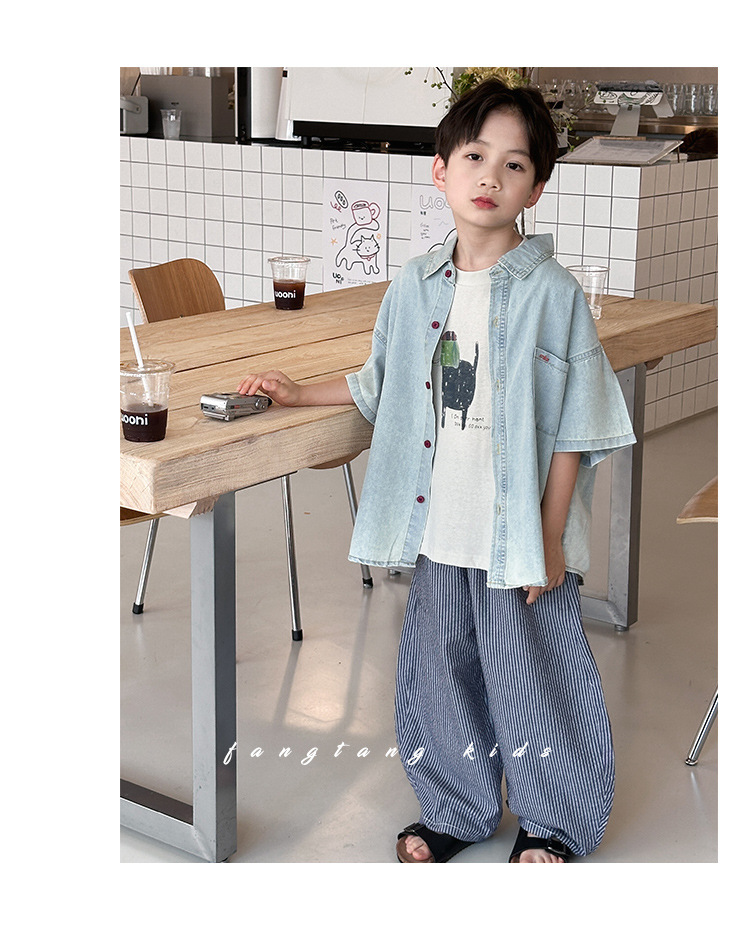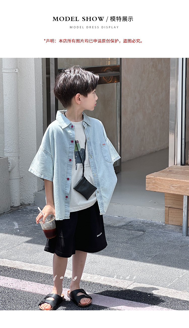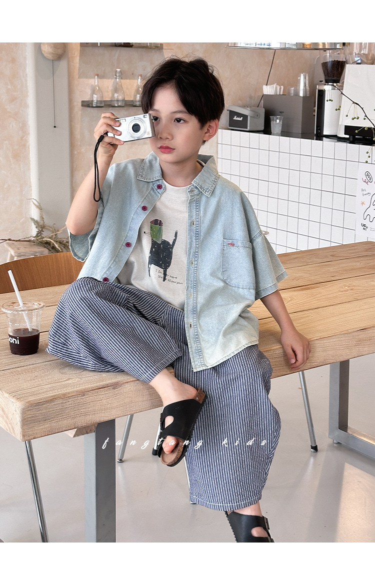 아동 여름 의류 소년 반팔 데님 셔츠 2025 여름 새로운 스타일 중대형 어린이 경량 통기성 캐주얼 셔츠스토어 가기