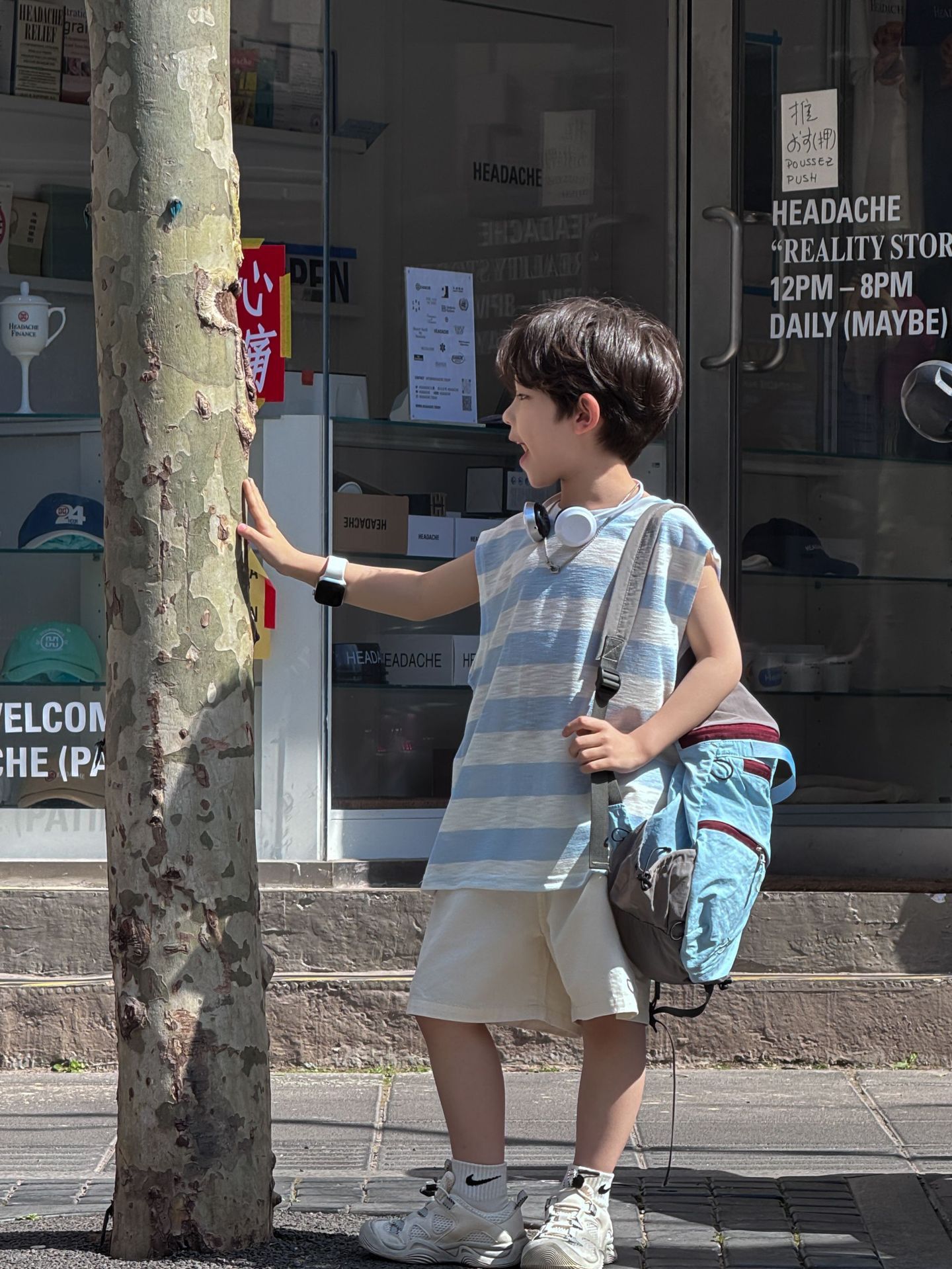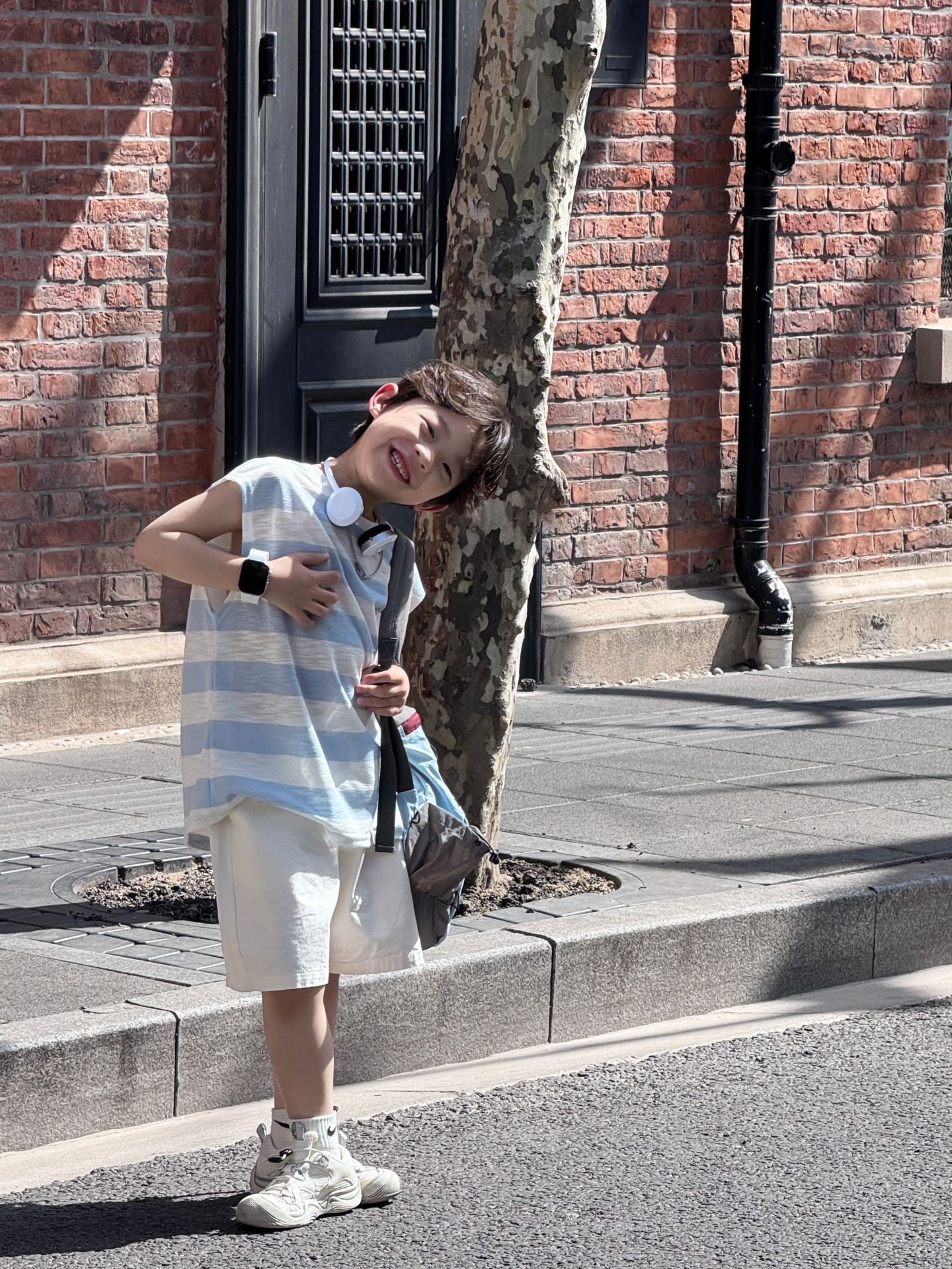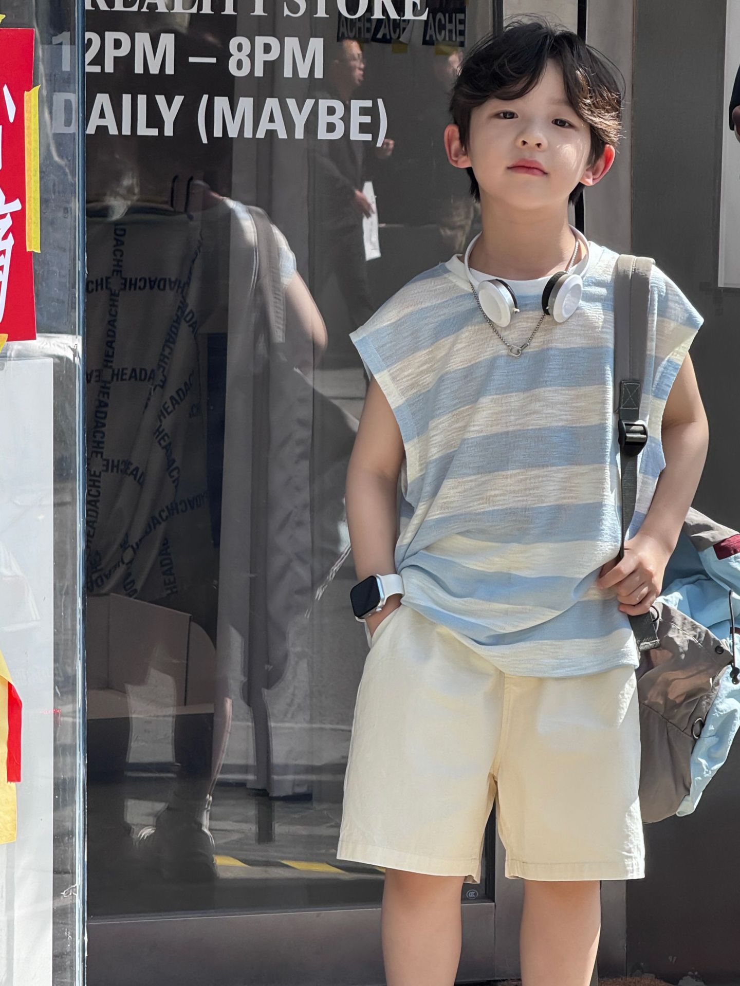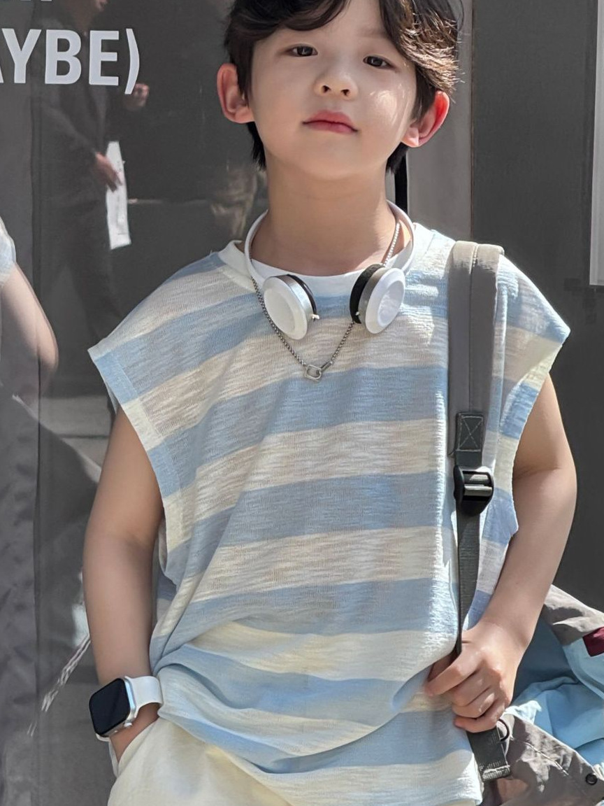 2025 여름 한국 스타일 조끼 정장 소년 통기성과 가벼운 파란색 줄무늬 민소매 면 반바지 중대형 어린이 유행스토어 가기