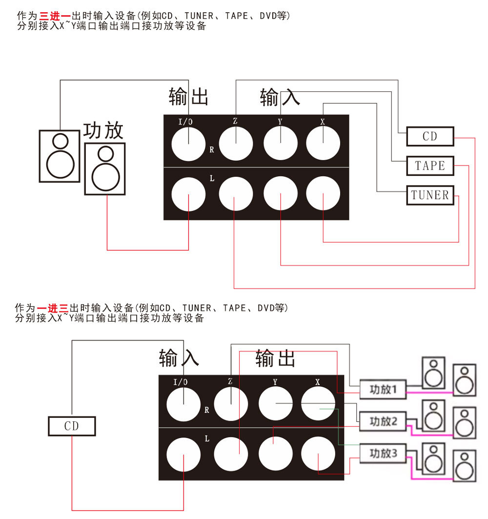 适用范围:1.CD机、数播、机顶盒、收音台、解码器等等信号源与功放(或者有源音箱)之间的切换;2.功放前后级之间的切换。