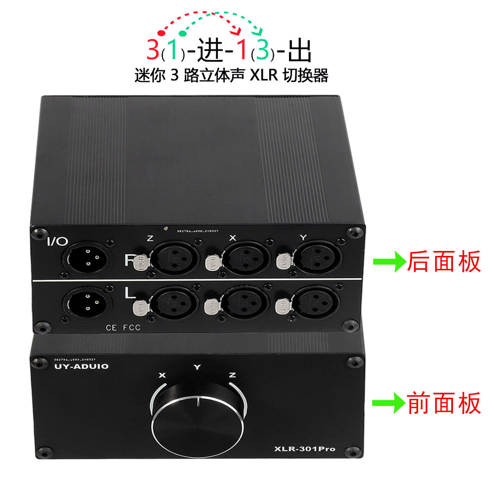 XLR103-Pro 是一款 3 路无源立体声音频切换器。它支持 3 个立体声 XLR 输入和 1 个输出(或 1 个输入和 3 切一输出)。您可以根据您的音频设备自由选择,无需供电。