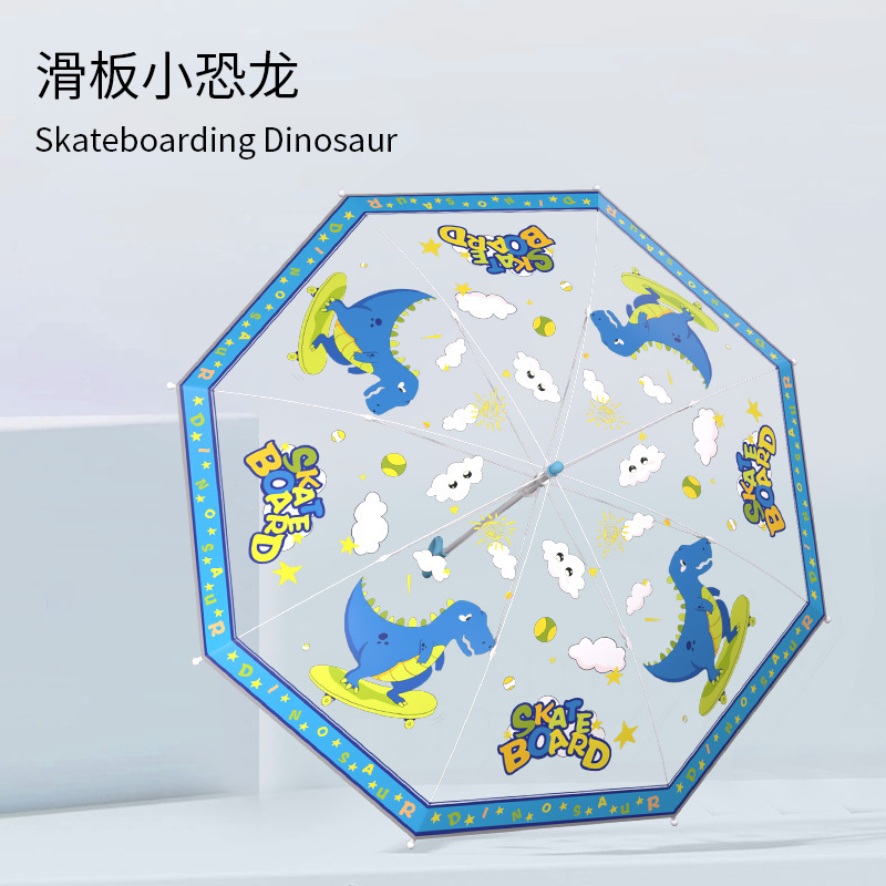• 8본 어린이용 투명(반사 스트립) 안전 핀치 방지 긴 우산 - 스케이트보드 공룡