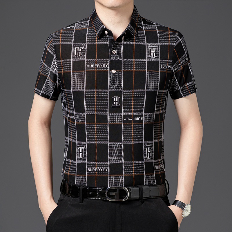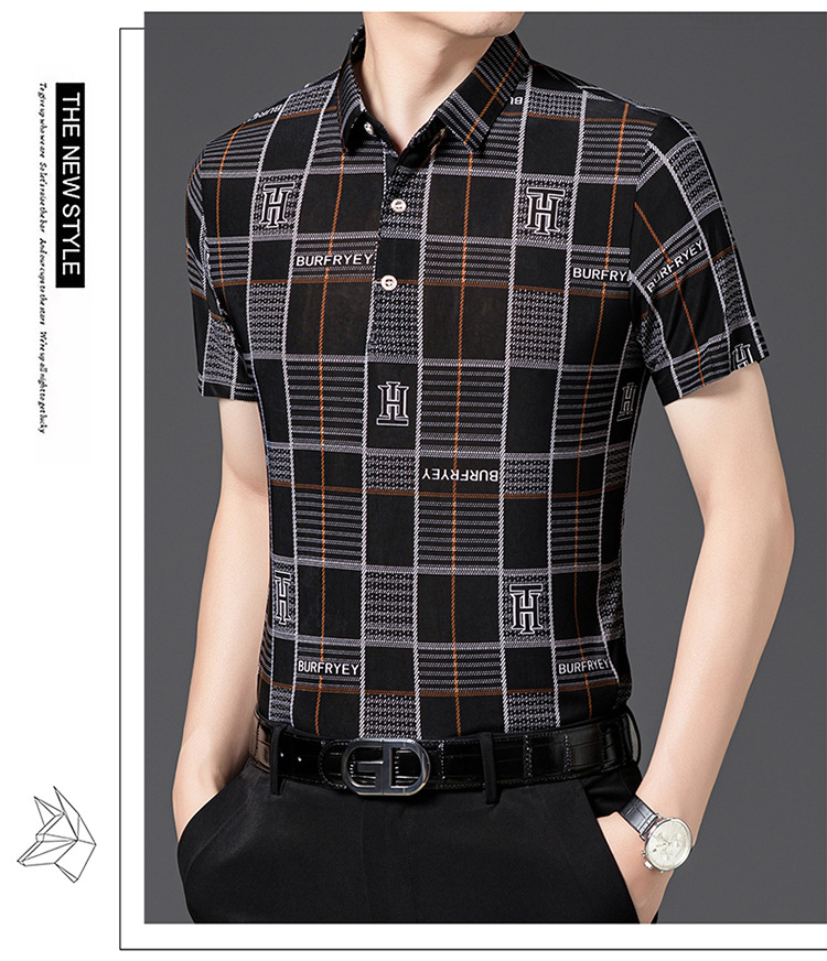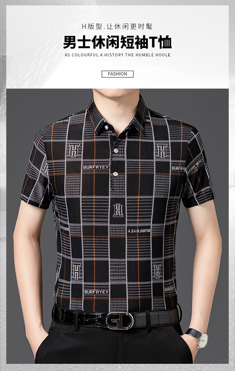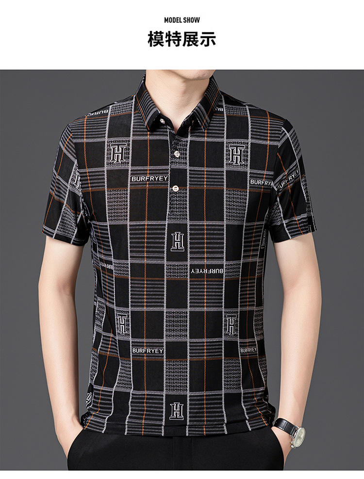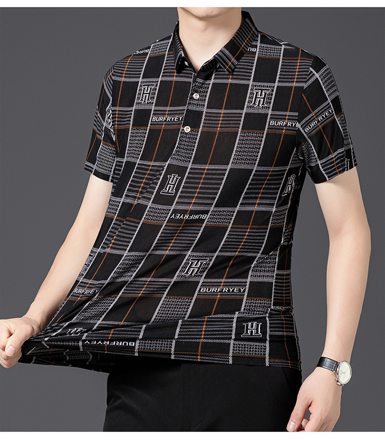 반팔 폴로 셔츠 여름 남성 패션 체크 무늬 프린트 티셔츠 라펠 중년 남성 얇은 반팔 탑 티셔츠