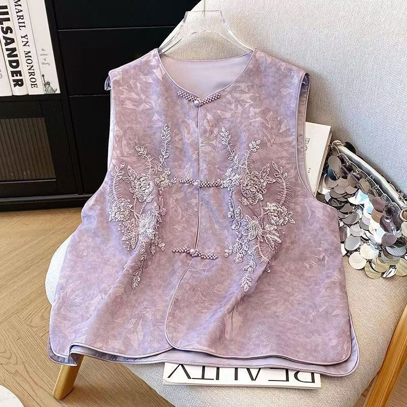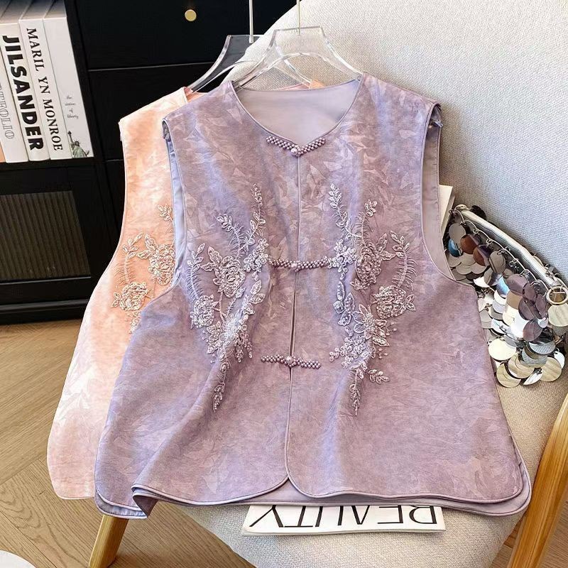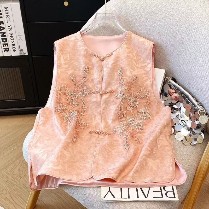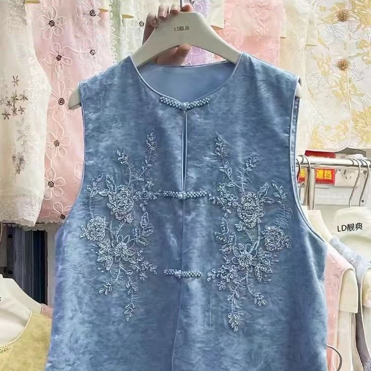 여성을위한 새로운 중국 스타일 국립 스타일 자카드 구슬 꽃 조끼 2025 여름 스타일 부드러운 기질 어머니 착용 가벼운 조끼 탑