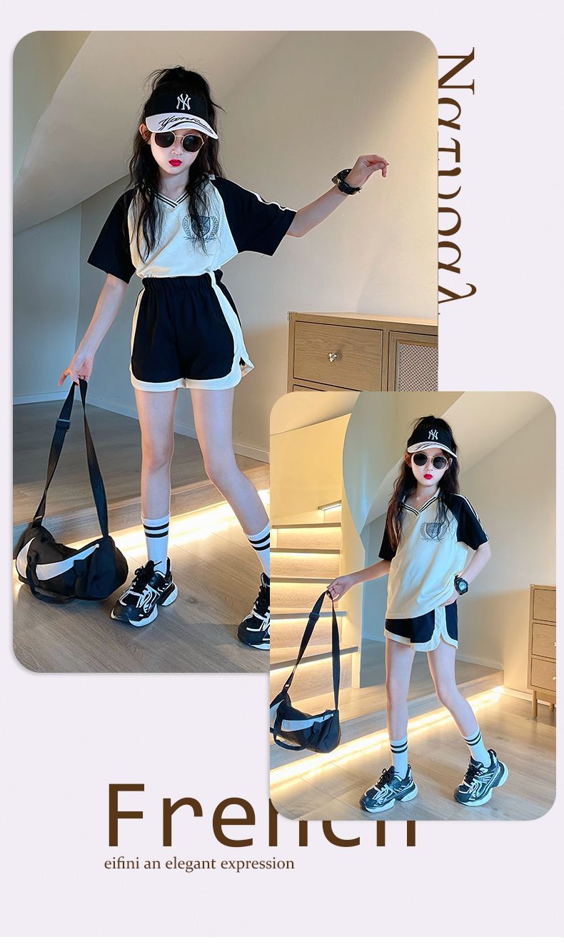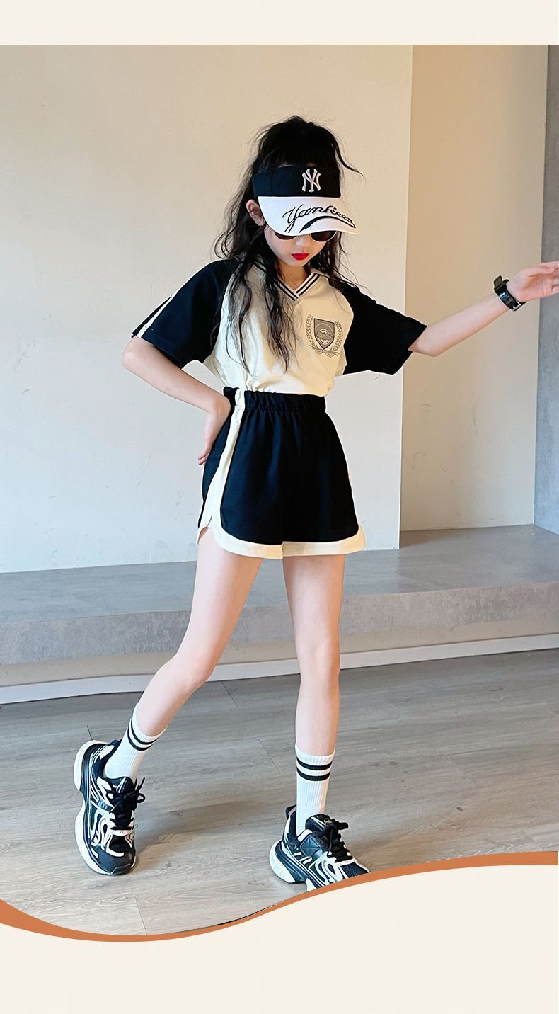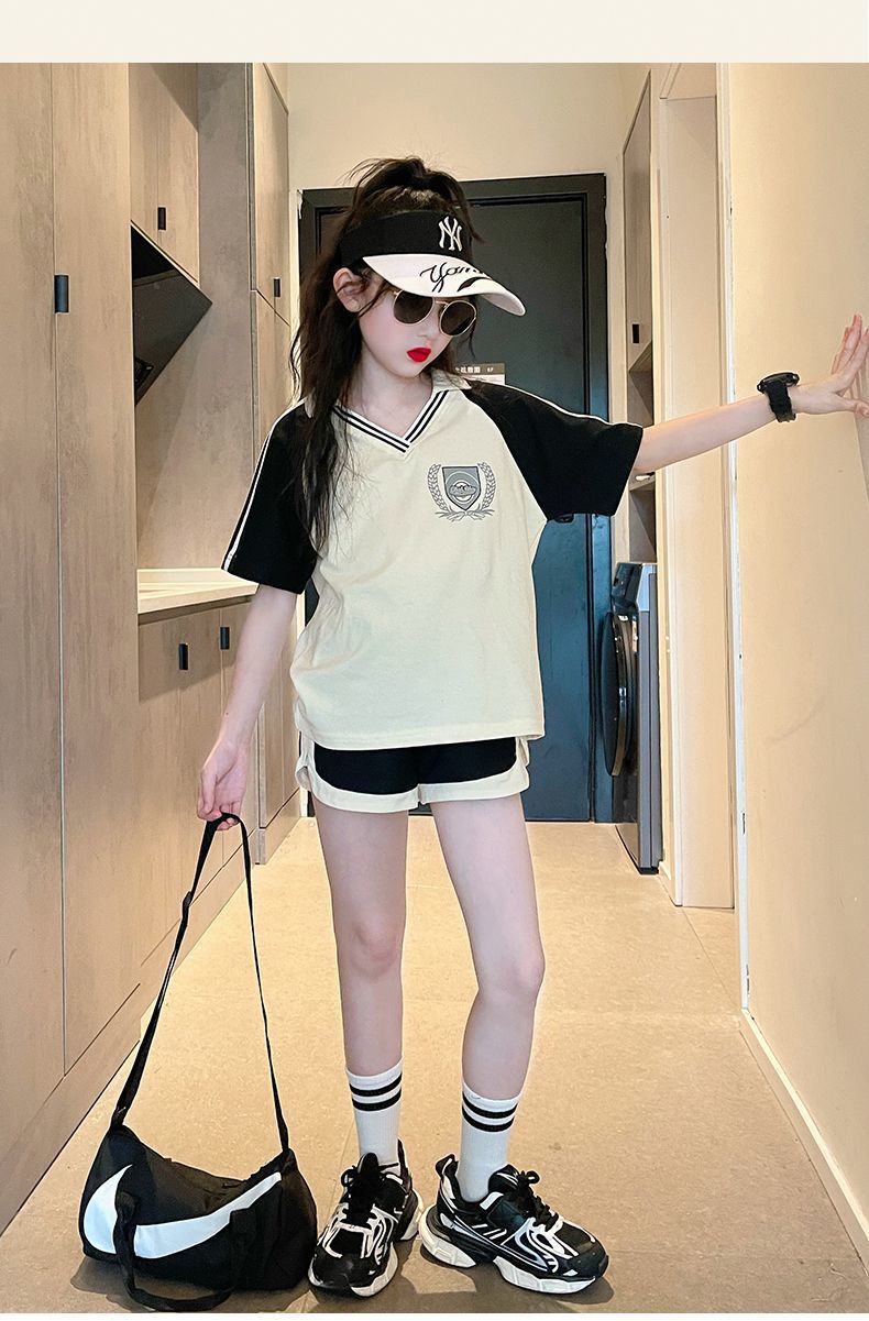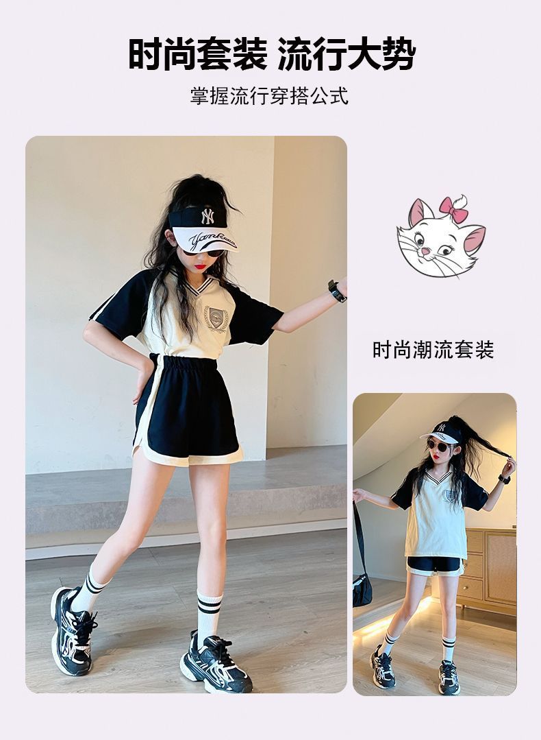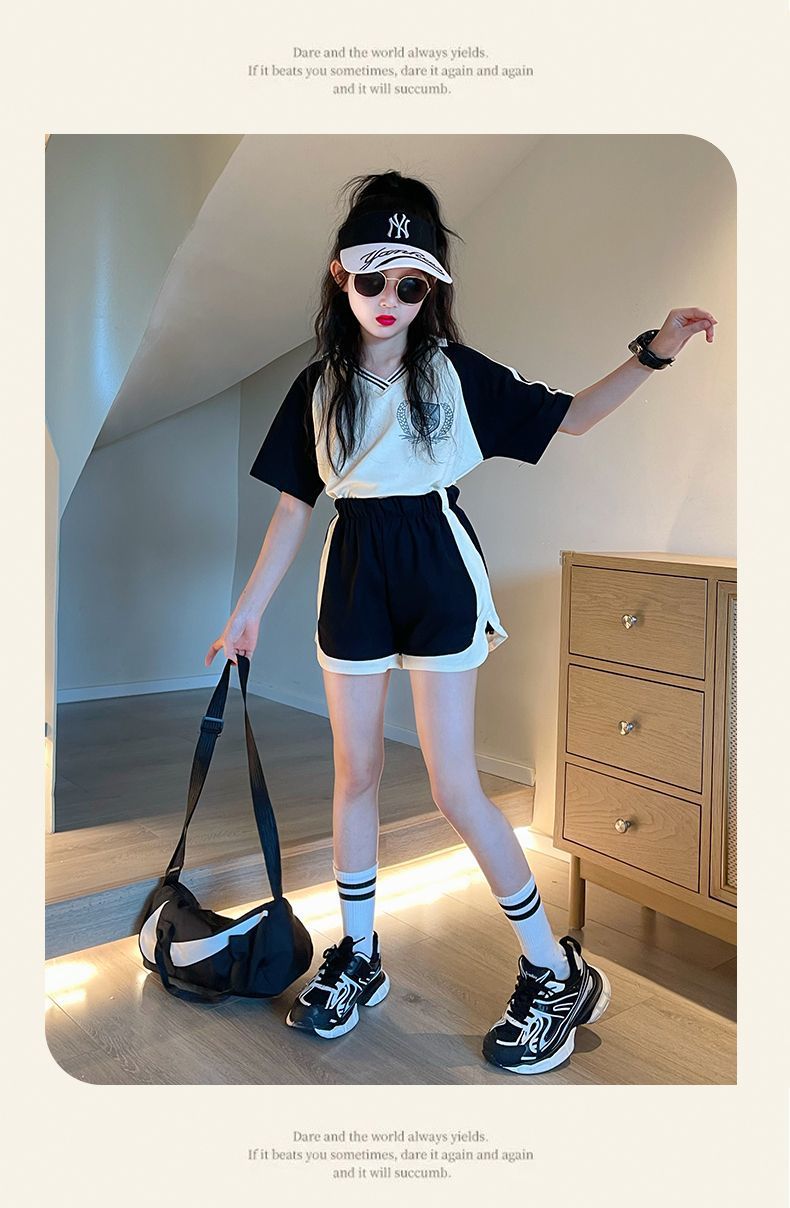 여아 반팔 양복, 여름 옷, 아동 한국식 캐주얼 스트리트 스타일 여아 스포츠 티셔츠, 루즈한 반바지 투피스 세트스토어 가기