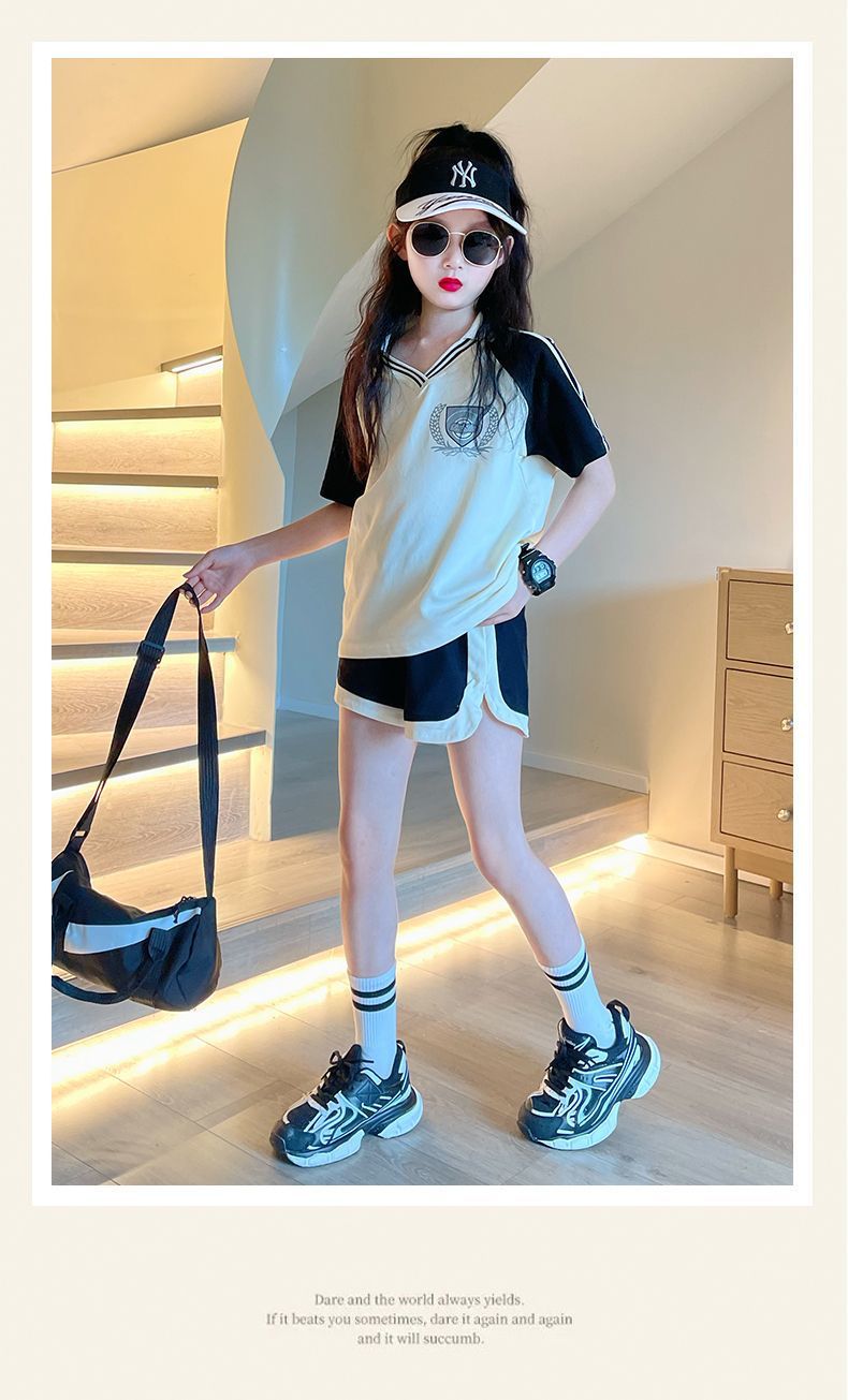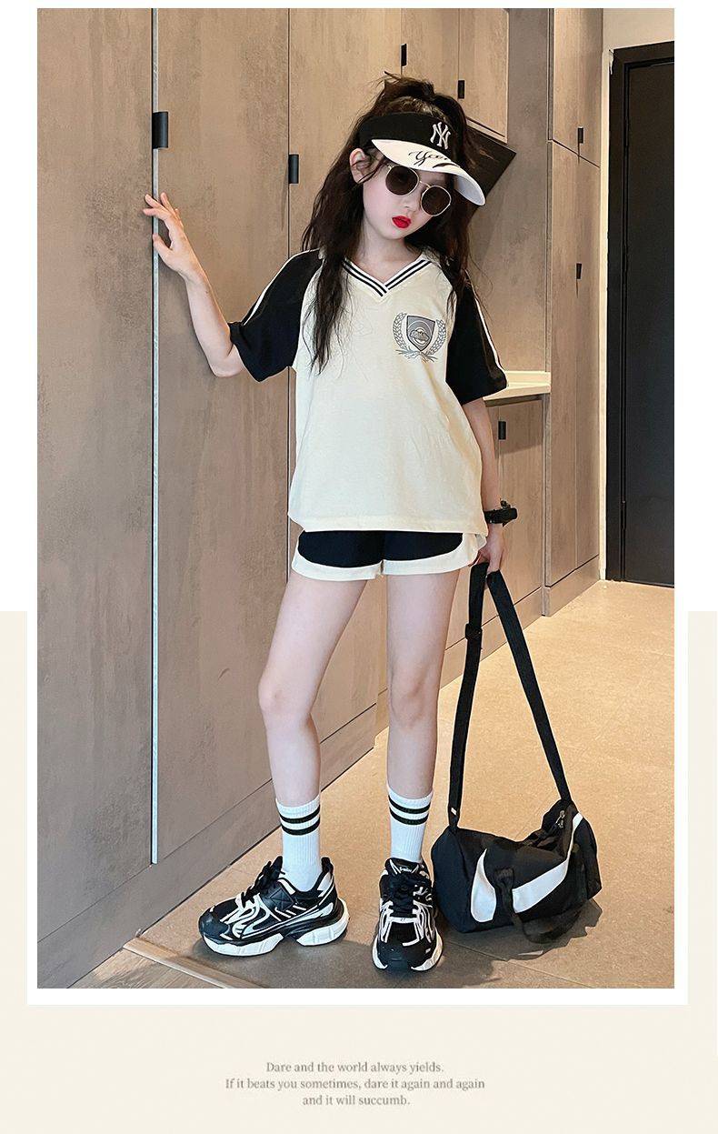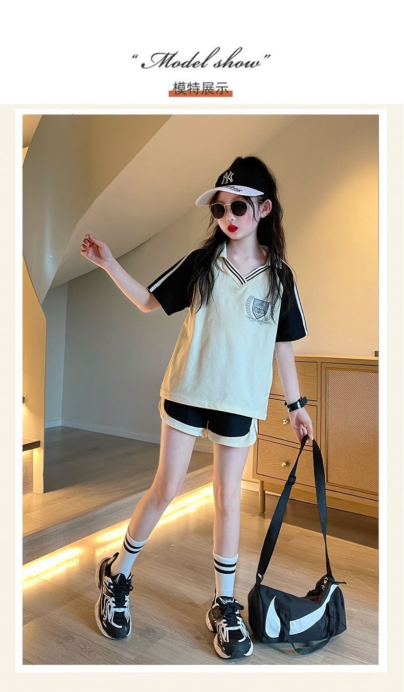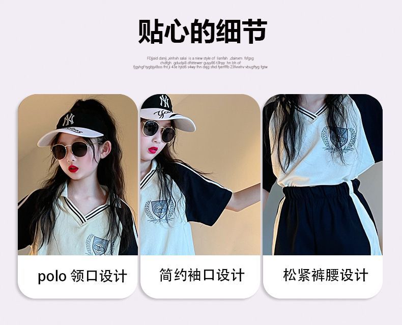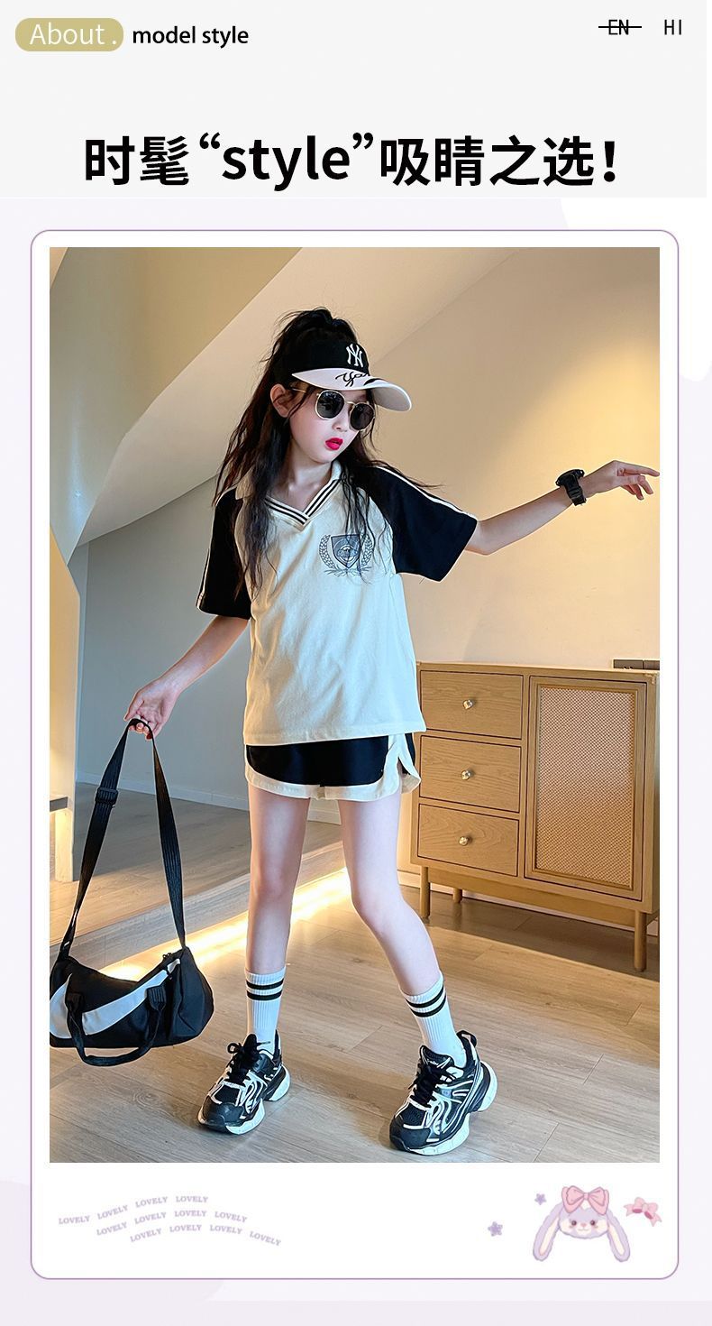 여아 반팔 양복, 여름 옷, 아동 한국식 캐주얼 스트리트 스타일 여아 스포츠 티셔츠, 루즈한 반바지 투피스 세트스토어 가기