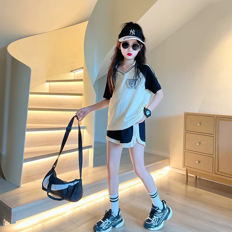 여아 반팔 양복, 여름 옷, 아동 한국식 캐주얼 스트리트 스타일 여아 스포츠 티셔츠, 루즈한 반바지 투피스 세트