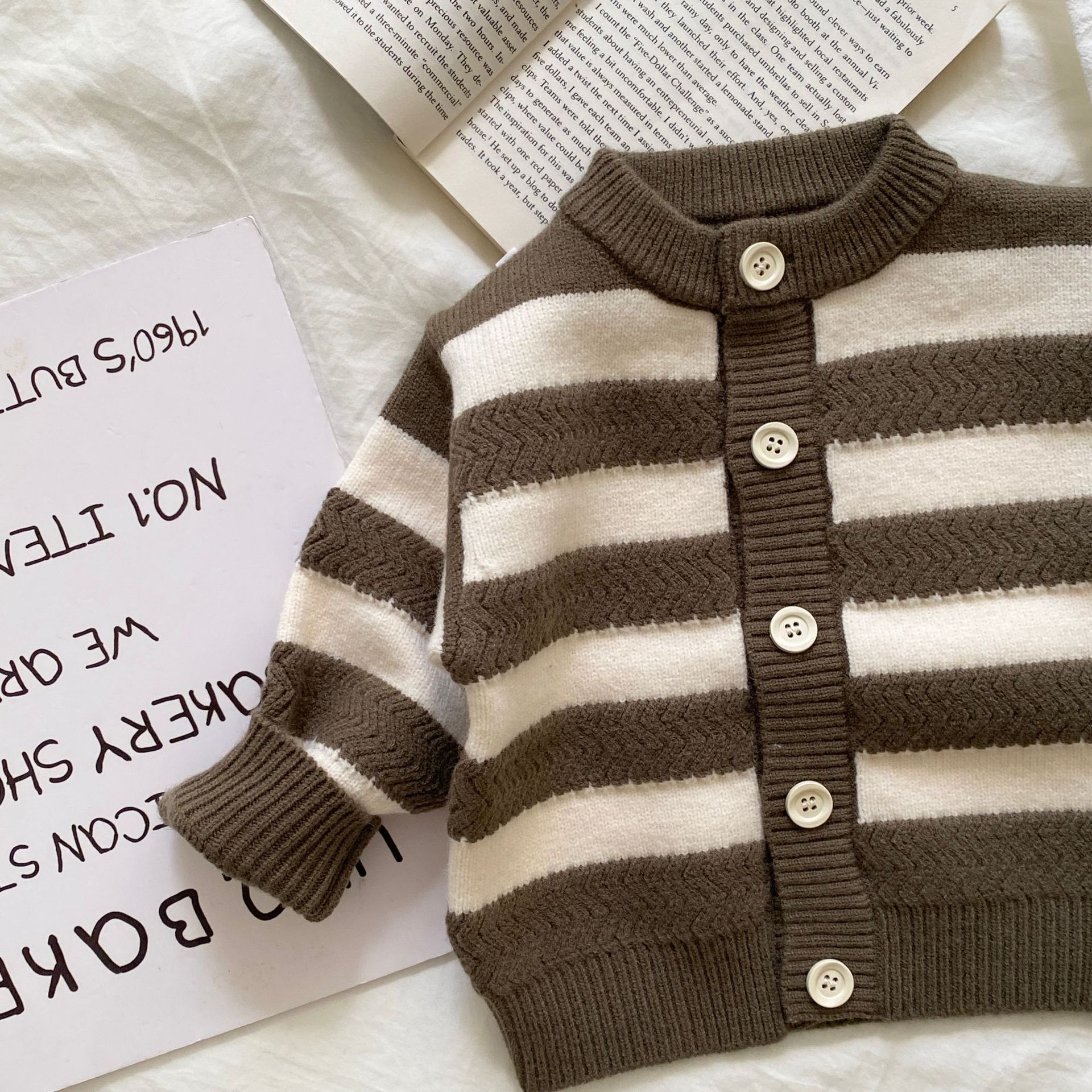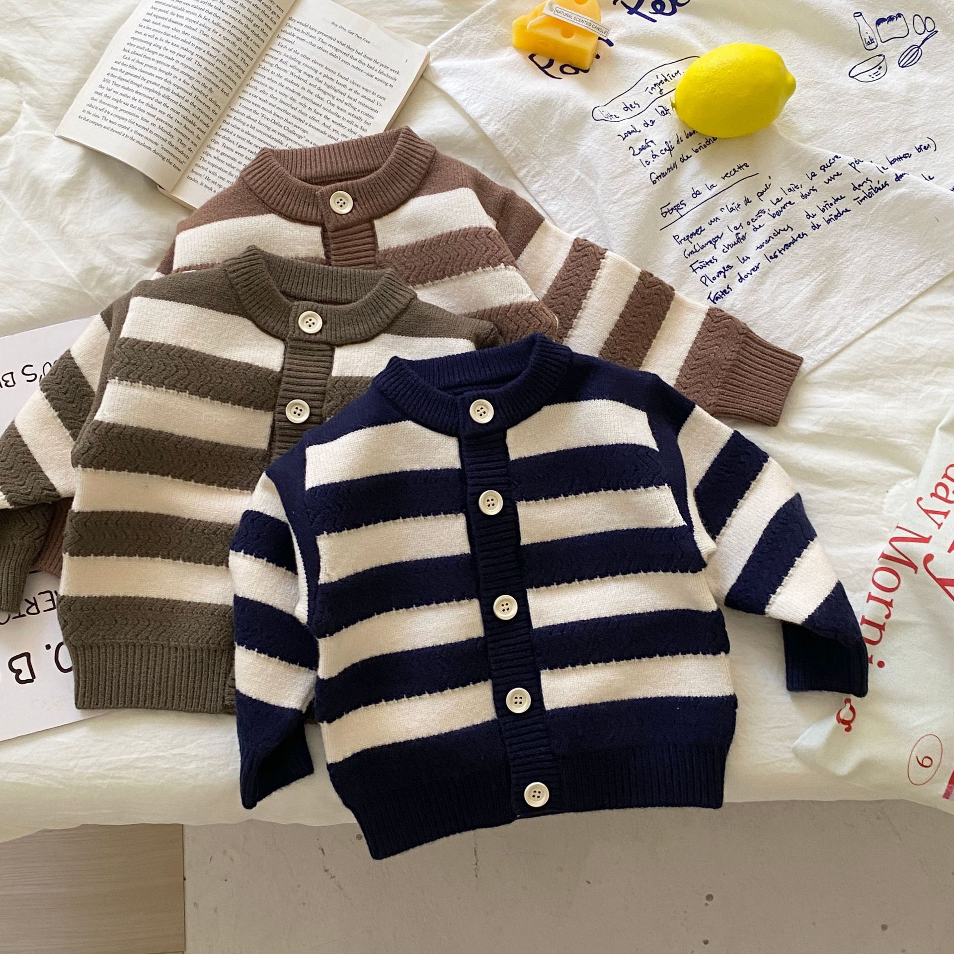 영유아 스웨터, 남녀 가을옷, 둥근 칼라 스트라이프 긴팔 니트 가디건 상의와 팬츠 투피스 세트스토어 가기