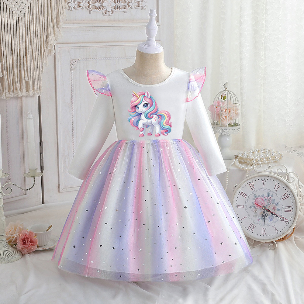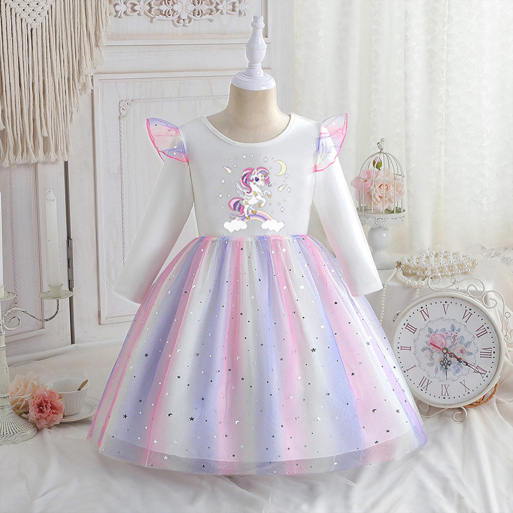 여자 드레스 긴팔 봄, 가을 새로운 어린이 스커트 아동 의류 퍼프 스커트 소녀 공주 드레스 유니콘 레인보우