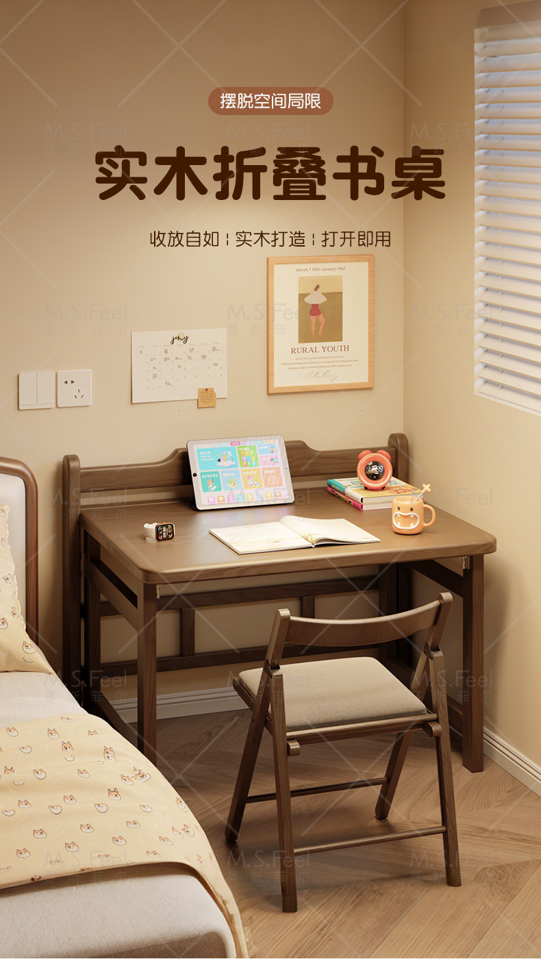 • 라이트 체리 컬러 100CM 접이식 책상 + 두꺼운 원목 의자, 설치 없이 문앞까지 배송