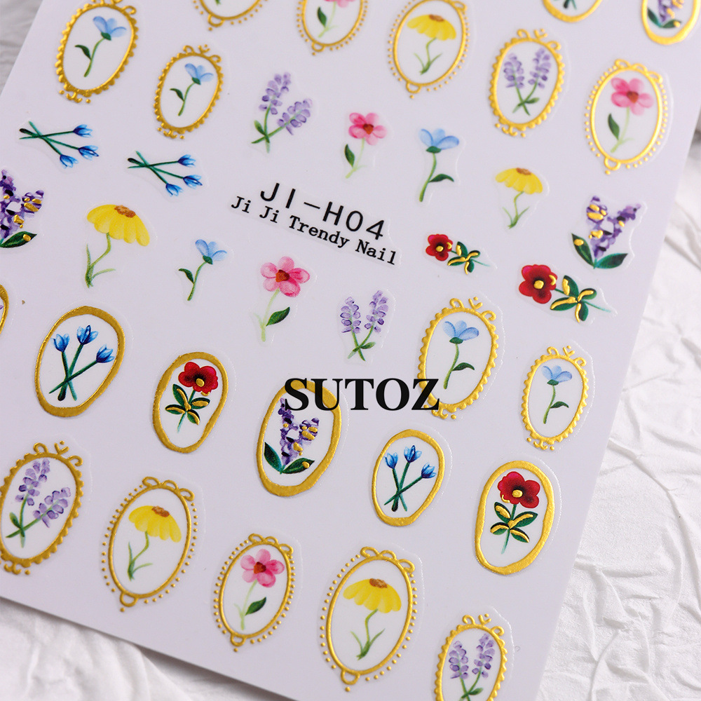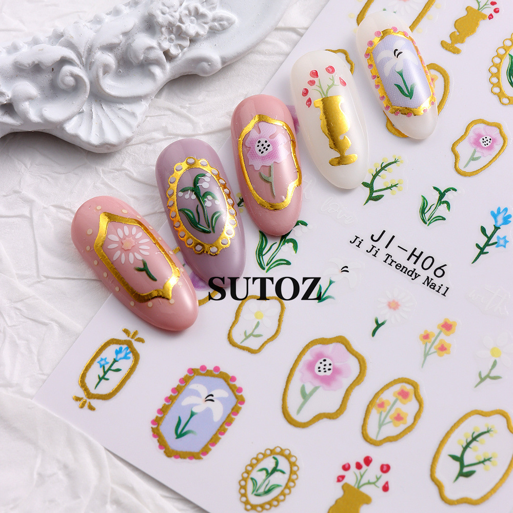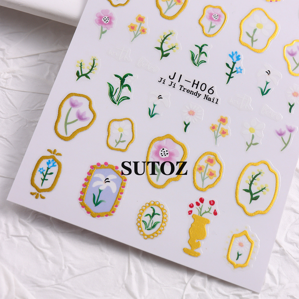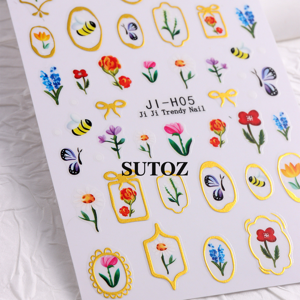 국경 간 새로운 네일 아트 스티커 핫 스탬핑 복고풍 사진 프레임 봄과 여름 꽃 꿀벌 네일 접착 스티커 네일