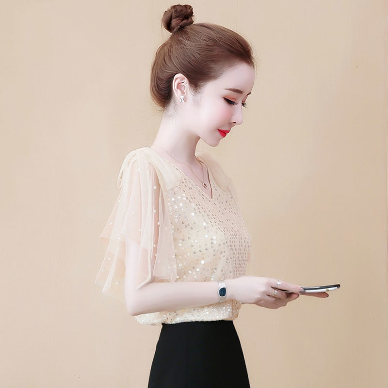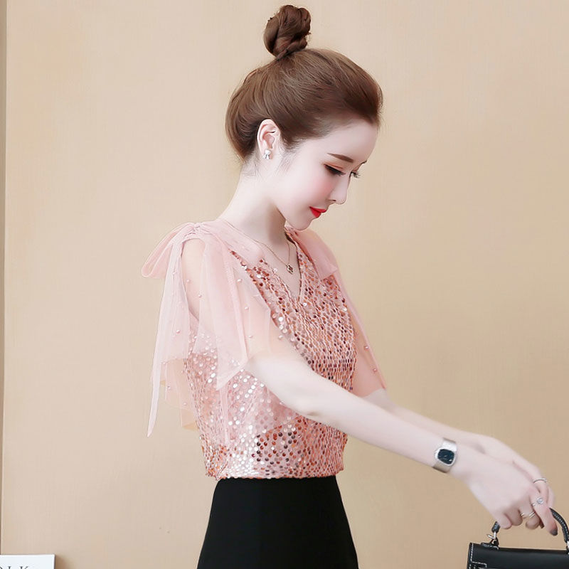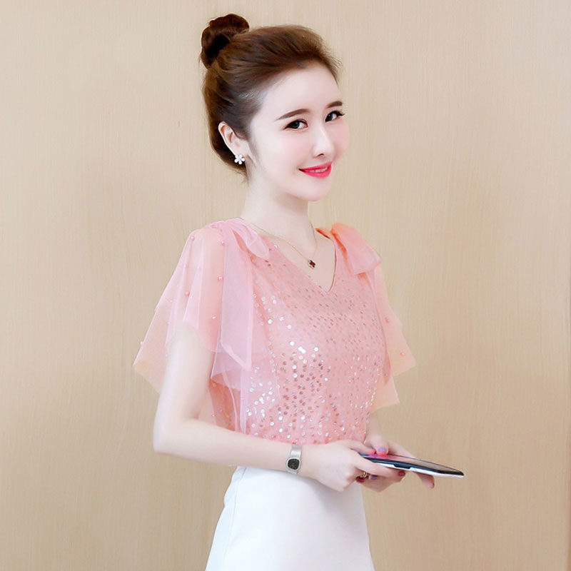 여름 레이스 탑 슈퍼 요정 쉬폰 셔츠 여성 여름 착용 2025 새로운 반팔 오프 숄더 스타일 셔츠스토어 가기
