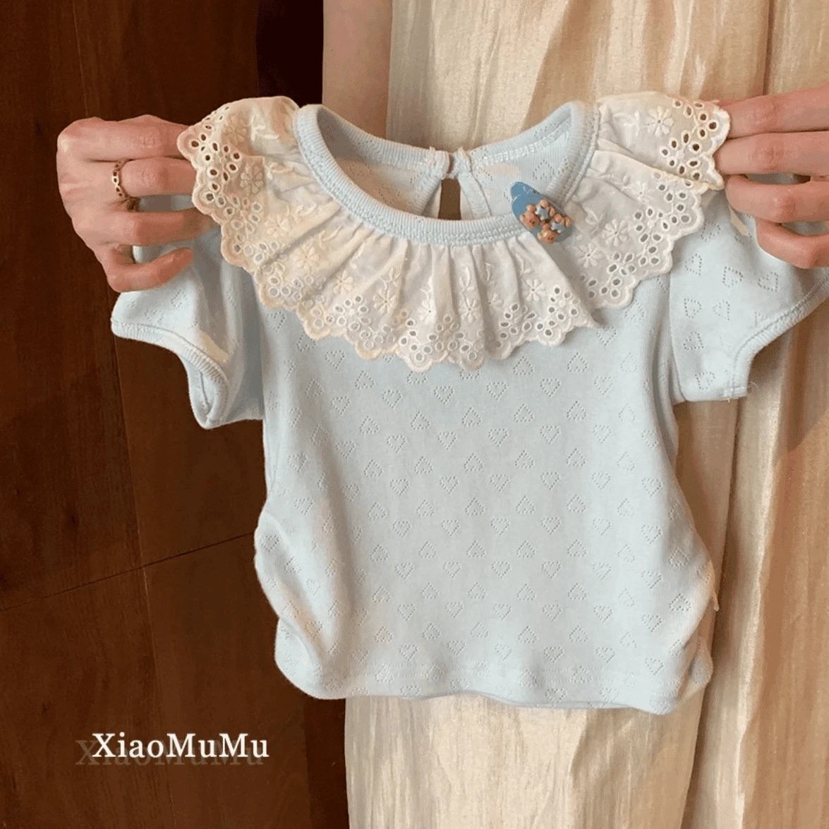여자 반팔 레이스 티셔츠 2025 여름 새 여자 아기 패션 캐주얼 다목적 옷깃 탑