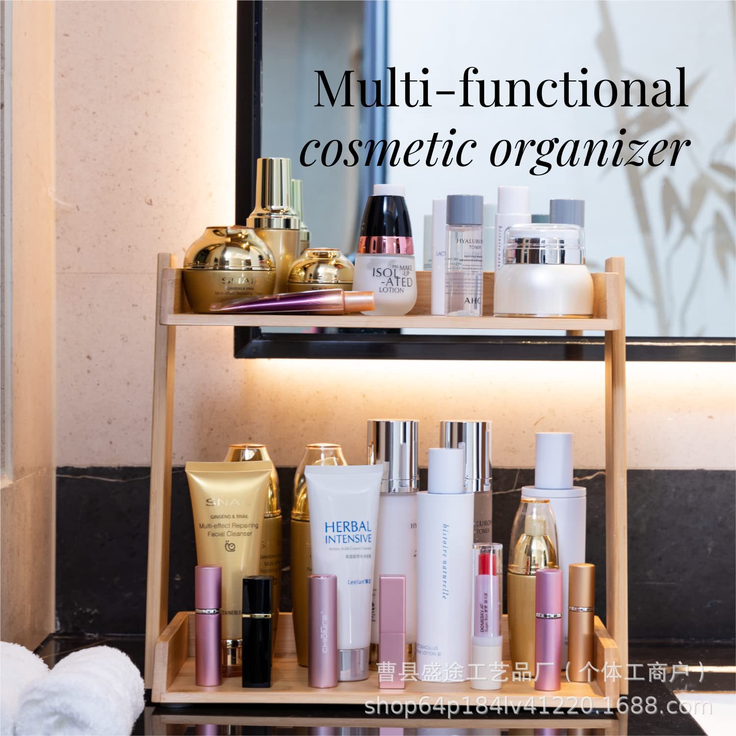 대나무 보관 상자 욕실 세면 용품 보관함 Nan Bamboo 데스크탑 더블 레이어 립스틱 화장품 보관함스토어 가기