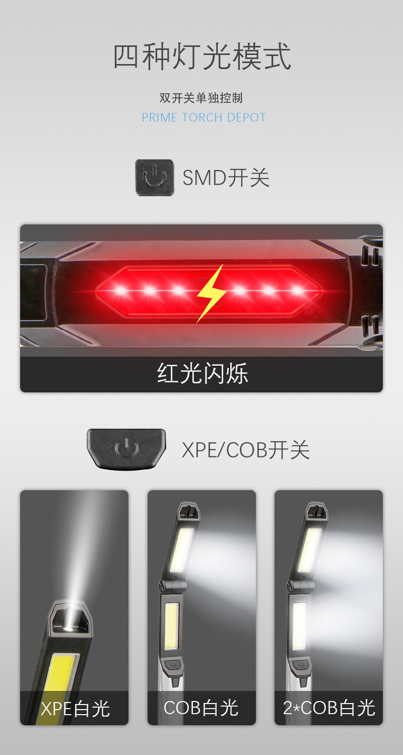 4.功能:XPE100%,COB1/100%.,COB1COB2/100%。红光警示闪(开关单独控制)