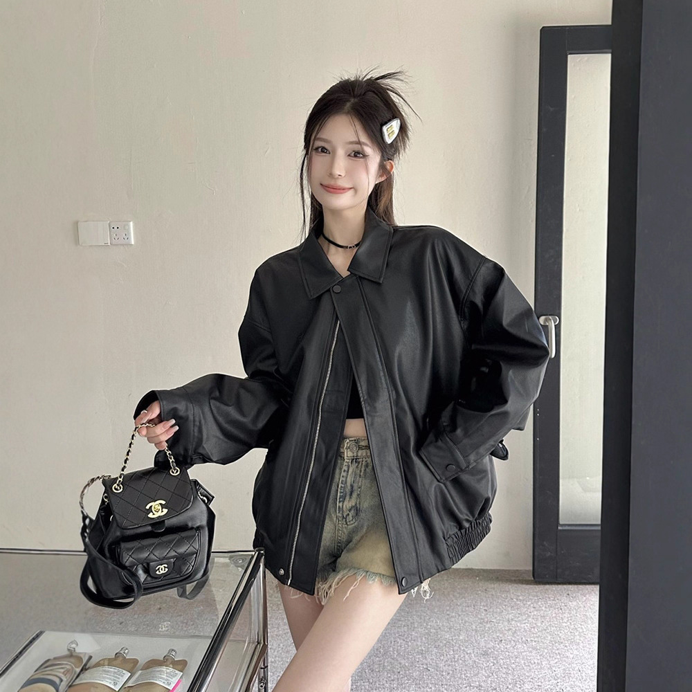 여성을위한 레트로 아메리칸 커피 컬러 가죽 자켓 가을 블랙 달콤한 멋진 오토바이 PU 가죽 느슨한 긴팔 탑