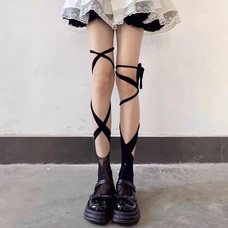 끈이 달린 종아리 중간 레이스 양말 크로스 인 여름 검은색 얇은 귀여운 로리타 jk 일본식 종아리 슬리밍