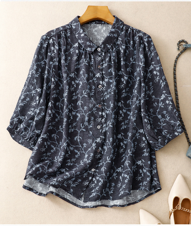 2025년 여름 중년 엄마 예술적 루즈 슬리밍 배 커버 꽃무늬 라펠 7부 소매 셔츠 탑 여성용
