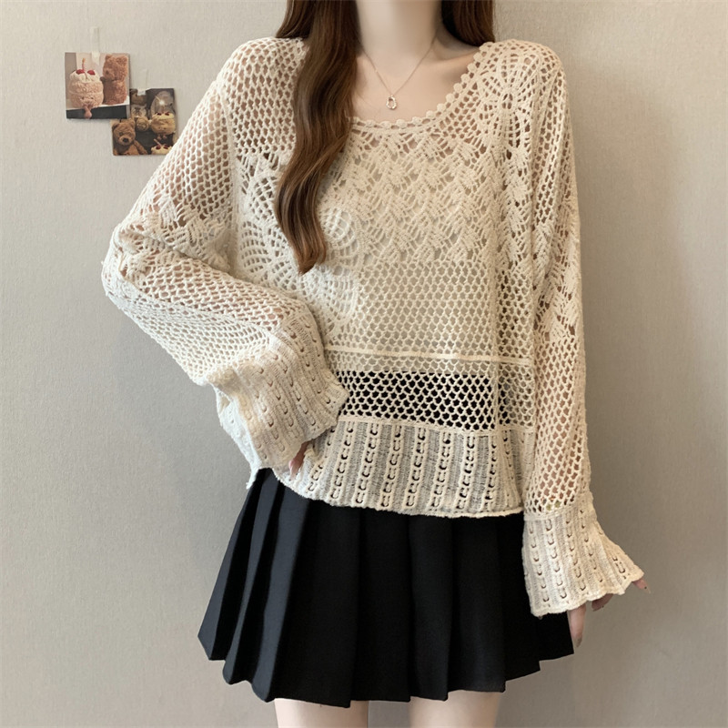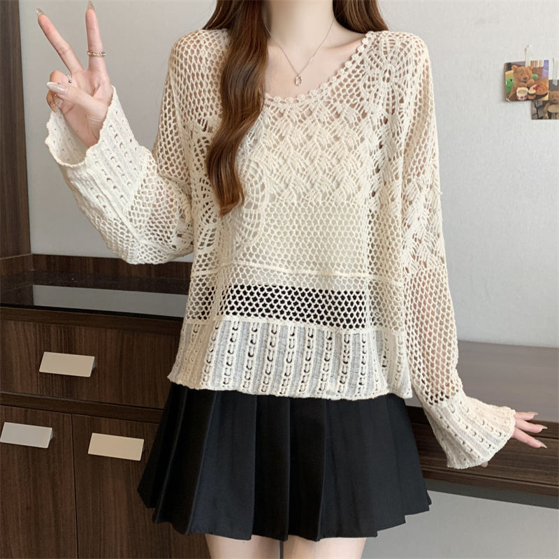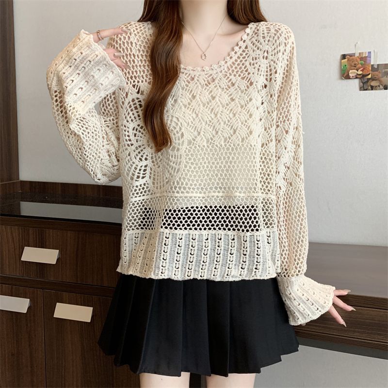 자수 크로 셰 뜨개질 중공 접합 쉬폰 긴팔 자외선 차단 의류 짧은 풀오버 스웨터 여성 2025 여름 새 스타일